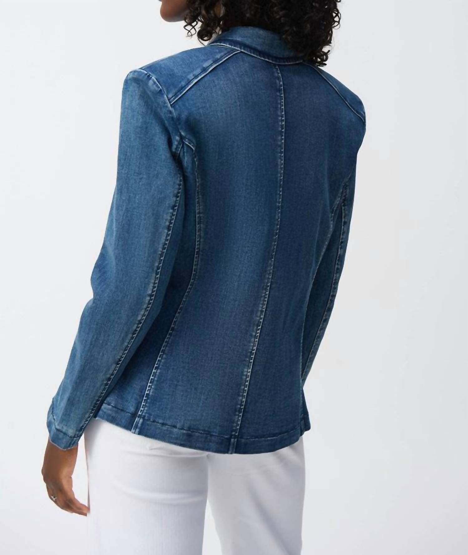 An elevated version of your favorite classic blazer. Introducing the Stretch Denim Double Breasted Blazer by Joseph Ribkoff in a sleek Med. Blue hue, perfect for elevating your workwear wardrobe. With its long straight sleeves, lapel collar, and military-style metal button closure, this piece presents a modern blend of structure and casual flair. Crafted from a notable composition of 72% Cotton, 2% Spandex, 3% Viscose Rayon, and 23% Recycled Polyester, it ensures both comfort and sustainability. Designed for easy care with hand washing in cold water, this blazer is sure to become a staple in your collection.