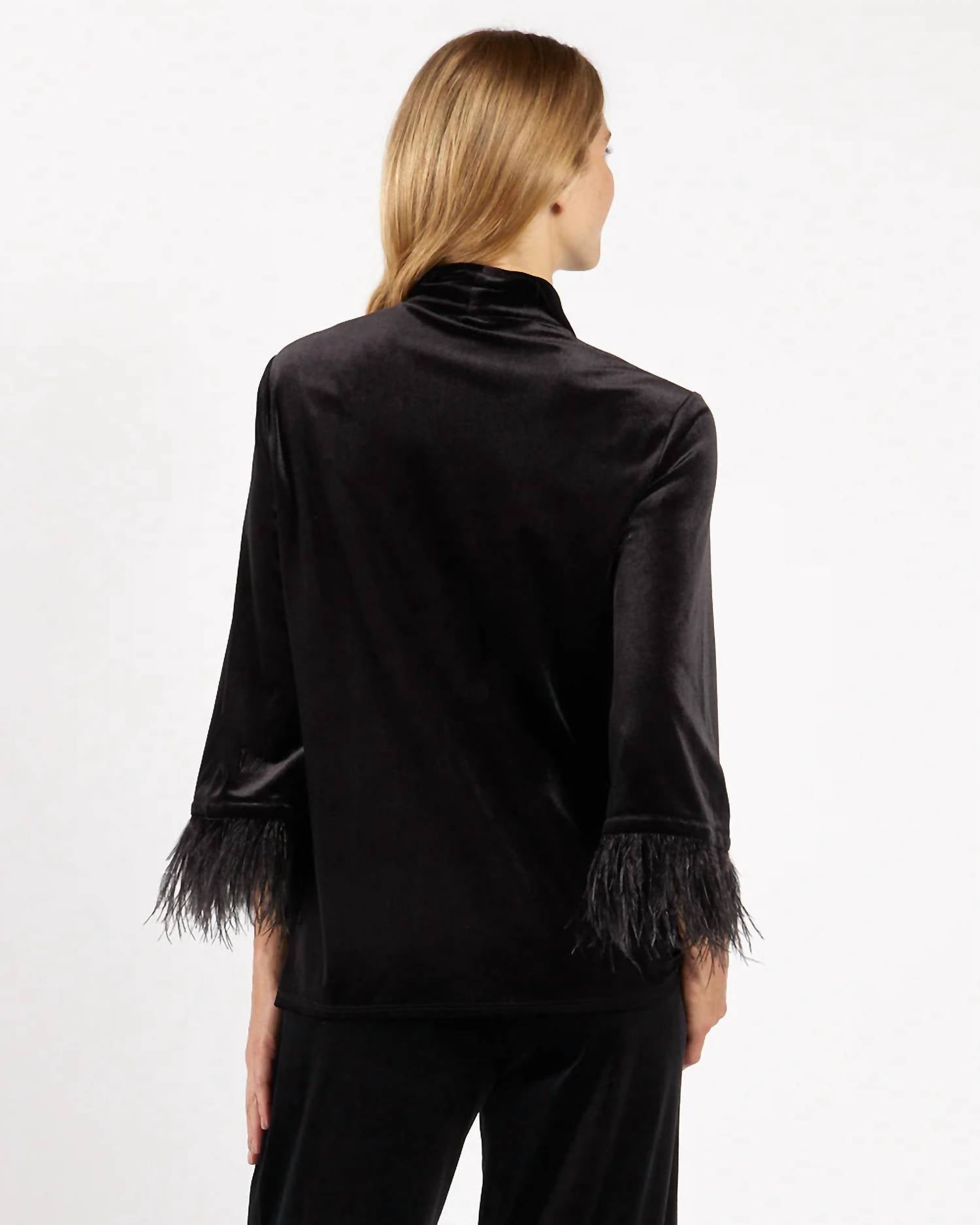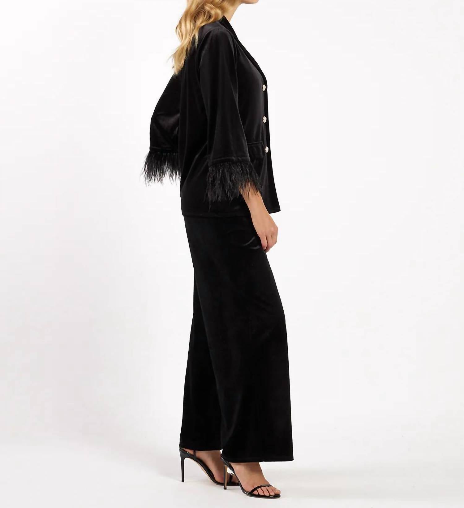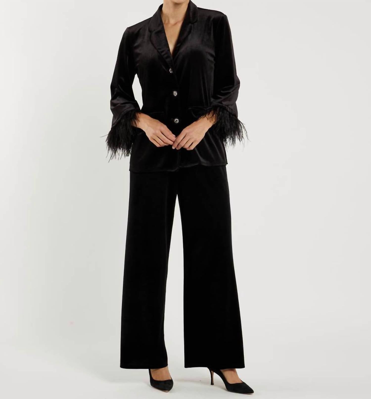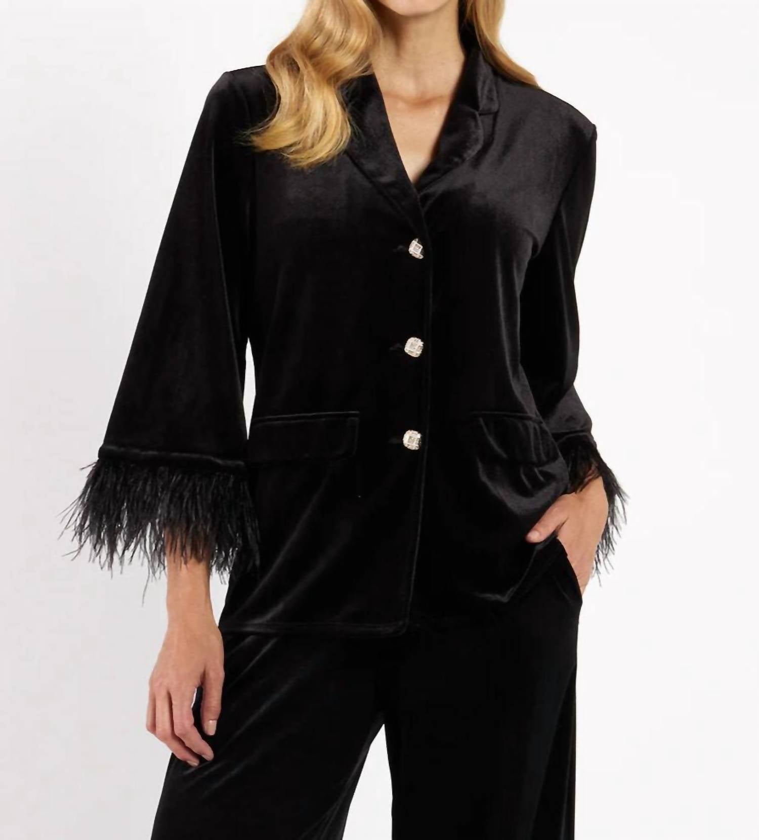 A blazer so versatile you can wear it to the office or pair it with jeans for a more casual look. Introducing the Essie Jacket Stretch Velvet Blazer by Jude Connally, an exquisite addition to your wardrobe in classic black. Crafted with a cotton blend material, this blazer offers a timeless design with long sleeves, a refined silhouette, and luxurious feather detailing at the cuffs. It features a decorative button closure accented with gold and pearlescent shine, measuring 26.5 inches from the top of the center back in size small. Made in the USA, this blazer requires dry clean care and is perfect for elevating any travel or workwear ensemble.