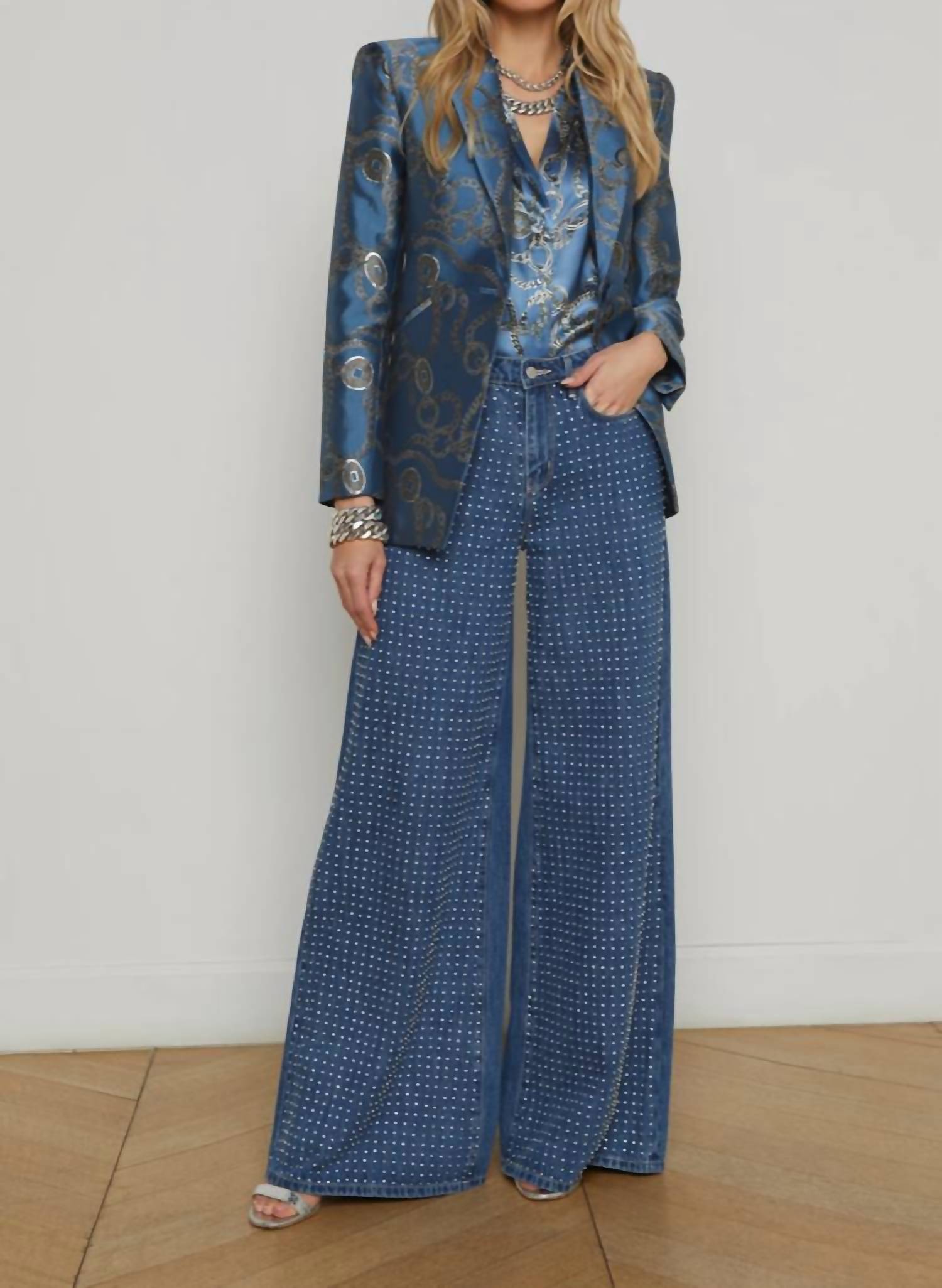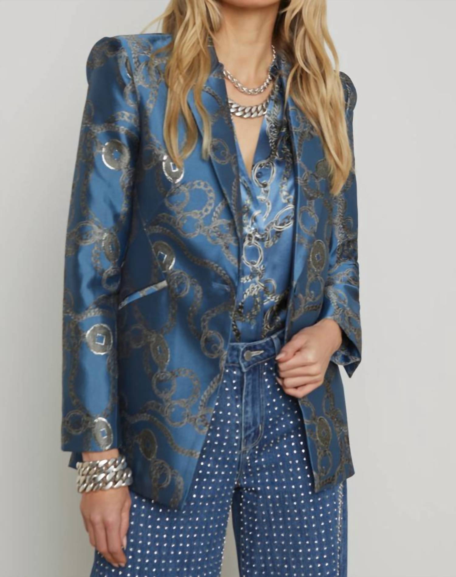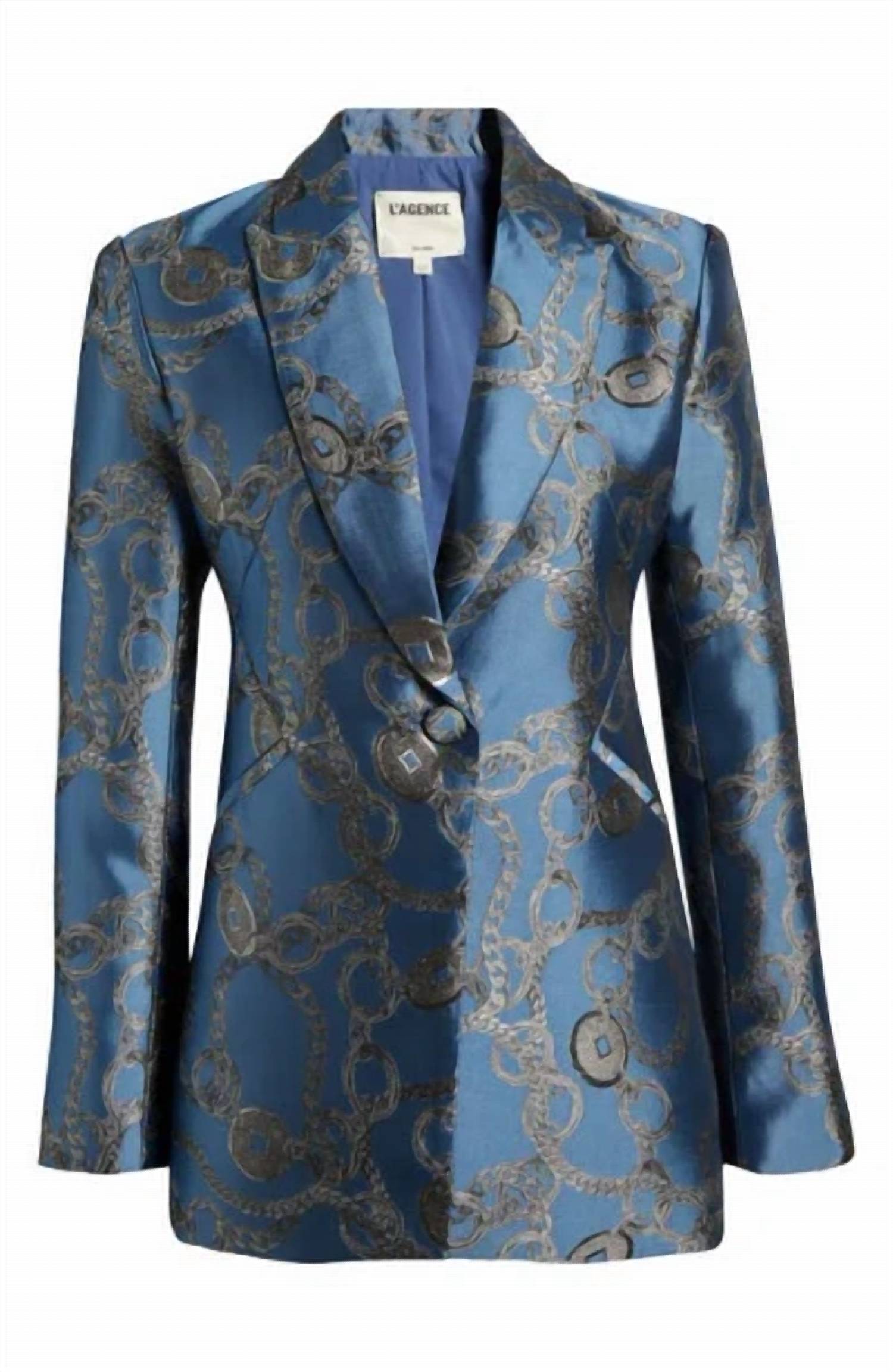 Tailored to perfection, this blazer will be your go-to jacket for years to come. Meet the Sheila Structured Blazer by L'Agence, a sleek and sophisticated piece perfect for evening events or making a statement at New Year's Eve celebrations. This women's blazer features long sleeves and is crafted from luxurious satin jacquard, showcasing a signature chain print for a unique touch. It offers a flattering, slim fit with strong shoulders, welt pockets, and a single-breasted button closure for an elegant silhouette. Fully lined for comfort, this blazer reflects the trend of quiet luxury and should be dry cleaned to maintain its quality.