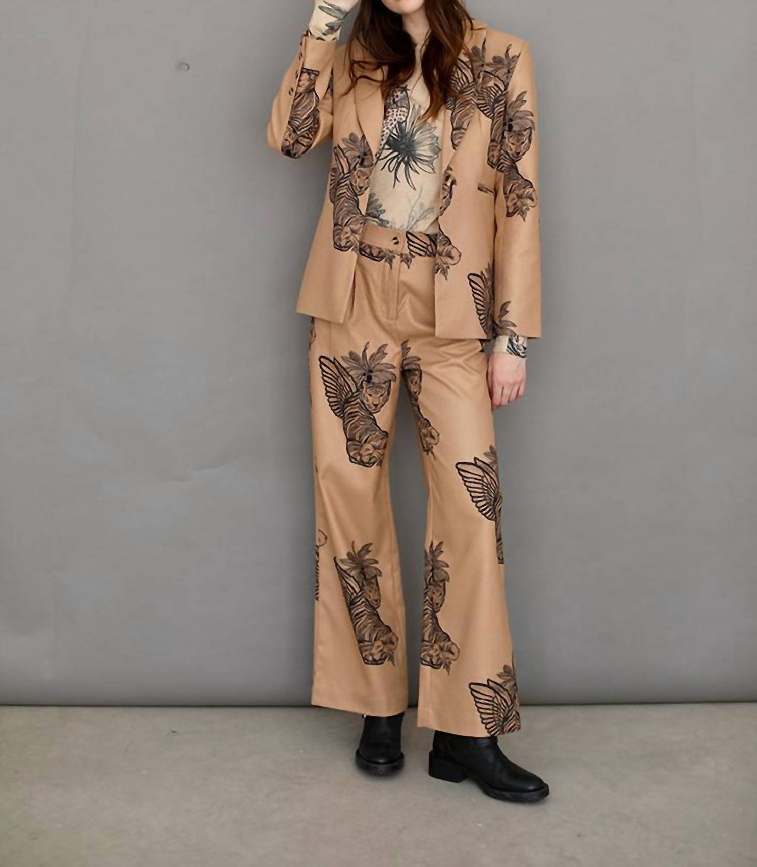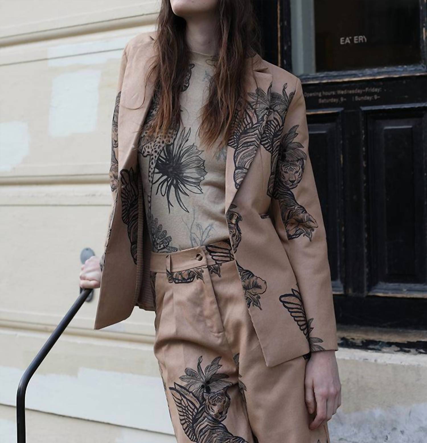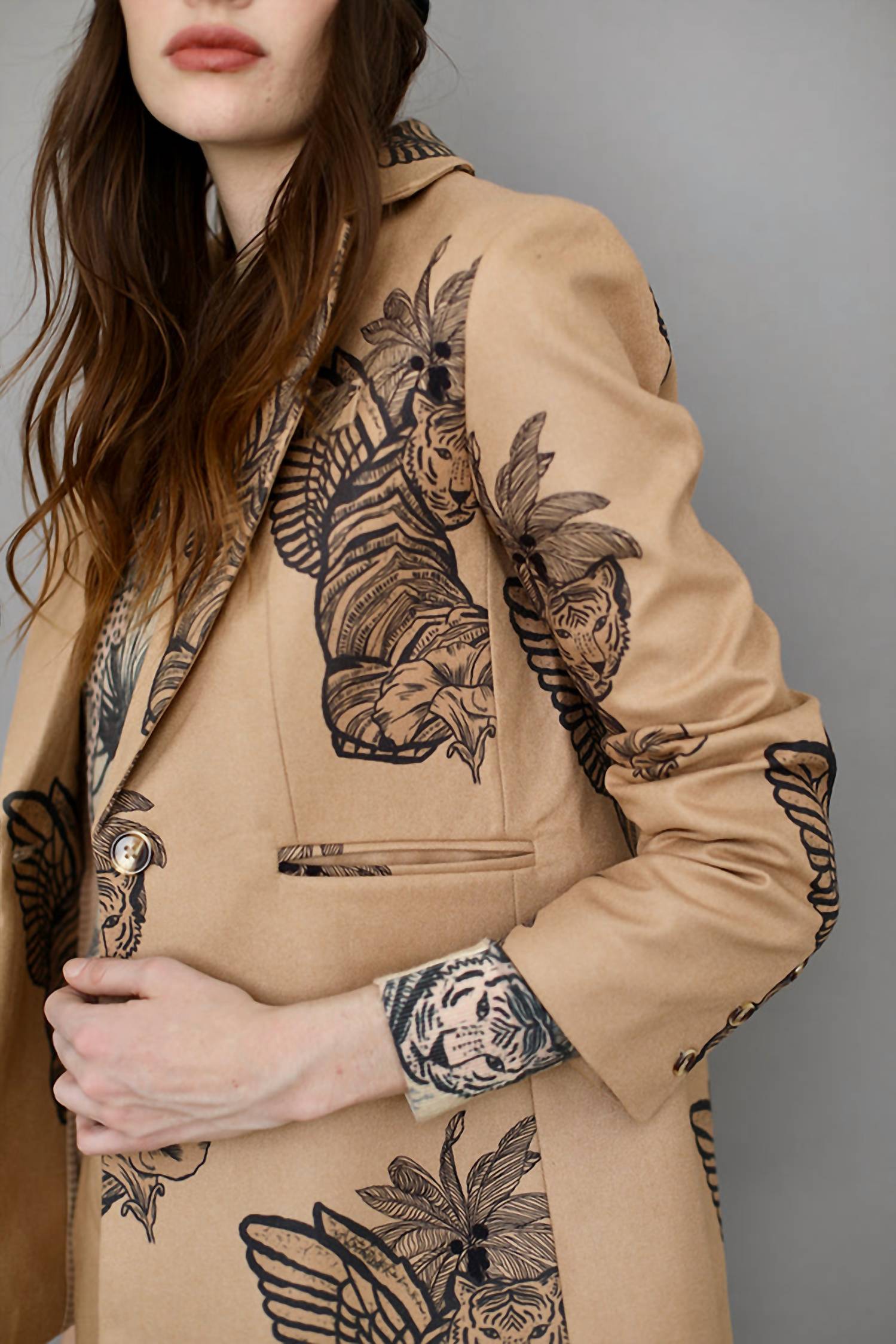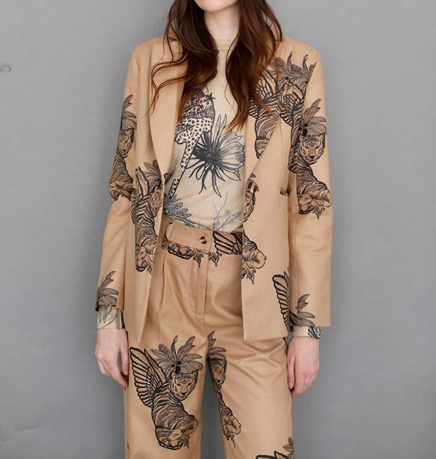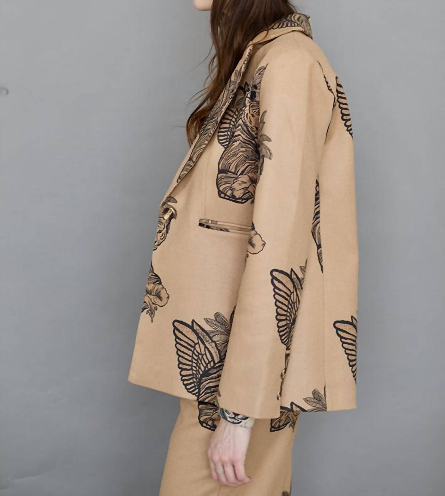A blazer so versatile you can wear it to the office or pair it with jeans for a more casual look. Embrace elegance and warmth with the Las Sureñas Toile De Jouy Wool Blazer in a charming beige. This women's long sleeve blazer features a playful patterned design perfect for the Chinese New Year festivities. Crafted from soft wool, it boasts a button closure and handy pockets for practicality. Made for a relaxed fit, this piece is best cared for with dry clean instructions.