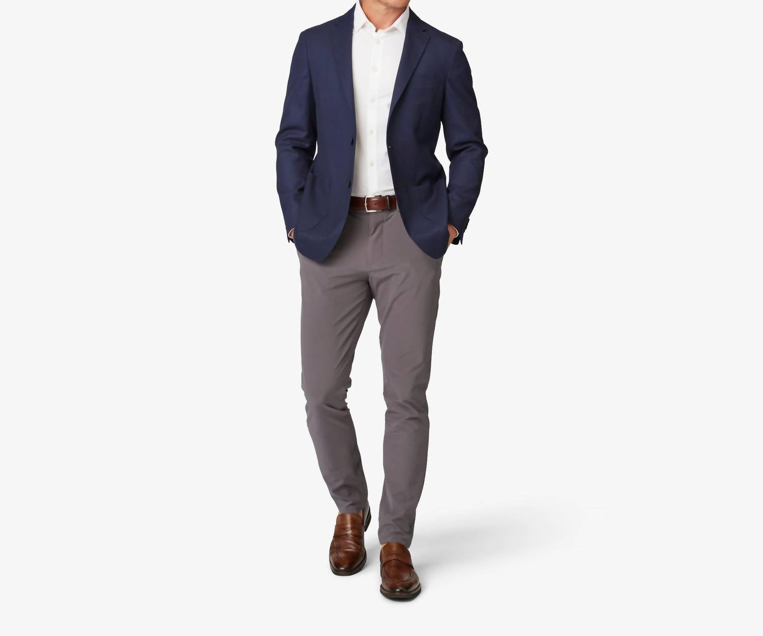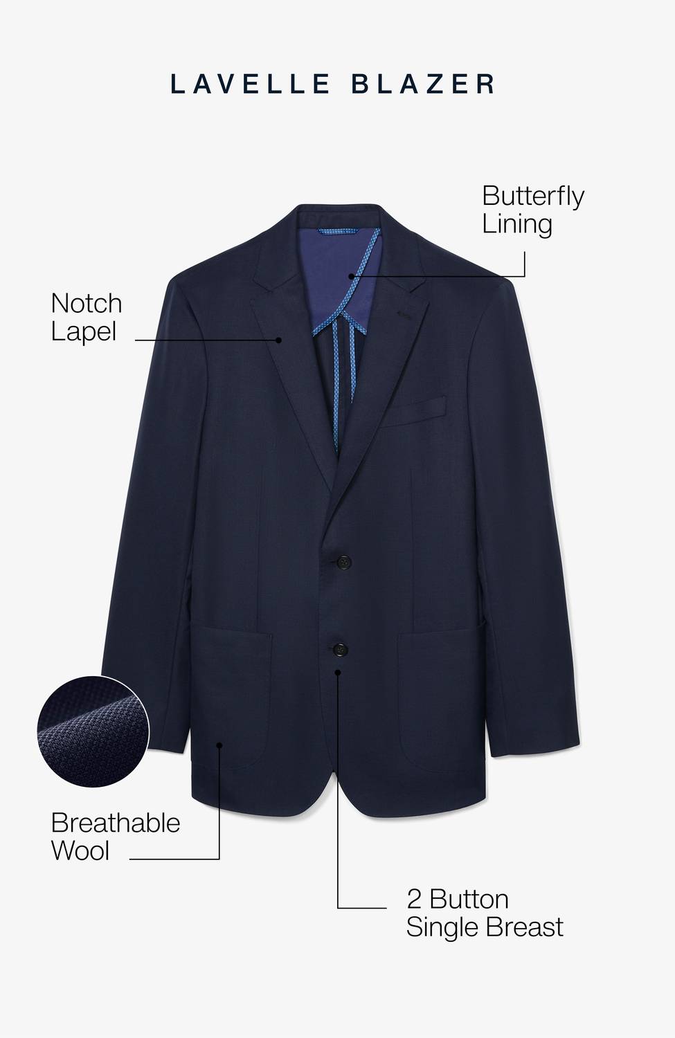 A blazer so versatile you can wear it to the office or pair it with jeans for a more casual look. Introducing the Mizzen + Main Lavelle Blazer, a sophisticated addition to any dinner party ensemble. This navy blue sportcoat features long sleeves, a notched lapel, and a 2-button single breast closure, providing superior comfort stretch and ultimate breathability with cooling technology. Crafted from a textured hopsack weave composed of 96% wool and 4% spandex, it's partially lined for added structure. Designed with patch pockets and a double rear vent for functionality, this regular-length blazer requires dry cleaning to maintain its superior form.
