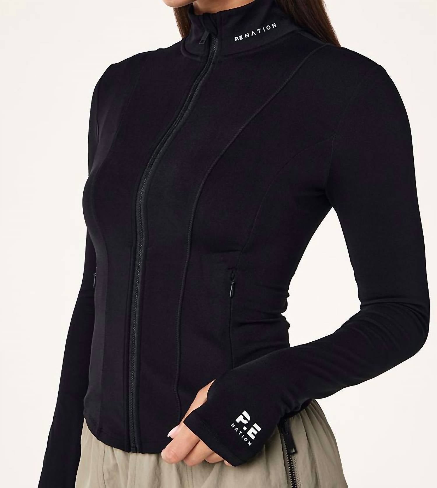 An elevated version of your favorite classic blazer. Introducing the BREAKTHROUGH JACKET by P.E. NATION, a fitted activewear essential perfect for training or running. This solid black women's jacket features long sleeves with thumb hole openings, a zip front closure, and zip-up pockets for convenient storage. Crafted from an 82% Nylon and 18% Elastane blend, it showcases a contrast silicon print logo at the left sleeve hem and collar. Care: Machine wash cold at a maximum of 30°C, line dry in the shade, and avoid tumble drying to maintain its lightweight Active Lite fabric.