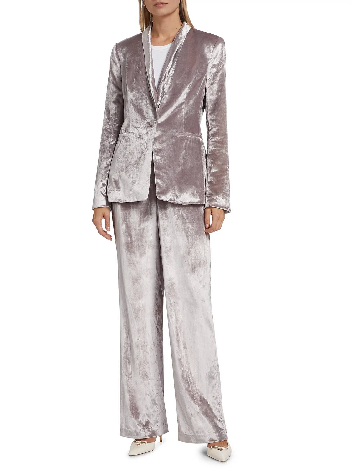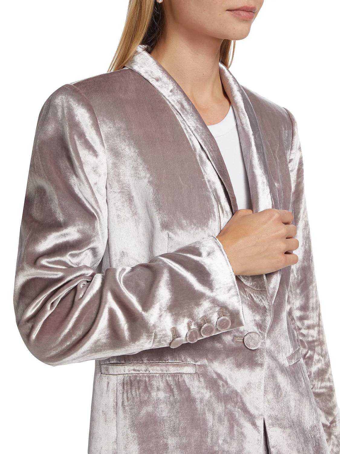 A blazer so versatile you can wear it to the office or pair it with jeans for a more casual look. Elevate your evening ensemble with the Kriselle Velvet Blazer by Paige, crafted in sumptuous pewter velvet. This piece features long sleeves with button cuffs and elegant shawl lapels for a polished look. Its composition is 76% viscose and 24% nylon, with a classic button closure. Measuring approximately 28.5 inches from shoulder to hem, it includes front welt pockets and requires dry cleaning.