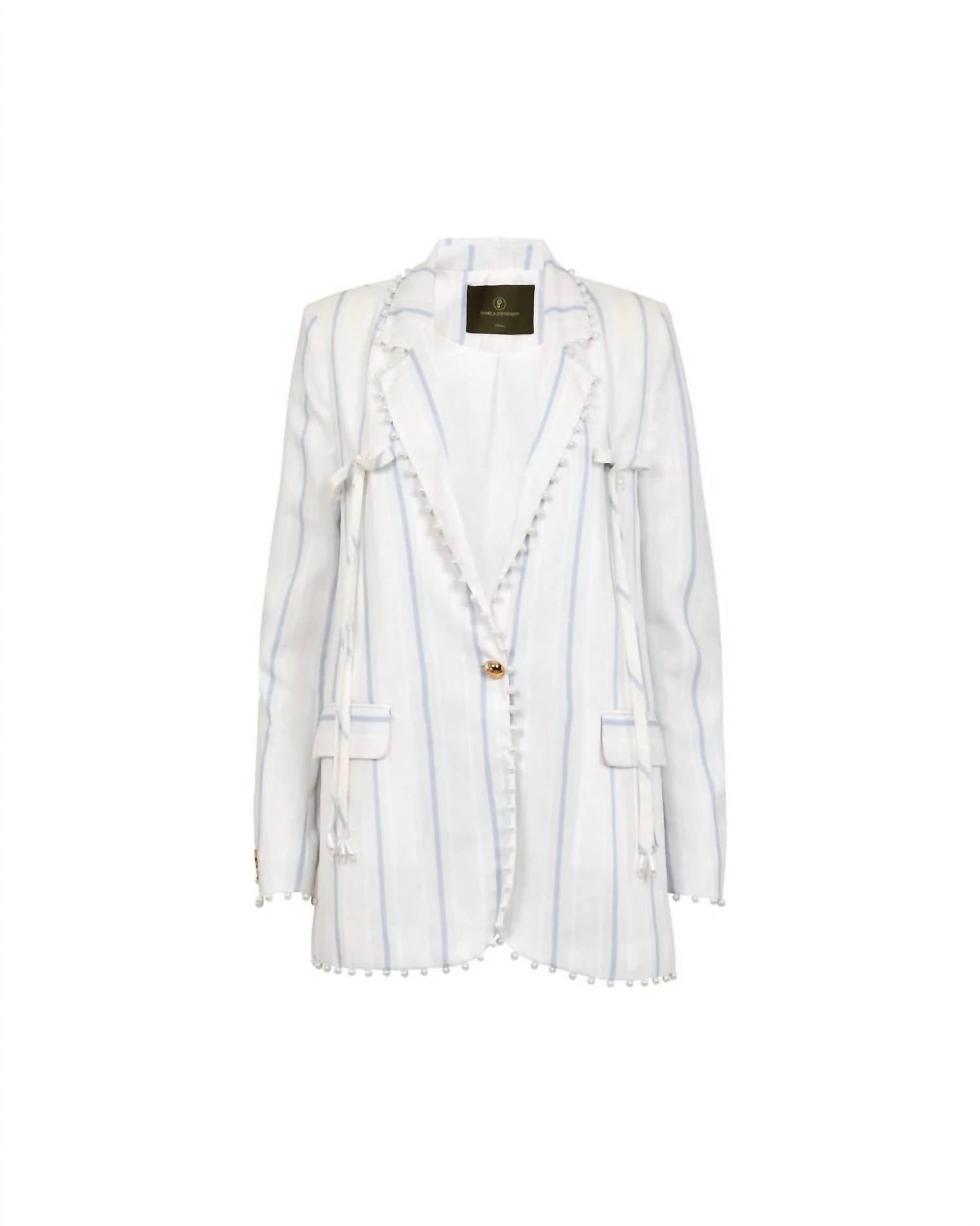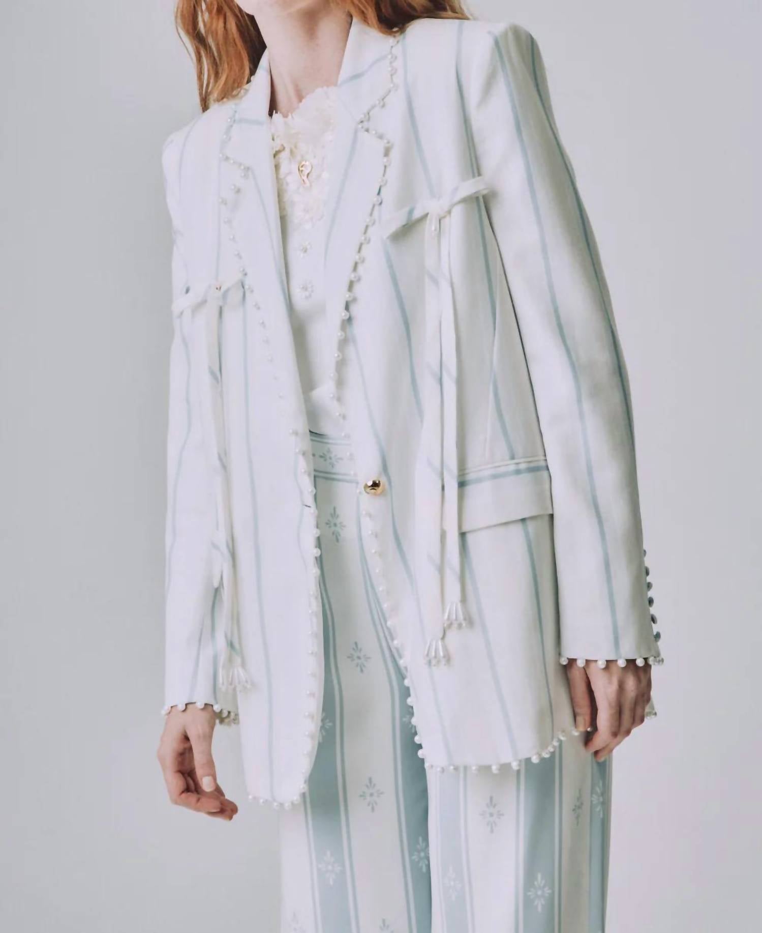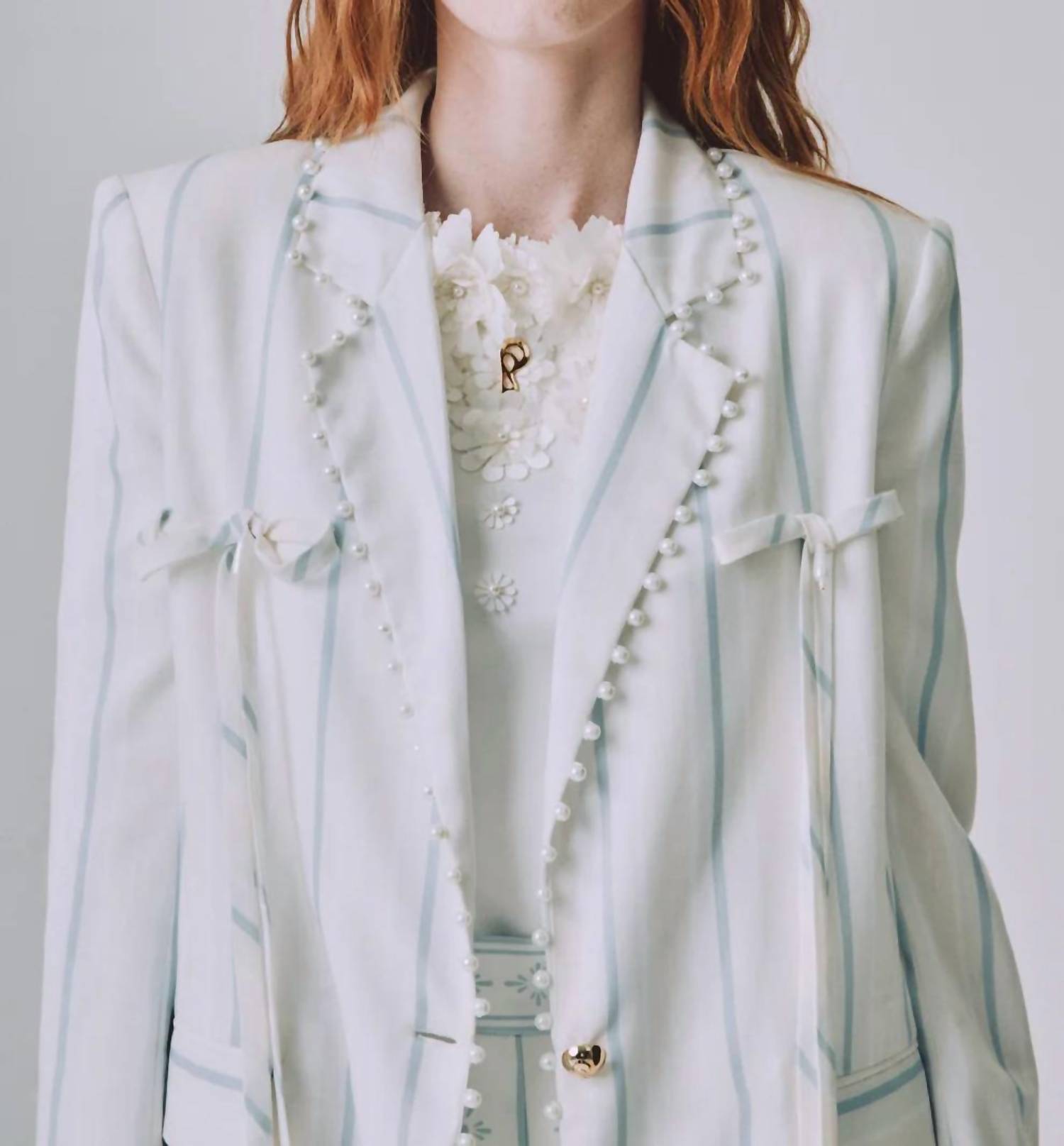 Tailored to perfection, this blazer will be your go-to jacket for years to come. Elevate your wardrobe with the Donna Pearl Trimmed Blazer by Pamela Stevenson, designed for women seeking a maximalist touch. This striped blue blazer features long sleeves and is crafted from a fine cotton-linen blend, enriched with pearl trims and gold logo buttons for added elegance. Closure: Button closure. Care: Dry clean only. Perfect for summer vacations or making a statement with a matching set.