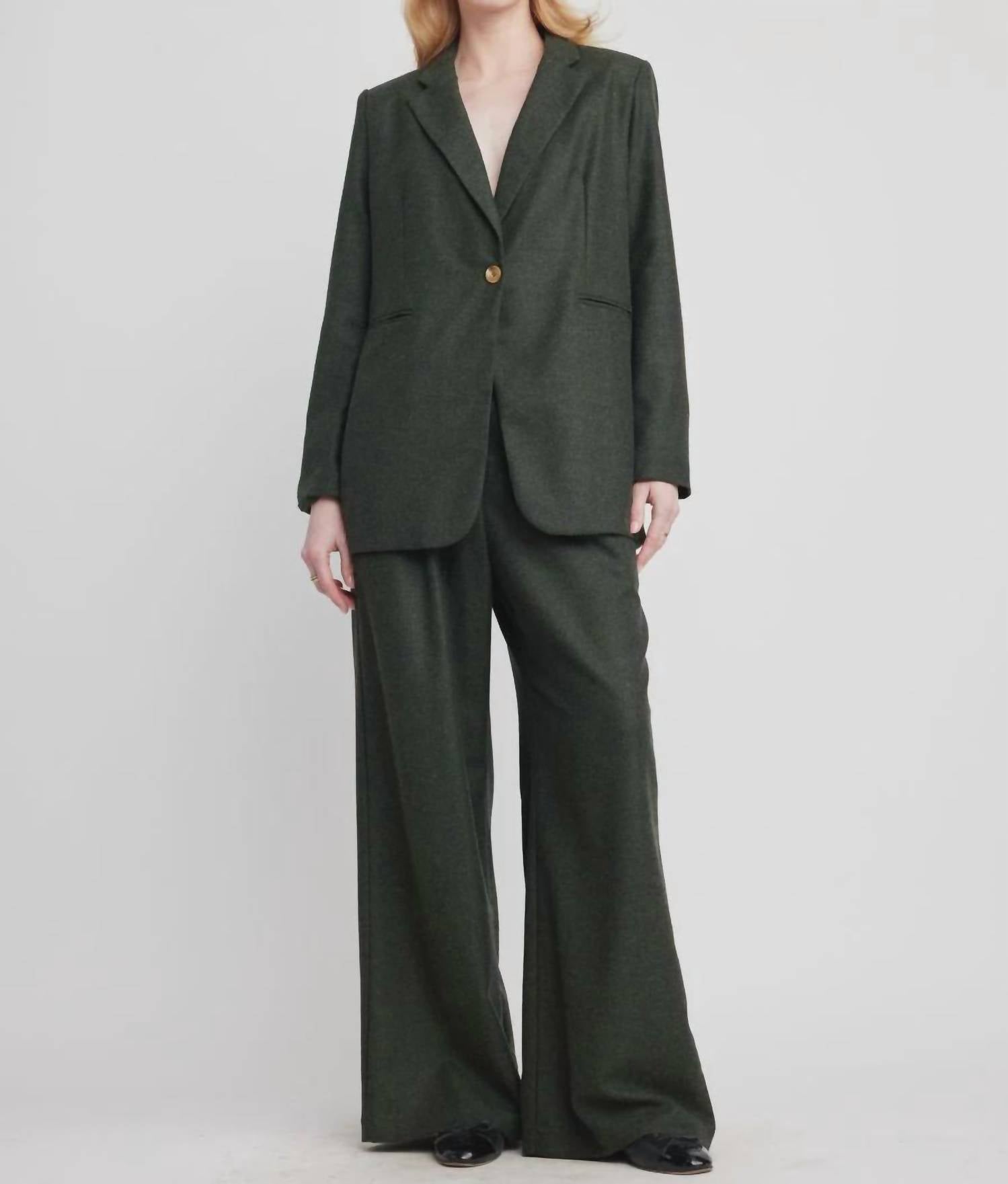 An elevated version of your favorite classic blazer. Embrace effortless sophistication with the Bridget Single Button Blazer by Self Contrast, a modern twist on a timeless piece in a chive hue. This women's blazer, perfect for engagement or workwear occasions, features long sleeves and a structured design with a single-button closure and flap pockets. Crafted from a wool blend of 50% wool, 35% polyester, and 15% viscose, it is fully lined for a polished finish. Ideal for fall, this versatile blazer elevates both formal and casual looks with ease.