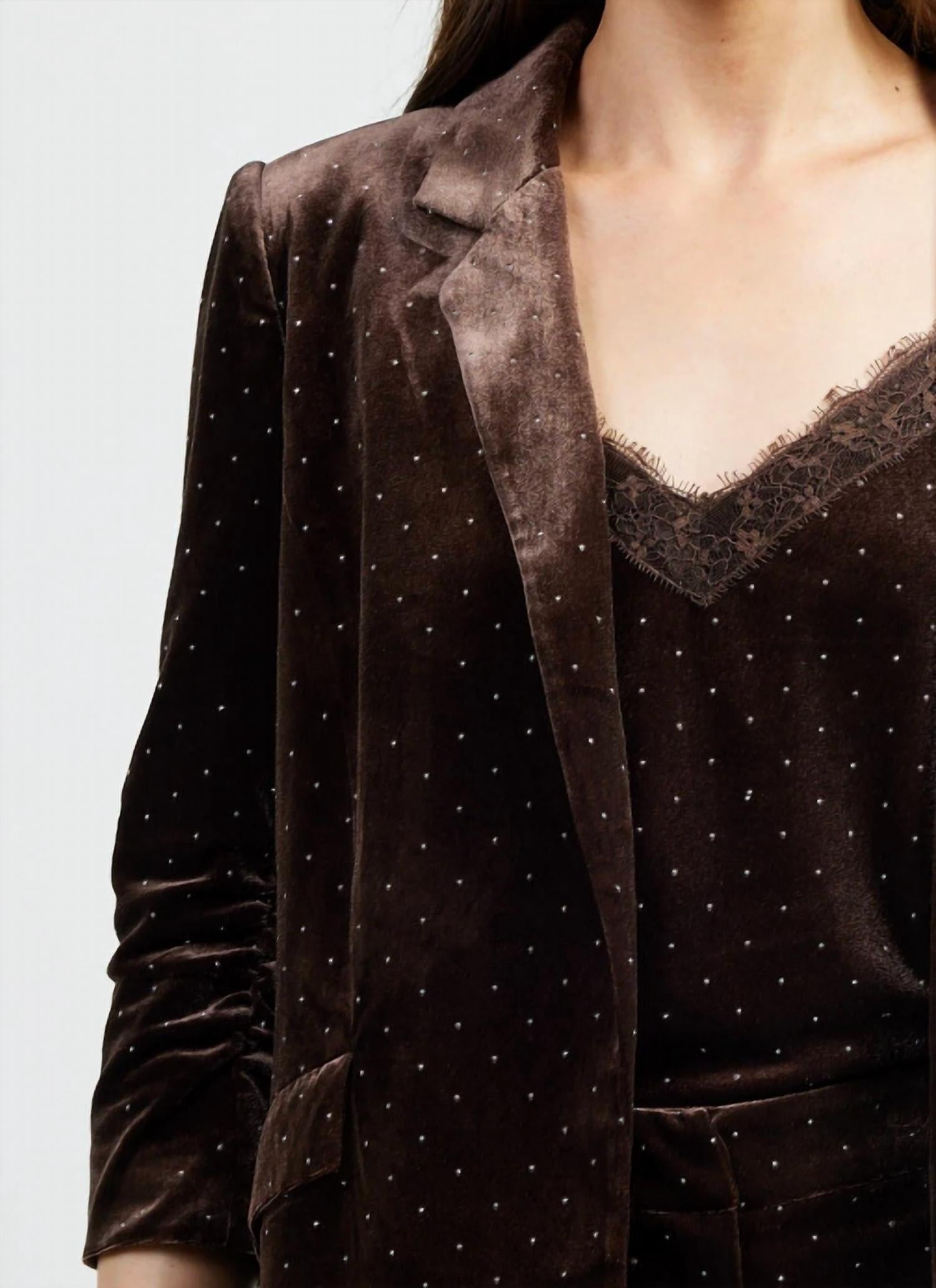 A blazer so versatile you can wear it to the office or pair it with jeans for a more casual look. Elevate your workwear with the Roma Studded Velvet Blazer by SKIES ARE BLUE, crafted from luxurious polyester in a rich brown hue. This statement piece features long shirred sleeves, a practical open front design, and refined notched lapels. Adorned with petite rhinestones, it combines subtle shimmer with the classic touch of functional flap pockets. Closure is pull-on, and it is recommended to dry clean this garment for optimal care.