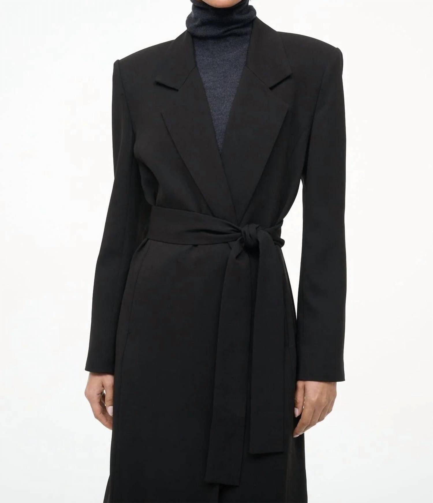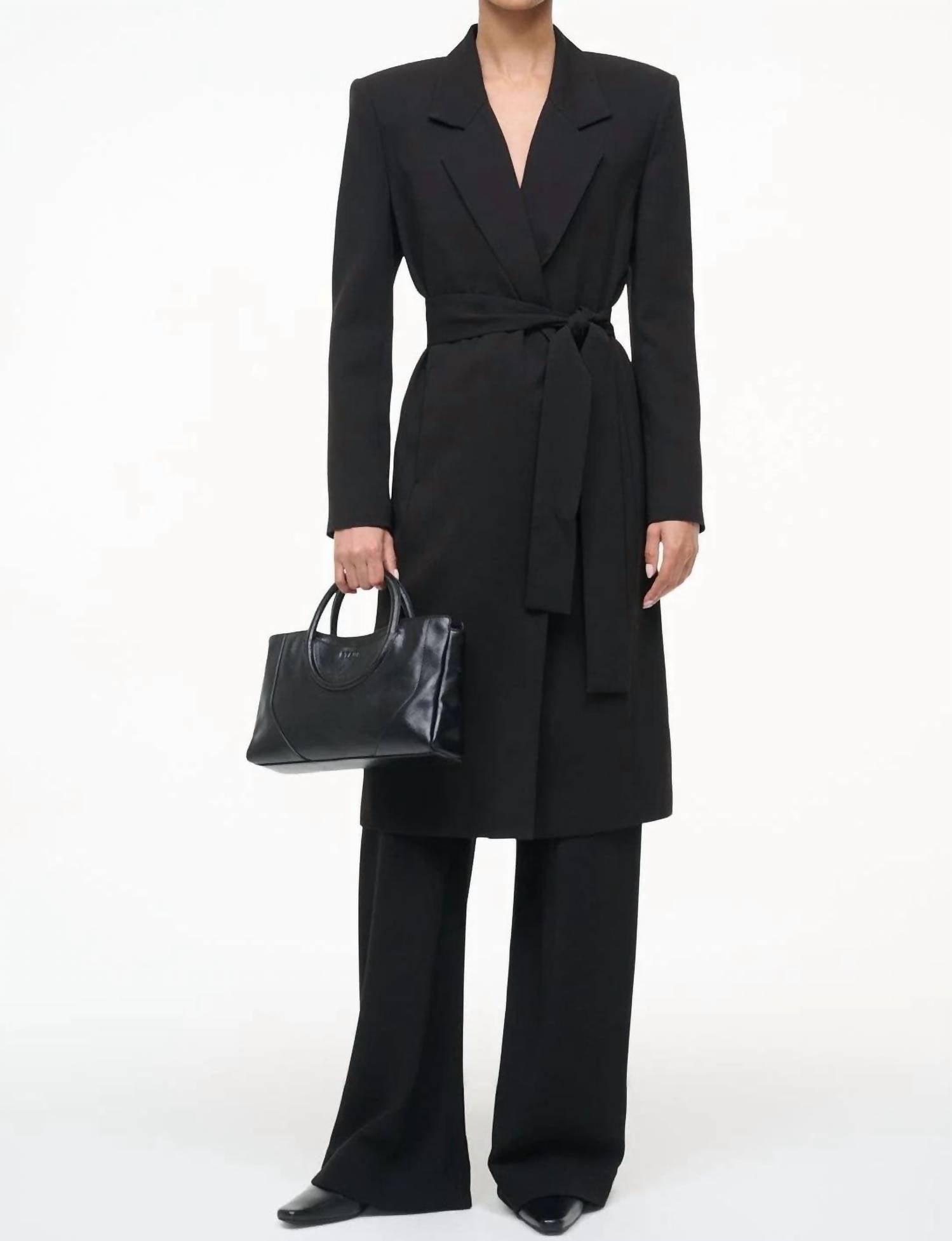 Tailored to perfection, this blazer will be your go-to jacket for years to come. Elevate your winter wardrobe with the Jolene Knee-length Wrap Jacket from STAUD, a chic addition to any minimalist collection. This black jacket features structured shoulders, a sophisticated notched lapel, and a stylish self-tie belt, complemented by a snap closure. Crafted from 70% acetate and 30% polyester, with a 100% polyester lining, this piece ensures both durability and comfort. Care: Dry clean only. It measures 43.5" in length for a size small, perfect for those travel occasions.