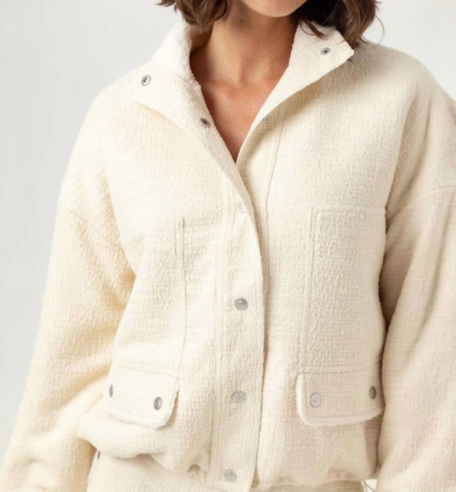An elevated version of your favorite classic blazer. Introducing the Dreya Jacket by Sundays, a chic and functional outerwear piece in a serene Coconut Milk hue. Crafted from a luxurious blend of 58% cotton, 37% polyester, and 5% spandex, this long-sleeve jacket is thoughtfully designed with a snap-front closure for versatility and a fully sherpa-lined interior for added warmth. Made from a textured knit bouclé, it features functional patch pockets and an elastic drawcord at the hem, allowing for an adjustable fit. Care is effortless with machine wash cold and tumble dry instructions, keeping your jacket looking pristine season after season.