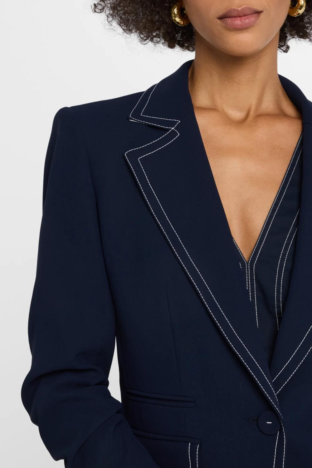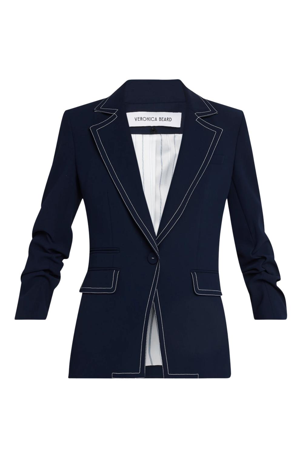 A blazer so versatile you can wear it to the office or pair it with jeans for a more casual look. Introducing the Battista Dickey Jacket by Veronica Beard, a modern twist on the classic blazer in a sophisticated navy hue. This women's blazer features long, ruched sleeves with button cuffs and a single-breasted design, offering both style and versatility with its opalescent button closure and various pockets. Crafted with a 100% polyester lining, it provides a comfortable, elongated fit perfect for any professional setting. Please note, this blazer is dry clean only to maintain its impeccable quality.