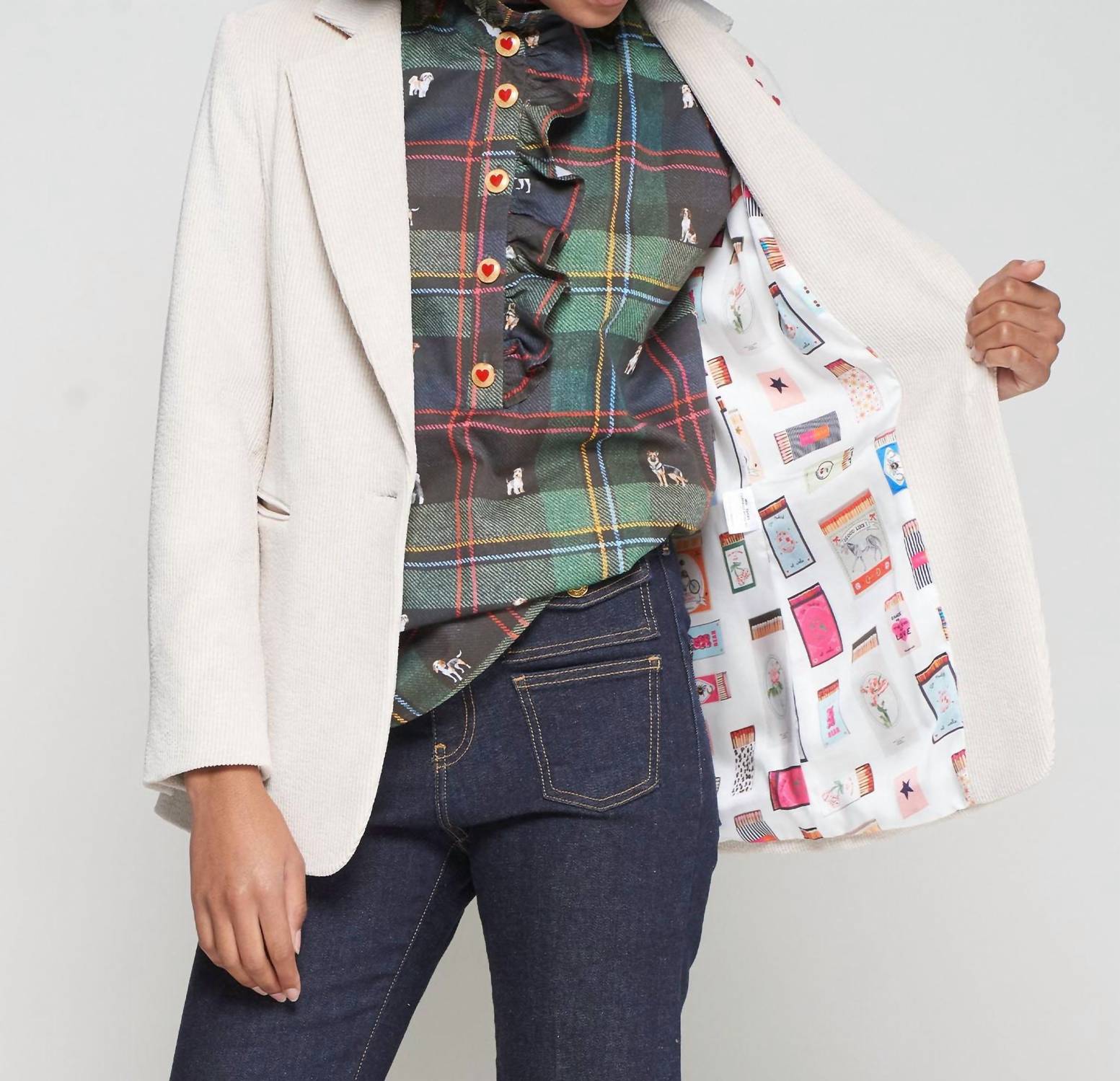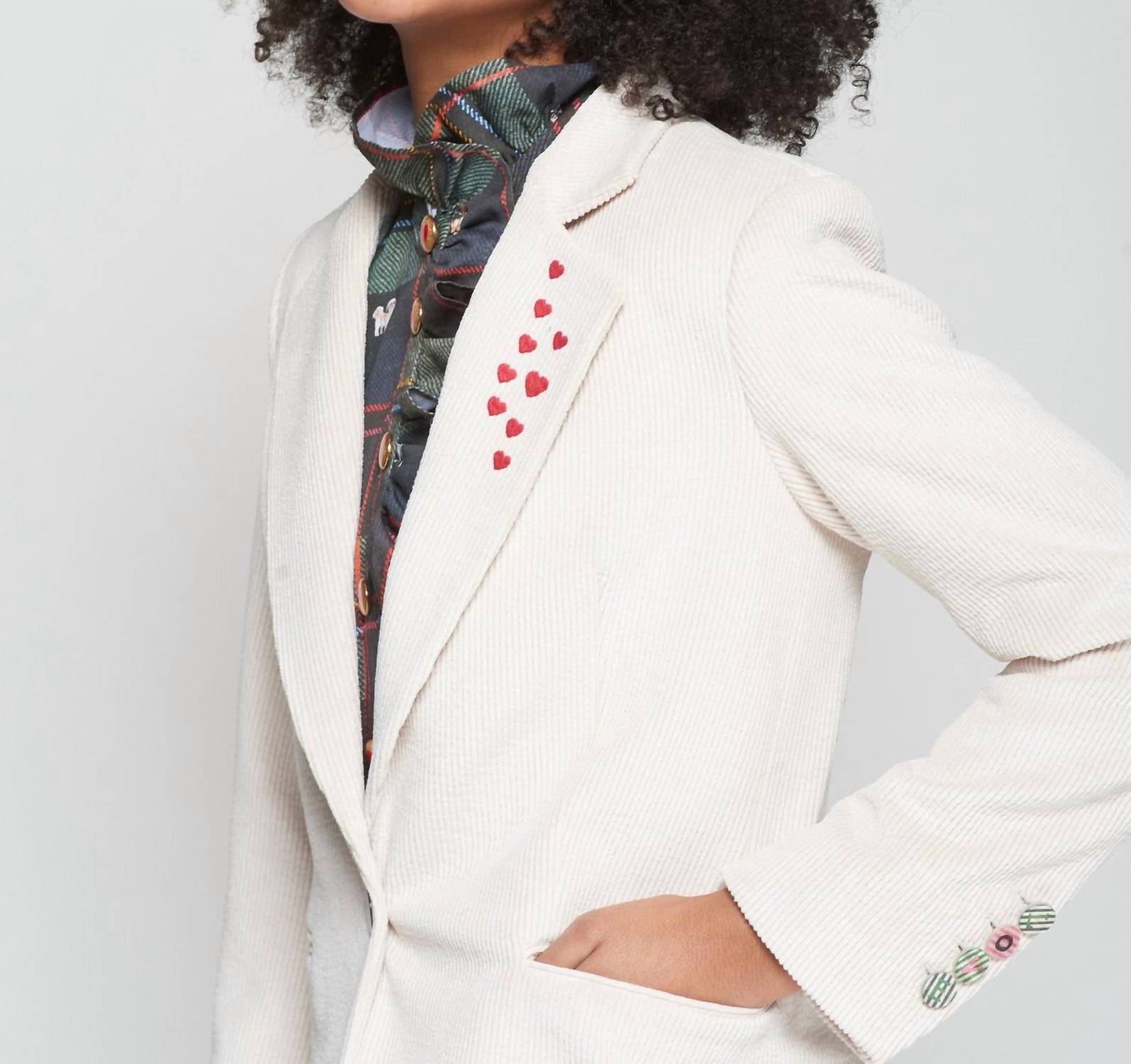 Tailored to perfection, this blazer will be your go-to jacket for years to come. Meet the Ribbed Corduroy Blazer by Vilagallo, a sophisticated piece in elegant ecru perfect for elevating your spring ensemble. This women's blazer features long sleeves and a button closure, making it a tailored addition to any workwear collection. Crafted from a textured blend of 85% Polyester, 12% Nylon, and 3% Elastane, it adds a touch of artistry with its striking embroidered details. Care is simple with machine wash instructions, ensuring your statement piece stays in pristine condition for every occasion.