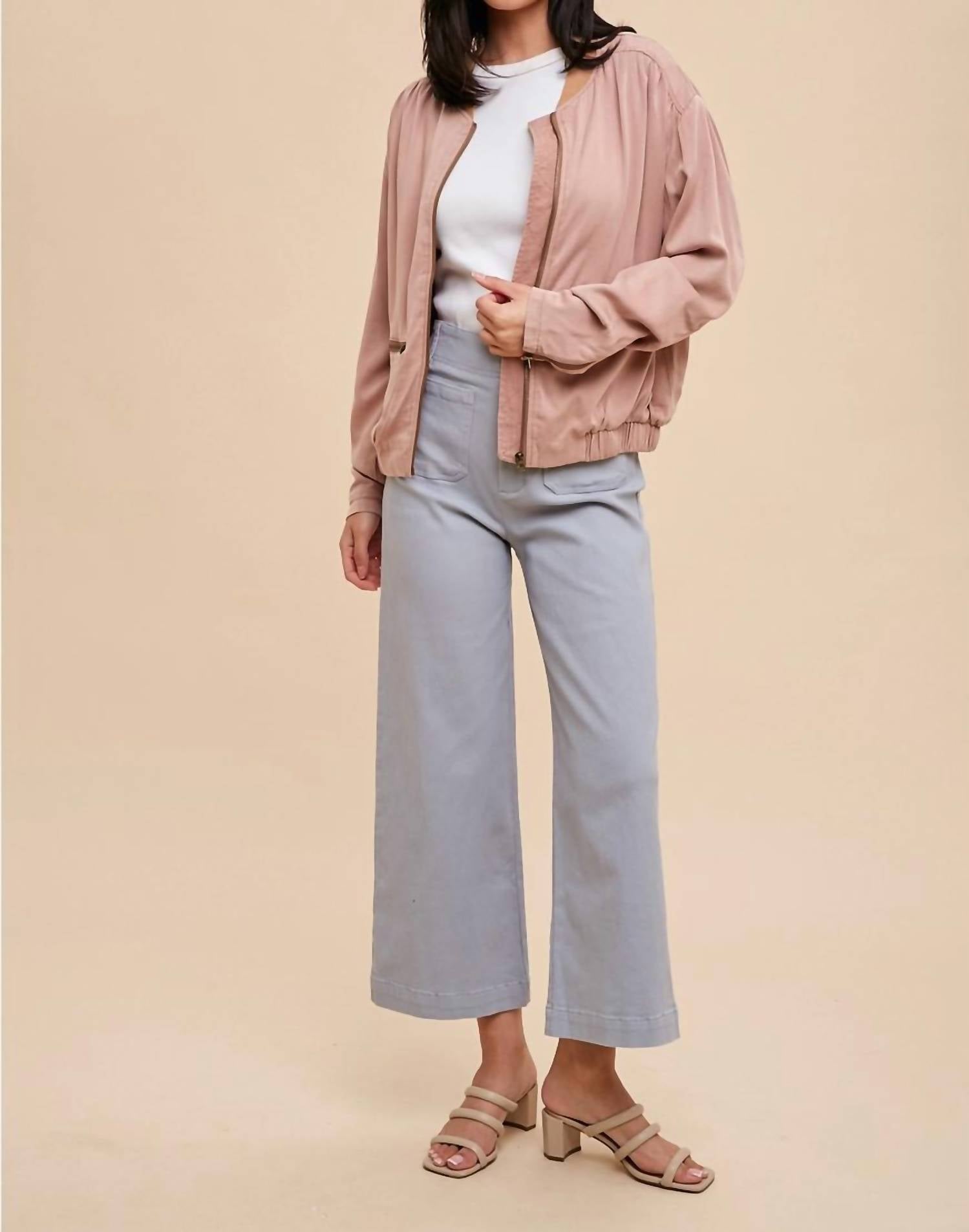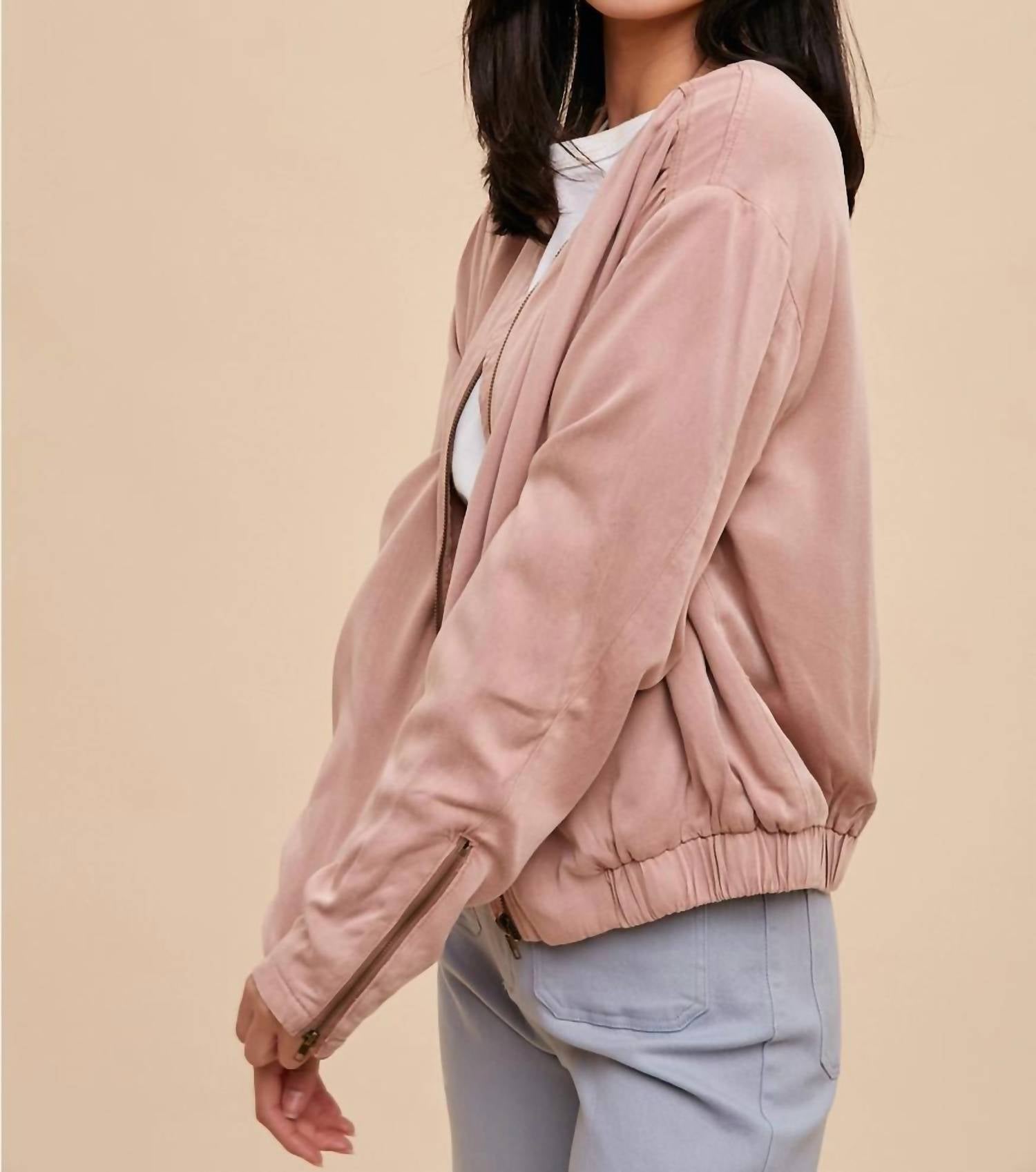 A riff on your favorite classic bomber jacket. Stone washed tencel bomber jacket featuring fully functional zippered pockets, elastic bottom banding, fully lined bodice and sleeves, and zippered sleeve ends.