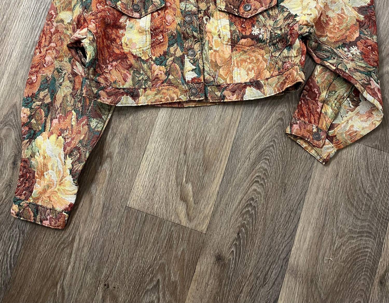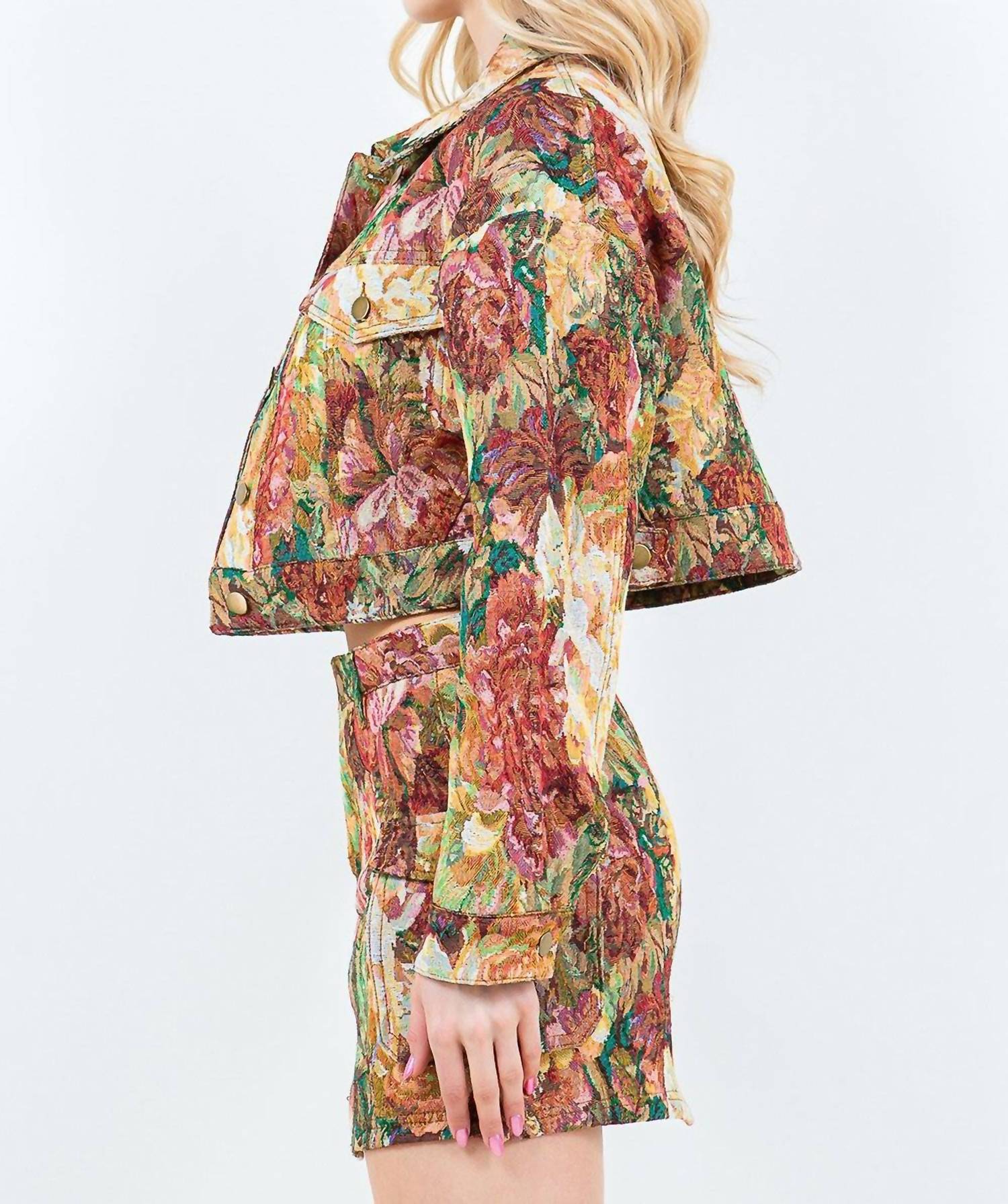 A riff on your favorite classic bomber jacket. Embrace seasonal elegance with the Autumn Jacquard Crop Jacket by American Bazi, crafted for women with a floral pattern in a vibrant multi-color scheme. This sophisticated bomber jacket features long sleeves and a chic collar neckline, perfect for adding flair to your fall wardrobe. Composition: 80% Polyester, 20% Cotton. Closure: Button closure. Care: Machine wash, tumble dry.