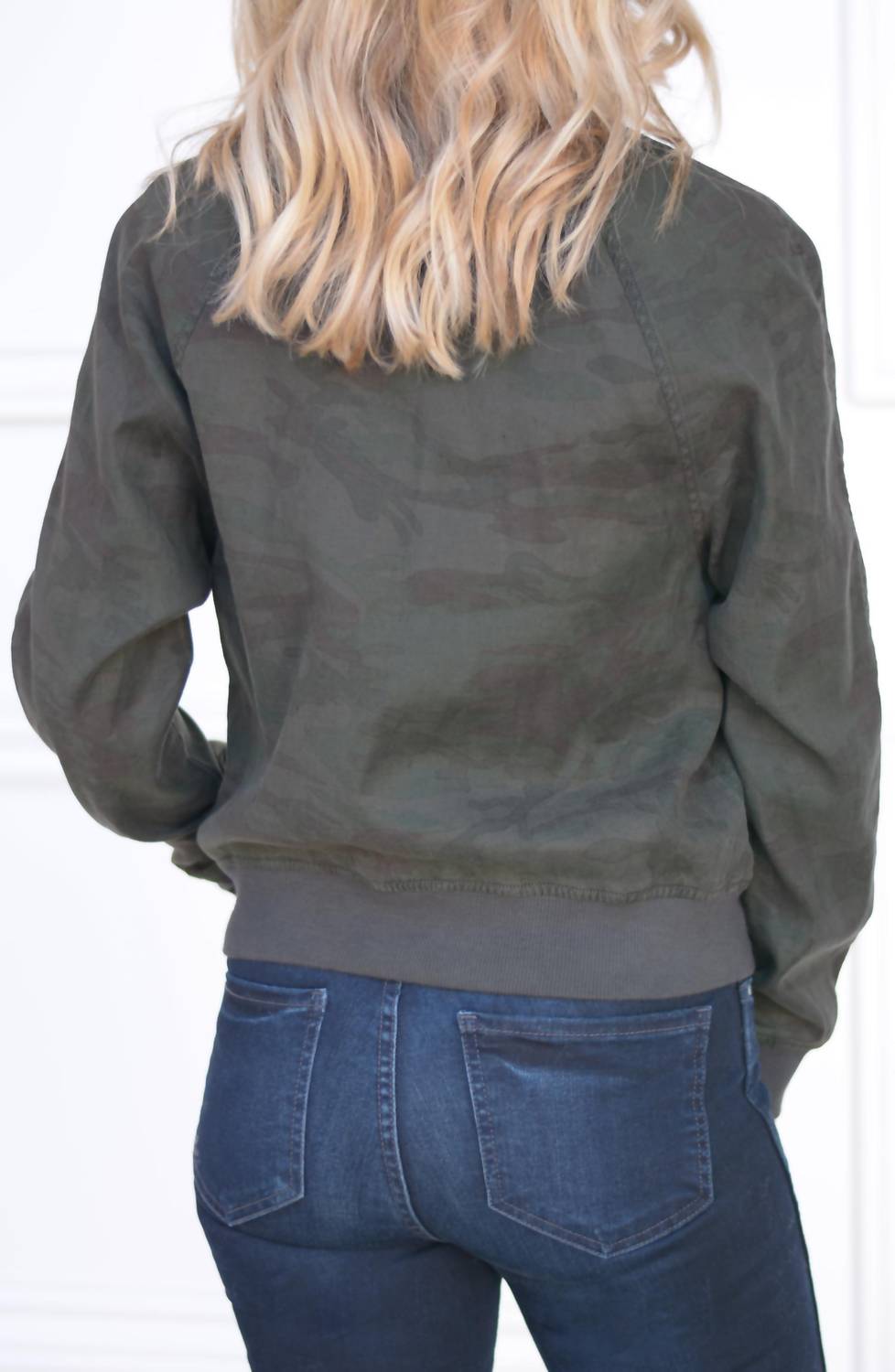 Details:Ribbed collar, cuffs, and hemlineFull front zipperTwo side zipper pocketsRelaxed fit through bodiceDark midnight camo printSoft linen tencel materialUnlinedPerfect for the office or the weekendModel Details:Height: 5'4"Bust: 32"Waist: 26"Hips: 32"Wearing size XSCare Instructions:Hand wash cold or gentle cycle, inside outWash with like colorsDo not bleachTumble dry low, remove immediatelyLow iron if needed