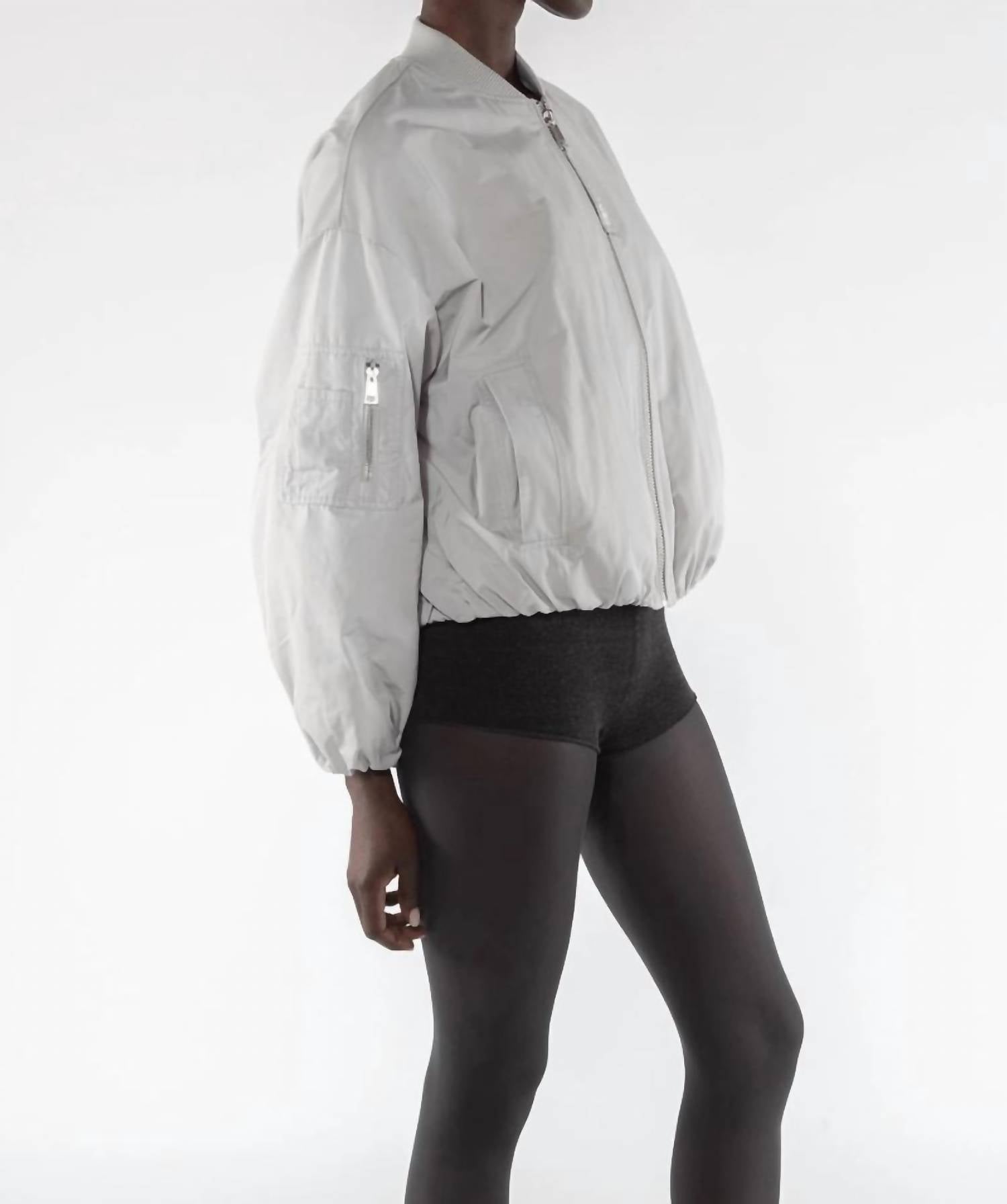 Make any outfit instantly cool by pairing it with this bomber jacket. Elevate your fall wardrobe with the Memory Nylon Bomber Jacket by OOFWEAR in Digital Grey, tailored for women seeking minimalist style. This bomber jacket features long sleeves, a ribbed collar, and a zip-up utility pocket, offering both functionality and chic design. Crafted from water-repellent memory nylon and fully lined with 100% polyester, it ensures durability and comfort. Closure: Visible zip front with an embroidered logo puller. Care: Machine washable for easy maintenance.