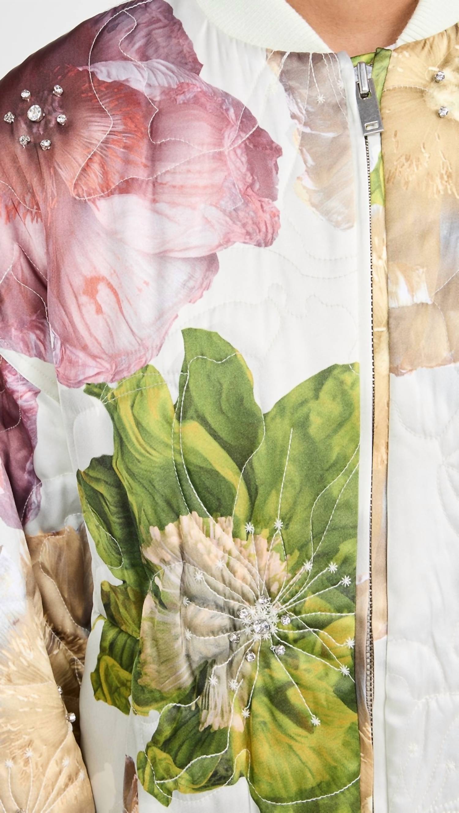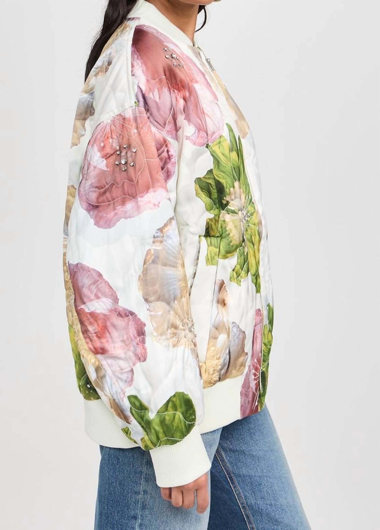 A riff on your favorite classic bomber jacket. Elevate your wardrobe with the STINE GOYA Norea Bomber Jacket in the vibrant Poppies Bloom pattern. This long-sleeve design offers a mock neck and ribbed knit edges, blending floral print with exquisite embroidered detailing and crystal embellishments. Crafted from 100% heavyweight, non-stretch viscose, it features a practical zip closure and slant front pockets for added convenience. Originating from China, this jacket measures 26.75 inches in length and requires dry cleaning to maintain its luxurious appeal.