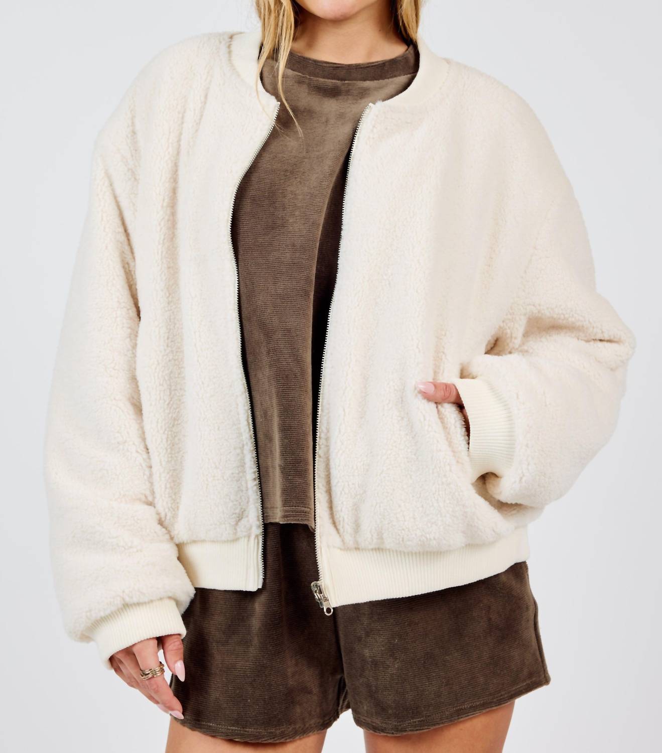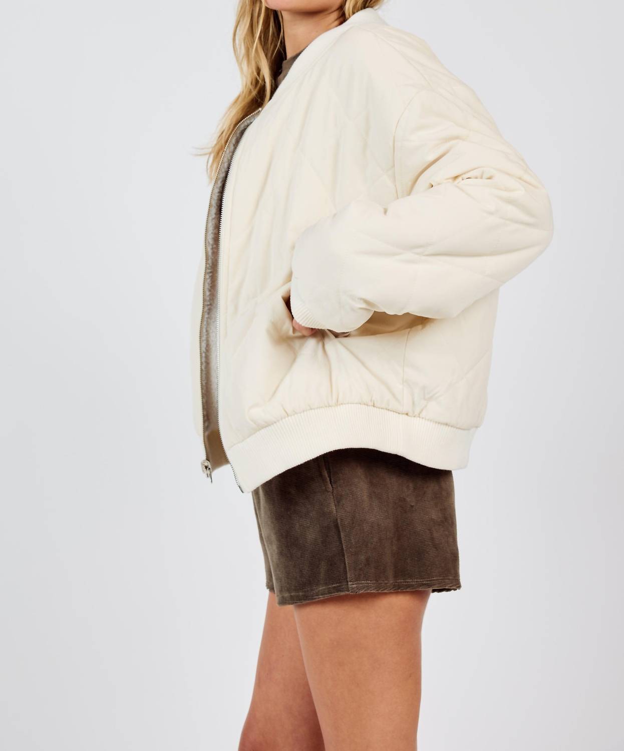 A riff on your favorite classic bomber jacket. Stay warm and stylish with the Jill Reversible Zip Up Bomber Jacket by Sadie & Sage in classic ivory. This jacket features long sleeves and a luxurious mix of 100% polyester and cotton for its shell, with a cozy polyester filling and a polyester-spandex lining. The zip closure offers ease, while a crew neckline ensures timeless appeal. Perfect for chilly days, it boasts convenient pockets for practicality. Model is wearing a size Small