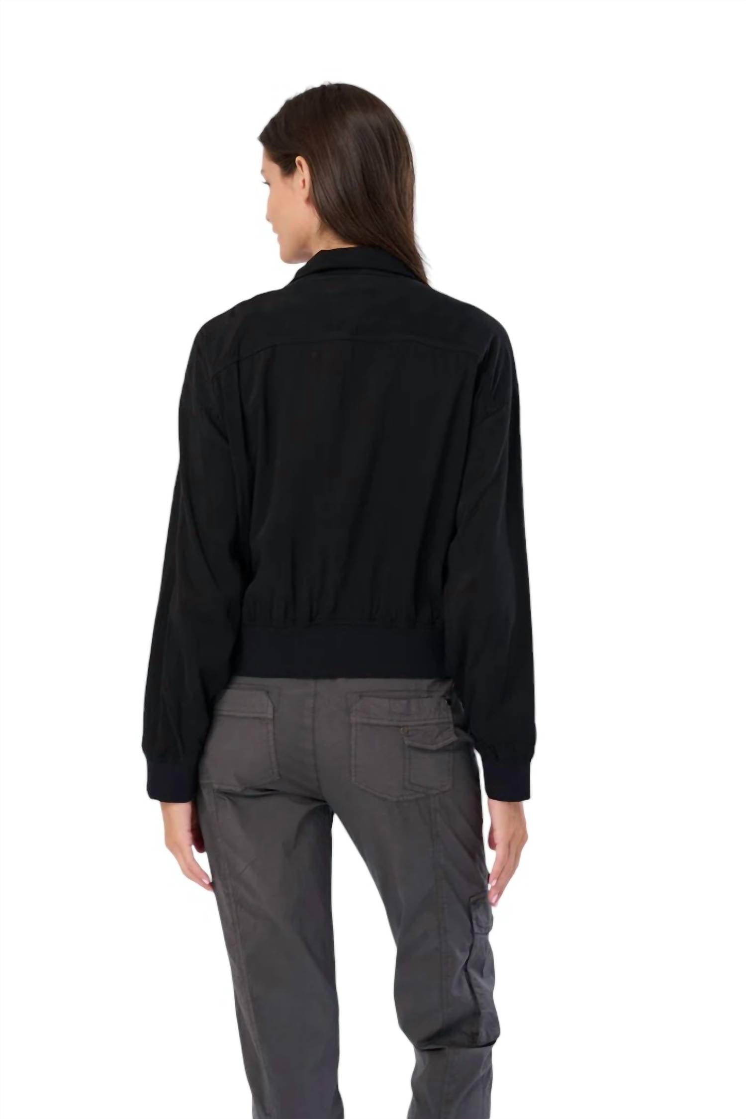 Make any outfit instantly cool by pairing it with this bomber jacket. This bomber-style jacket features a sleek design with dual front pockets, complete with zipper and snap details for a secure and stylish closure. The silky-smooth texture adds a luxurious touch to the jacket, while the 61% cupro, 35% viscose, and 4% spandex construction ensures a soft and flexible wear. Machine wash cold to preserve its quality. The model is wearing a small, and the jacket has a length of 25.5 inches, making it a perfect addition to your wardrobe.