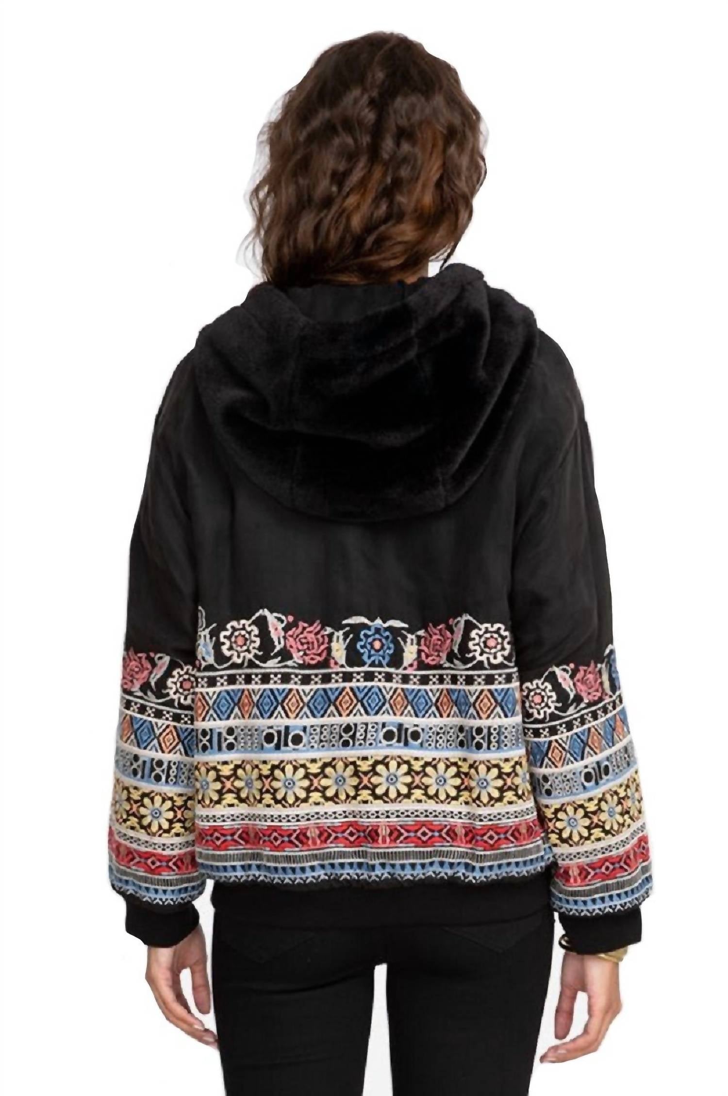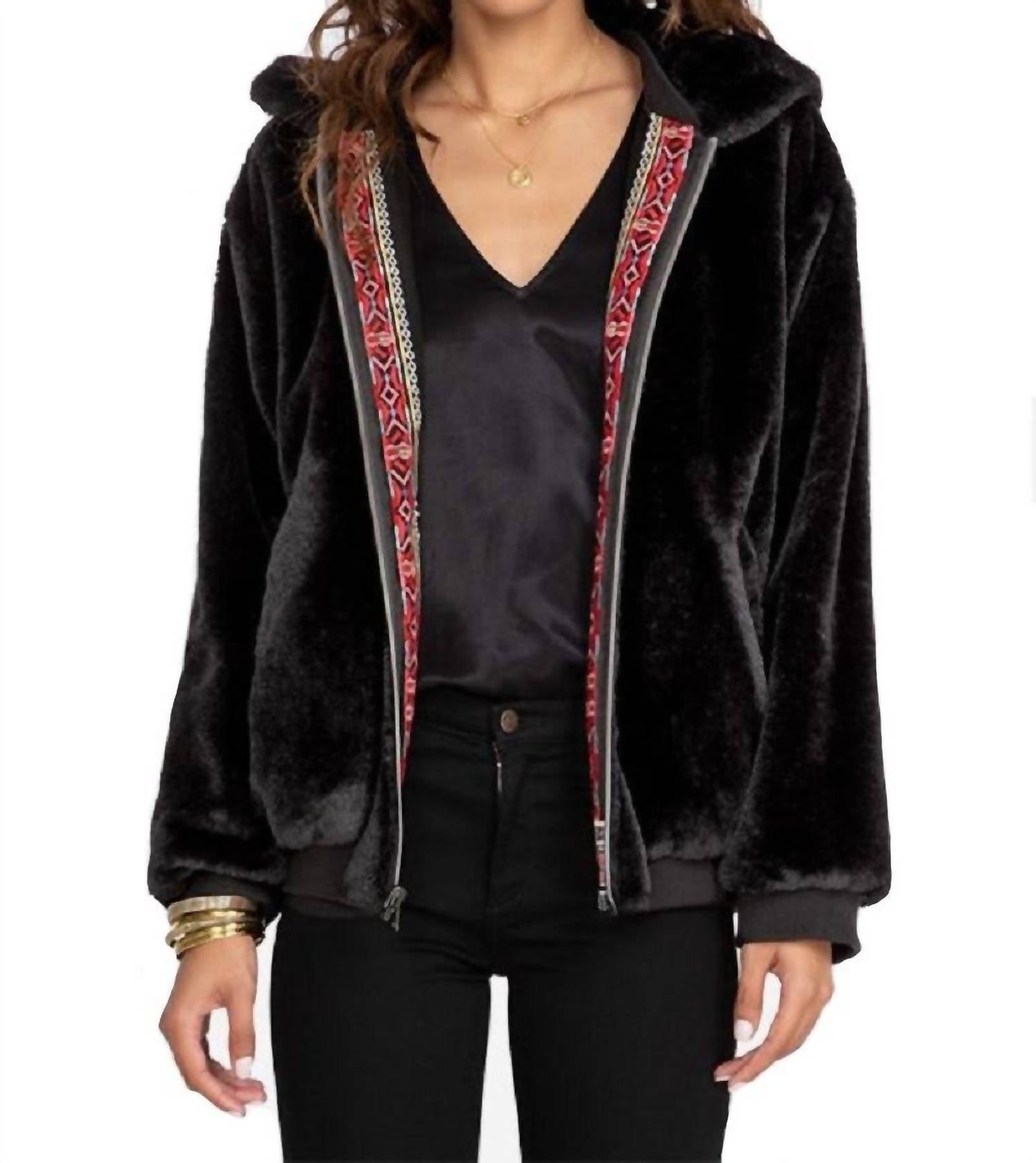 This trendy jacket features global-inspired details, festive accents, and a laid-back form. Reversible. 60% Cupra/40% Rayon. Model height: 5'9". Measurements for size medium: Length- 26", Bust- 51 1/2". Dry clean only.