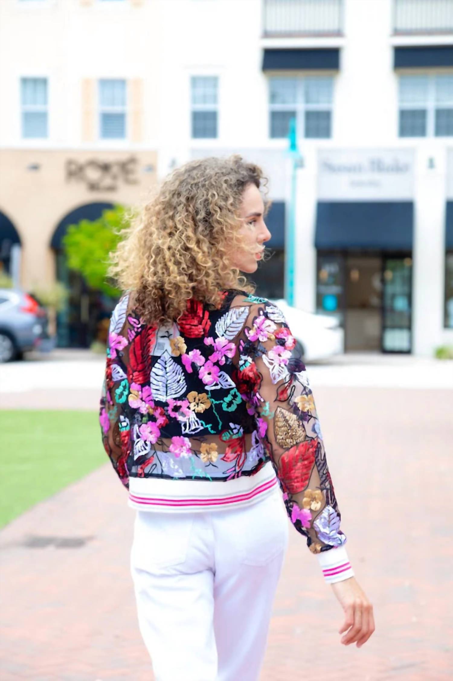 Make any outfit instantly cool by pairing it with this bomber jacket. Infuse your wardrobe with tropical glamour with The House of Perna's Lindsay Bomber Jacket in the vibrant Tropical Garden print. This women's long-sleeve jacket showcases a V-neckline and combines a bold floral pattern with the luxurious sparkle of sequins, creating an effortlessly cool and boho chic vibe. Made for summer and ideal for vacation occasions, it features a convenient zip closure. Care for this piece with hand washing to maintain its dazzling appearance.