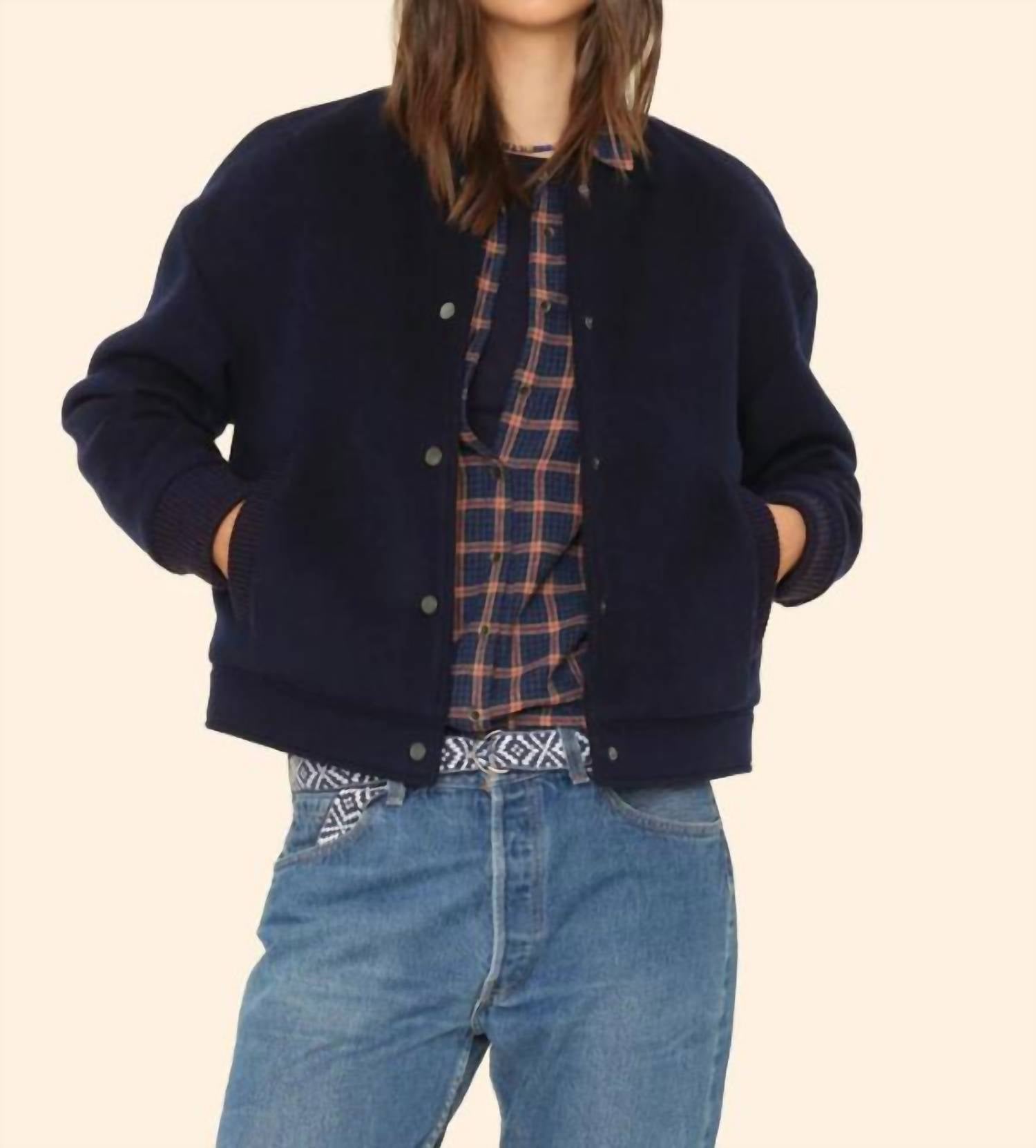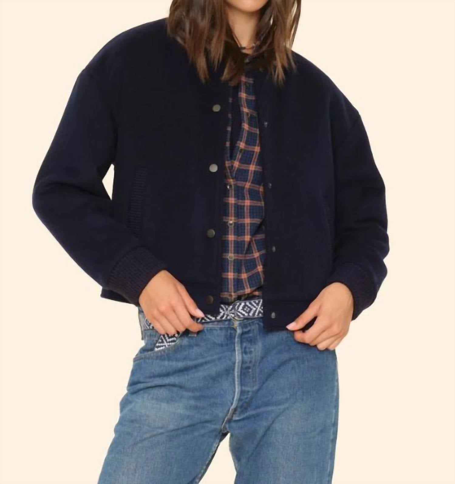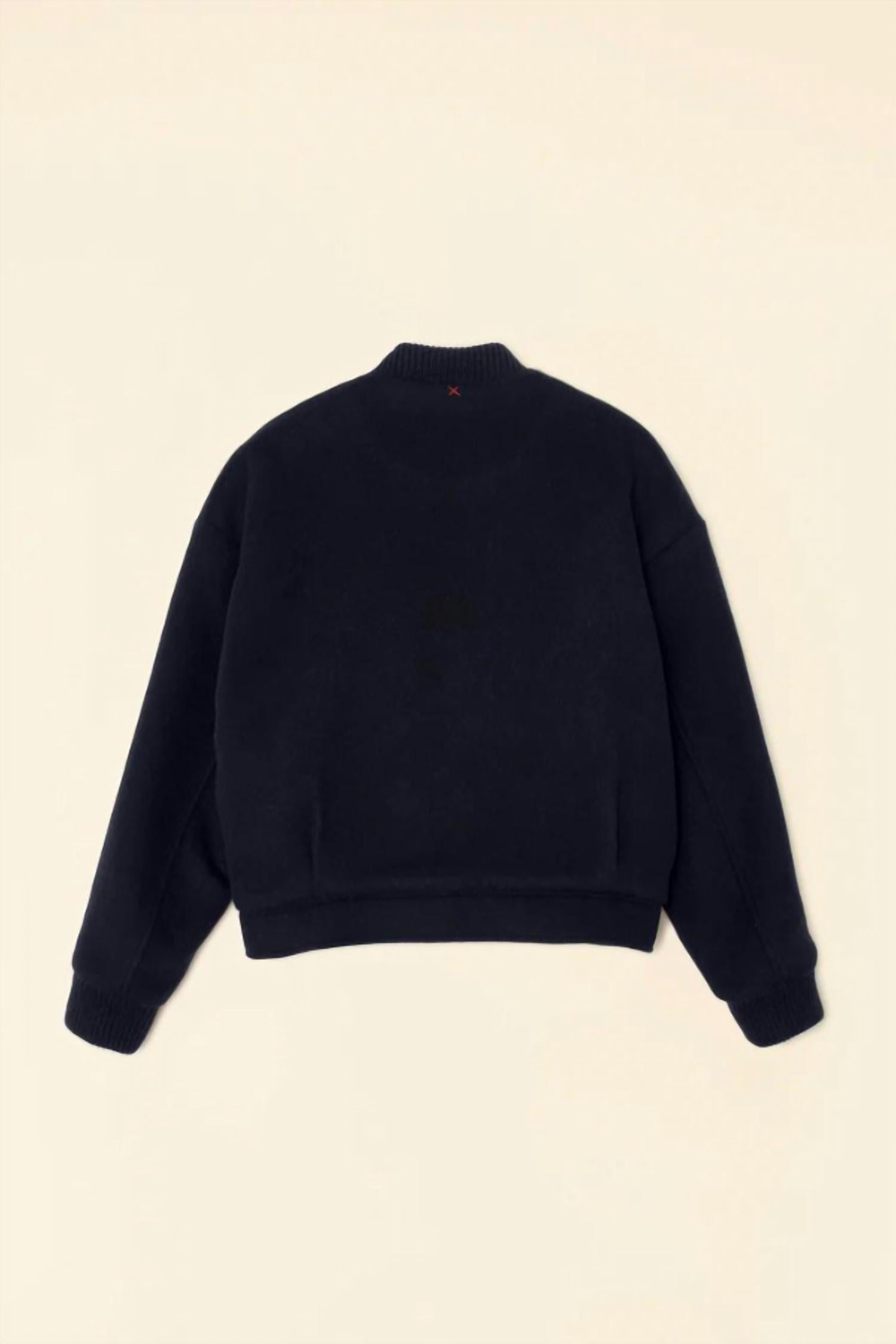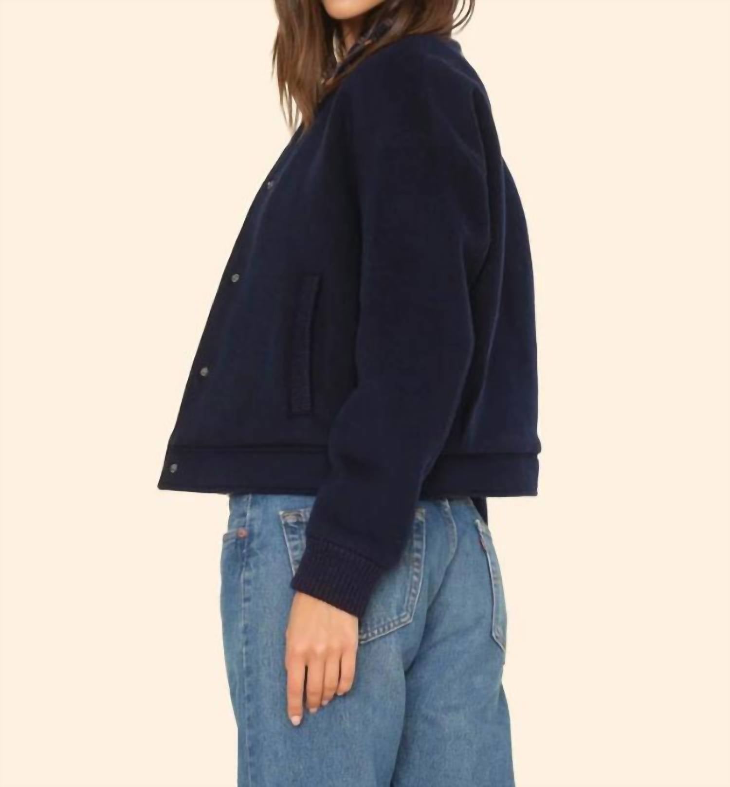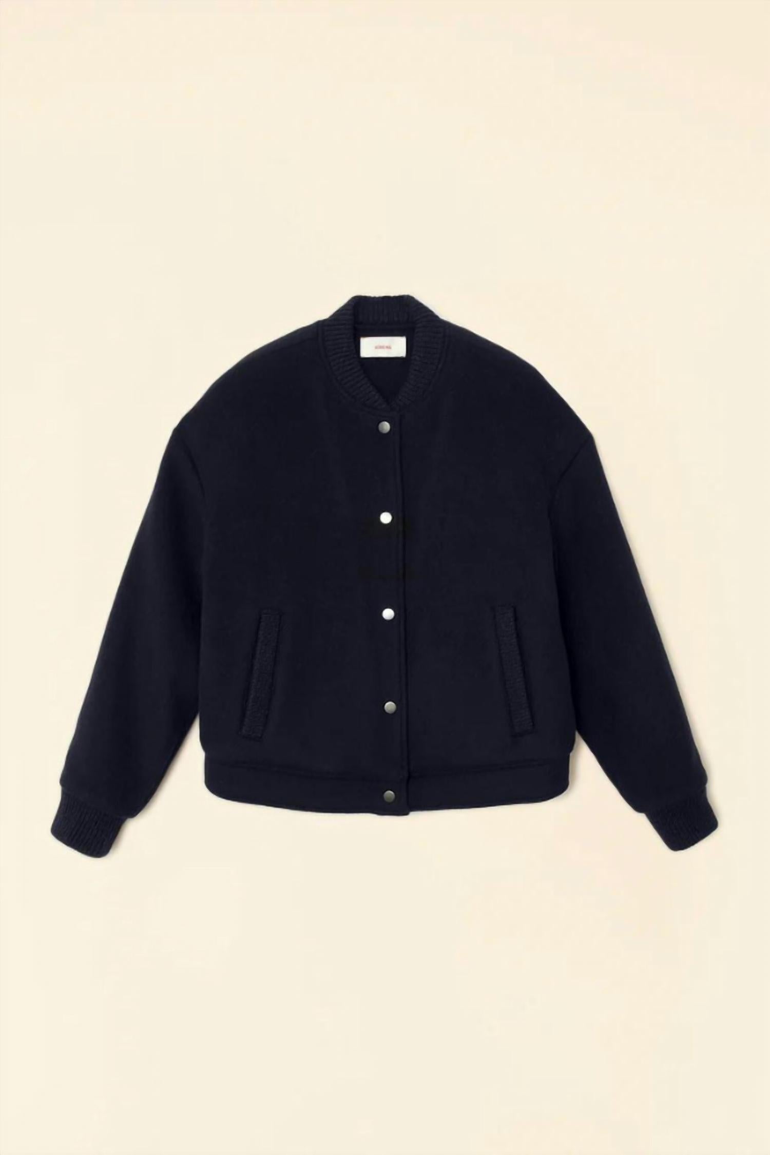 Introducing the Braidy Jacket by XIRENA, a staple piece in dark navy for your bomber collection. This varsity jacket offers long sleeves and is crafted from a luxurious wool blend, comprising 60% wool and 40% polyester, expertly designed in Los Angeles. It features a metal snap closure with ribbed collar and welt pockets for a seamless blend of style and functionality. Elevate your outerwear with this true-to-size fit, maintaining its elegance through dry clean care.