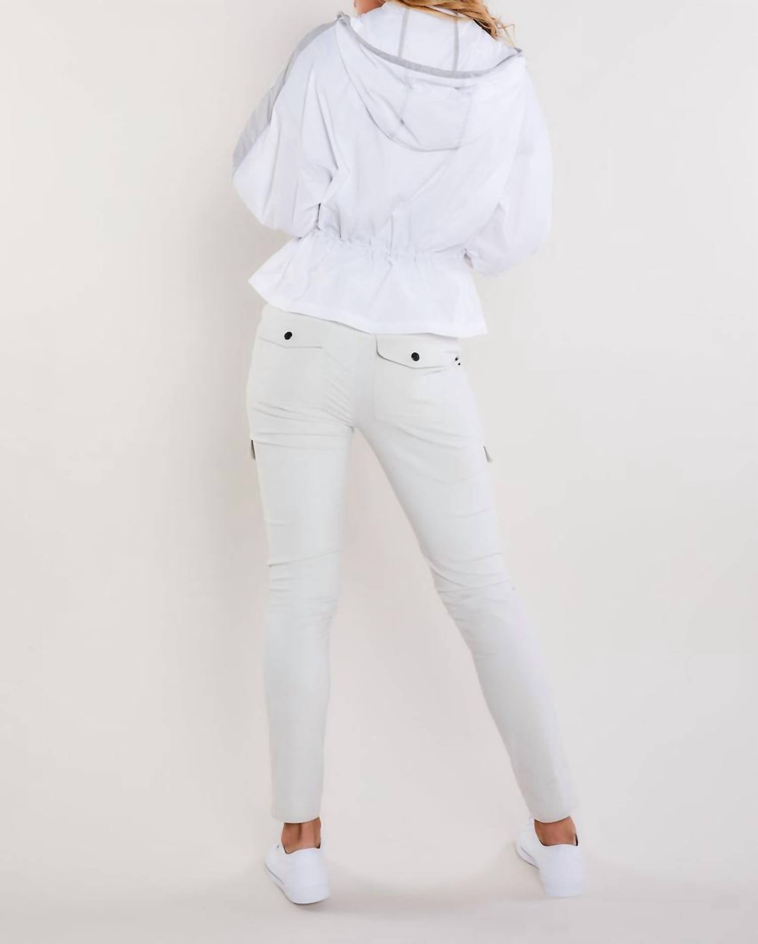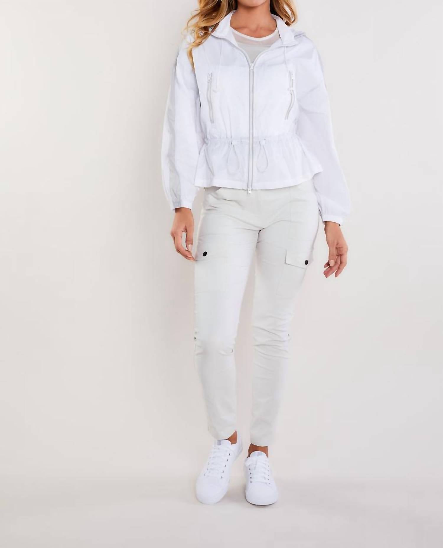 Full length sleeves with fitted cuffs. High neckline. Attached hood with external drawstring closures. Front two way zip closure. Contrast panel detailing at shoulder/sleeves. External drawstring at waist. Hem hits just below waist. Wrinkle-resistant. Relaxed fit. 100% Nylon. Made in Italy.