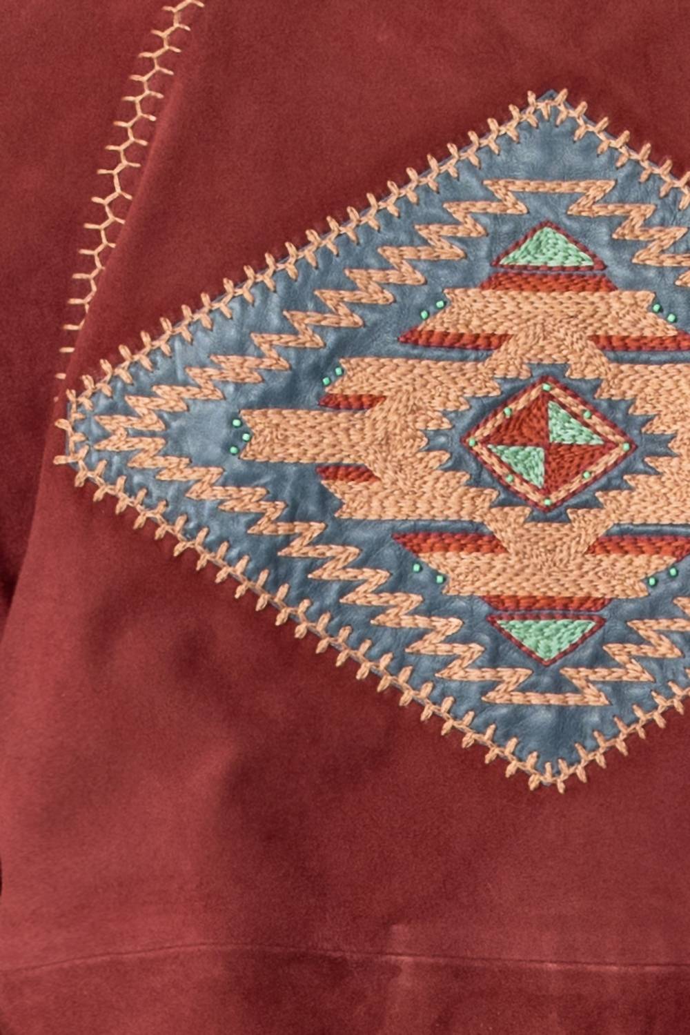 A riff on your favorite classic bomber jacket. Introducing the Open Mesa Jacket by Double D Ranch, an essential piece from their Grand Canyon Collection. This women's bomber jacket in rust boasts long sleeves and a relaxed fit, crafted entirely from vibrant oxblood goat suede. Adorned with intricate embroidery, applique, beading, and color-block details, this eye-catching piece features a serape eye embroidered on the back and a crewneck design. Closure is a convenient zip, combining style with practicality and transitioning seamlessly from summer to fall.
