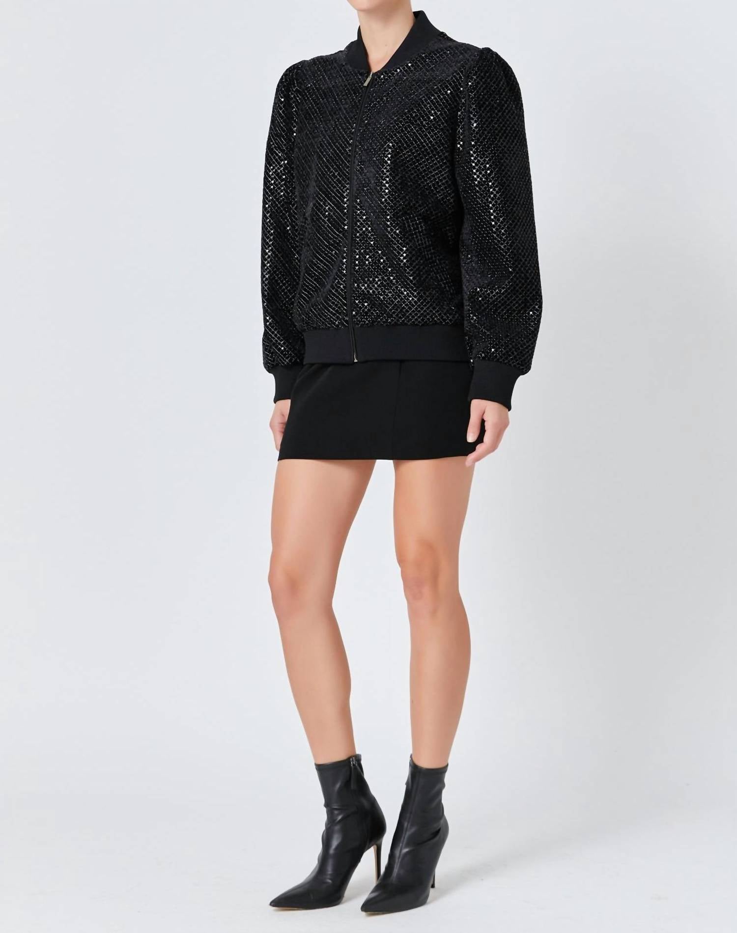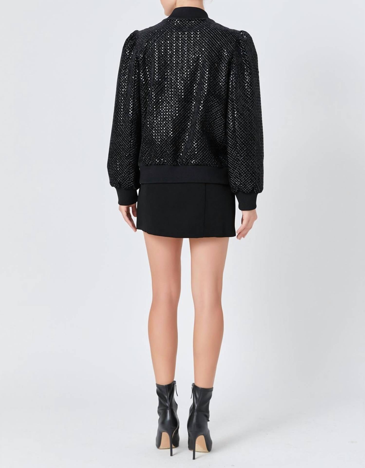 Nothing is cooler than this vintage inspired bomber jacket. Dazzling sequin design on a luxurious black velvet exterior. This women's oversized jacket features long sleeves and a ribbed stand-up collar, adding comfort and style, with a total length of 24.25 inches and a bust dimension of 40.5 inches. Made in China, the jacket offers a practical front center zip closure and pockets for added functionality. Composition includes a shell of 100% polyester with a lining and contrast of 95% polyester and 5% spandex, and care instructions are hand wash cold and lay flat to dry, avoiding bleach, tumble drying, dry cleaning, and ironing.