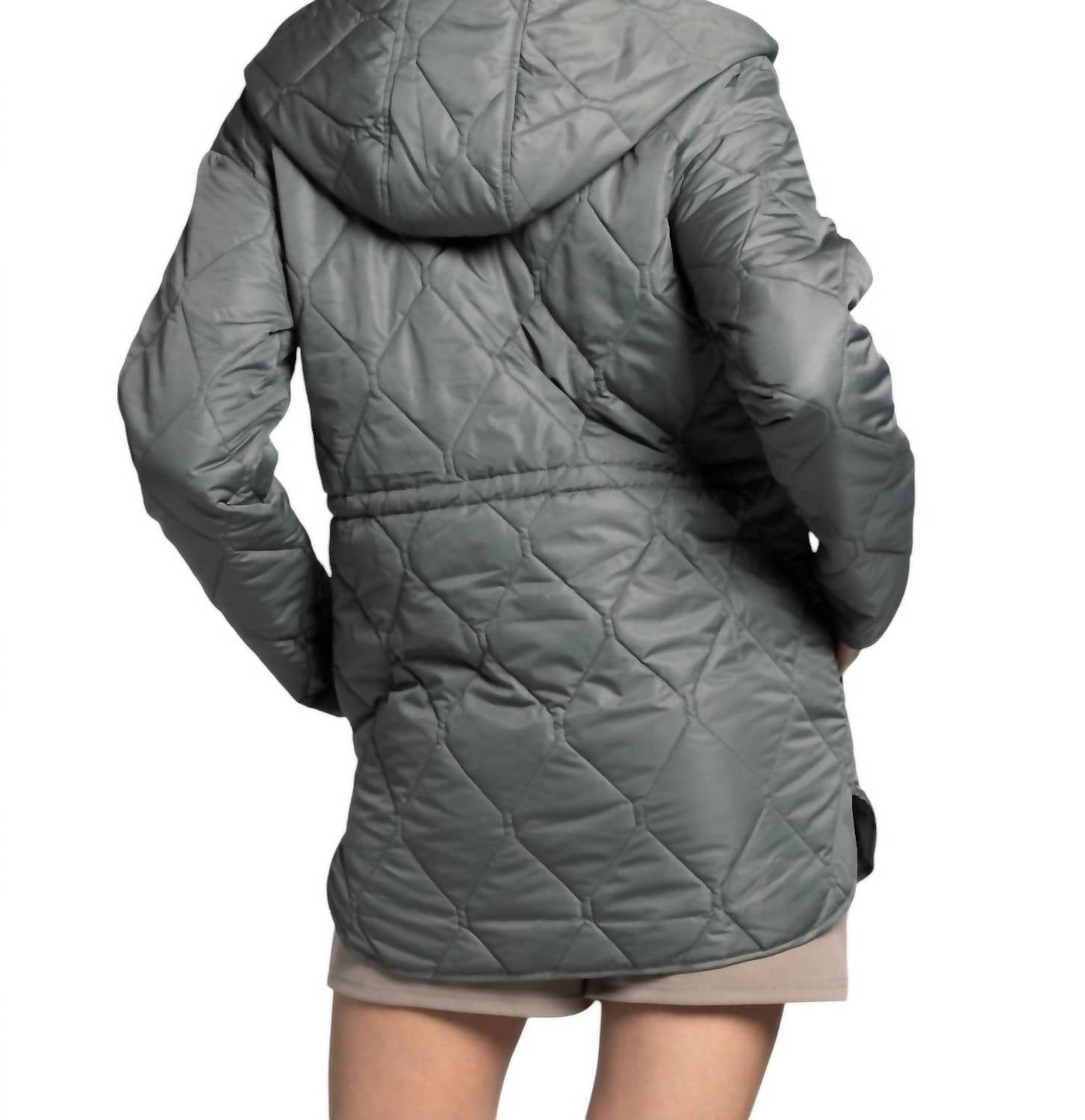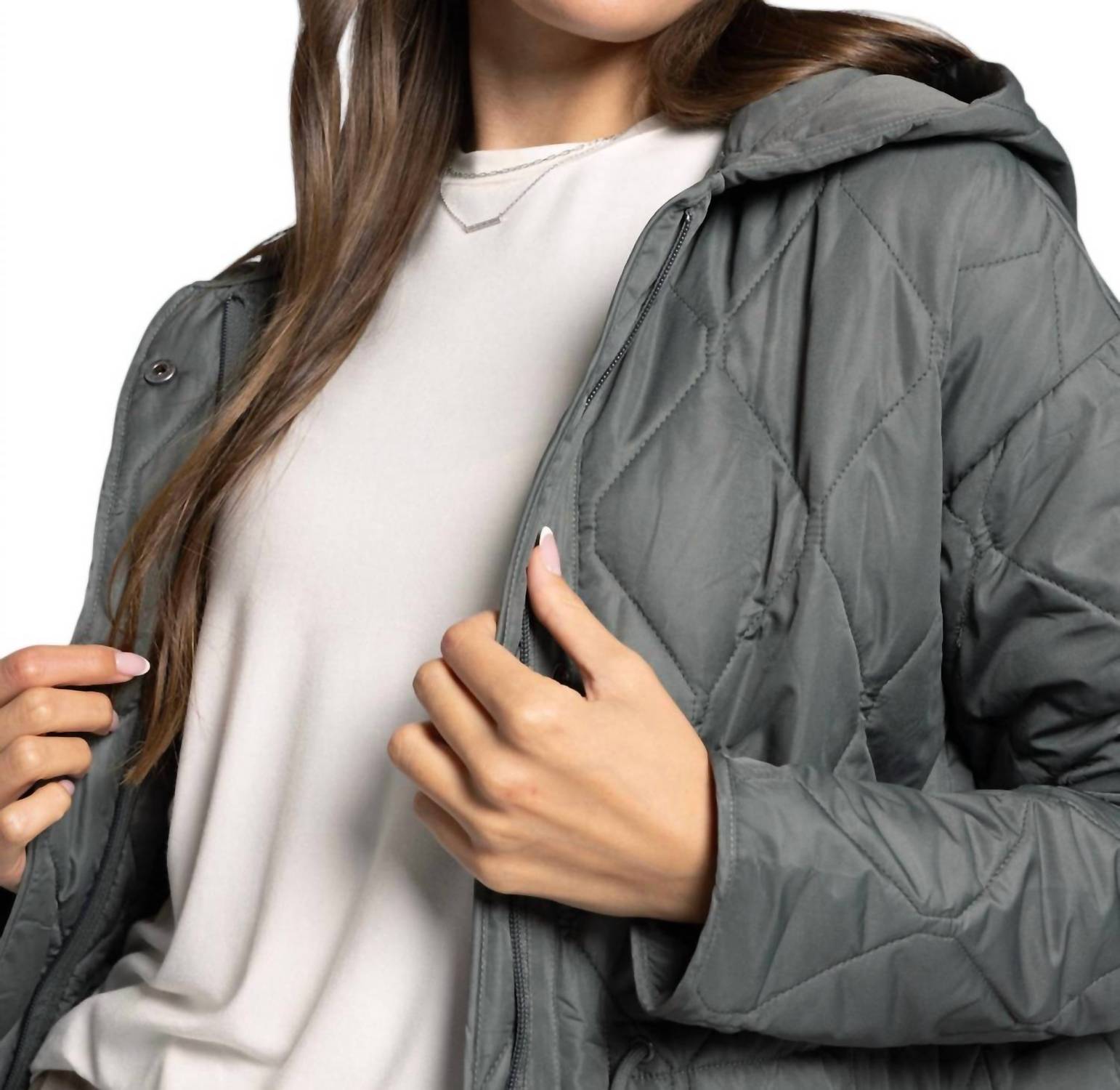 A riff on your favorite classic bomber jacket. Elevate your winter wardrobe with the Cecily Puffer Jacket by Thread & Supply, a must-have in a chic Smoked Jade hue. This patterned jacket boasts long sleeves and a practical attached hoodie, offering both style and warmth. Made from 100% quilted polyester, it features a versatile length of 32 inches and dual side pockets. Designed for convenience, the jacket includes a zipper front closure with snap buttons and an adjustable drawstring waist. Care for it with a machine wash in cold water.