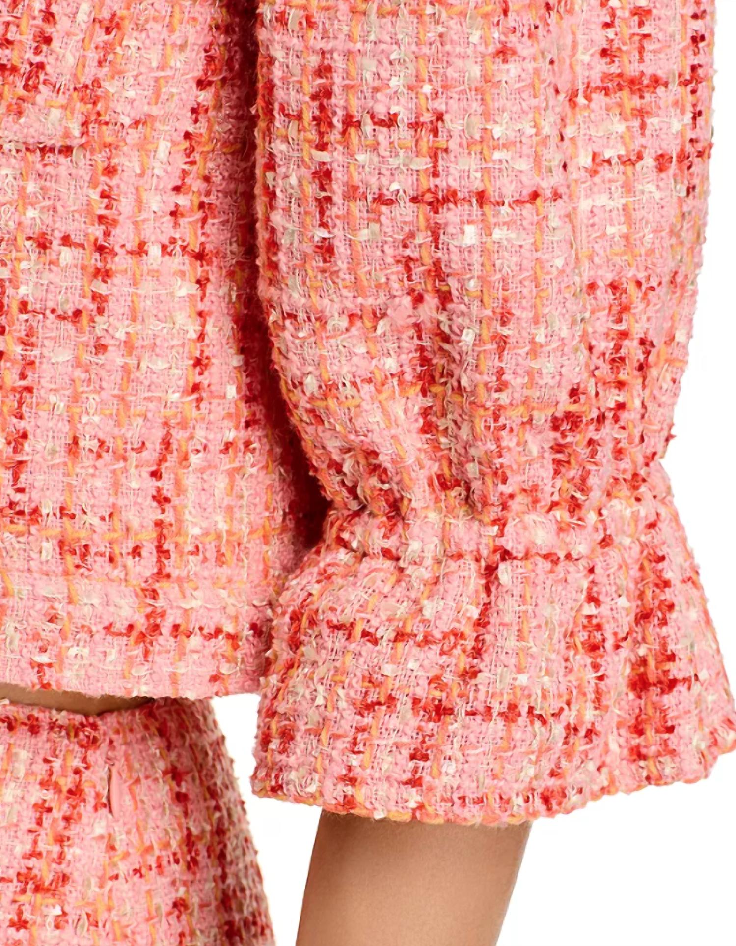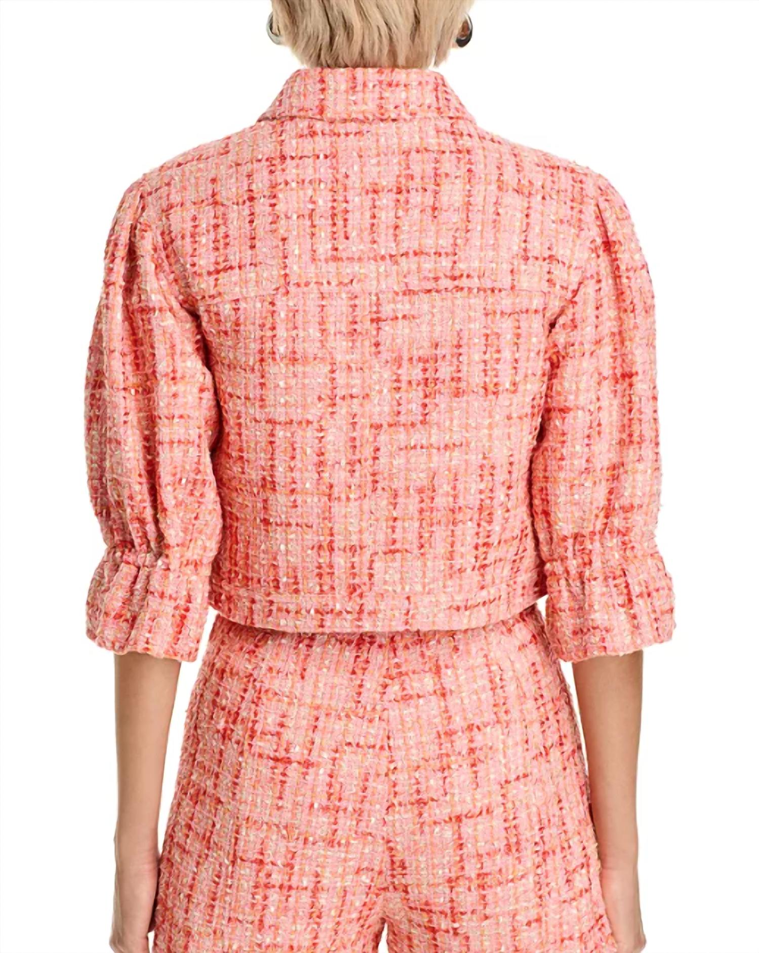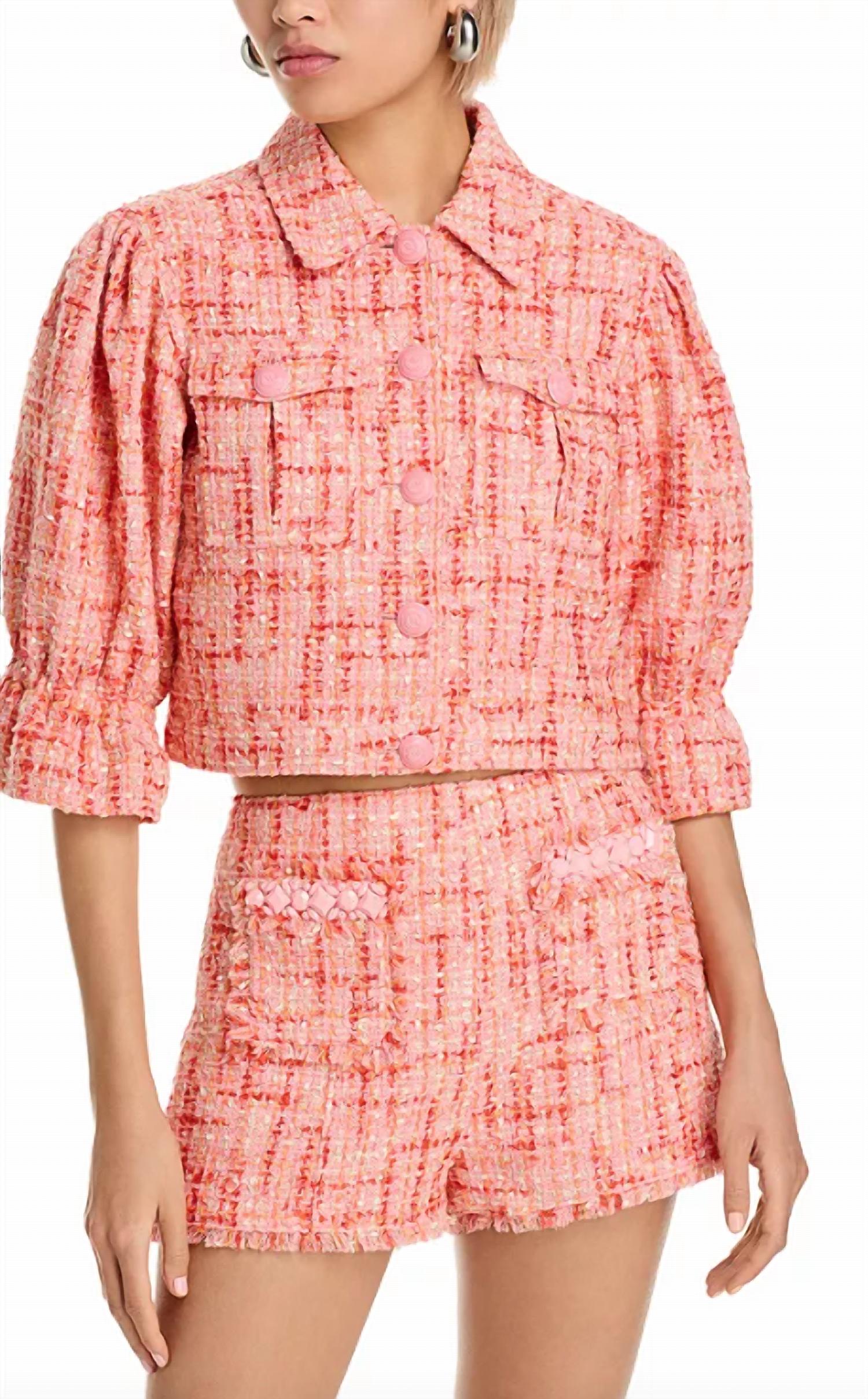 Make any outfit instantly cool by pairing it with this bomber jacket. Indulge in luxury with the Lucie Boucle Julietta Jacket. This cropped, pink jacket boasts intricate embellishments for a touch of sophistication. Elevate your wardrobe with this elegant piece, perfect for any occasion. Feel like a work of art in this must-have lady jacket. For a cohesive look, pair it with the Lucie Boucle Racquel Short.