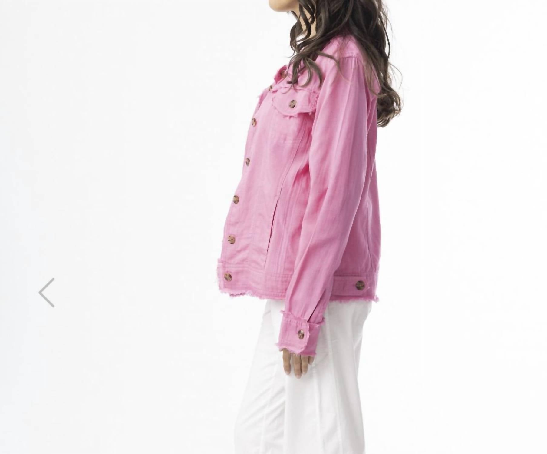 A riff on your favorite classic bomber jacket. Fabric Cotton Blend Description Step into summer with our Linen Blend Jacket, the perfect solution to summer layering. Featuring stylish frayed trim and front bust pockets, this jacket combines casual elegance with practical design. Perfect for layering, it offers both comfort and chic appeal, making it a versatile addition to any outfit. Button through front Long sleeves Fringe borders Pocketing Cotton blend Cold handwash Country of Origin: India