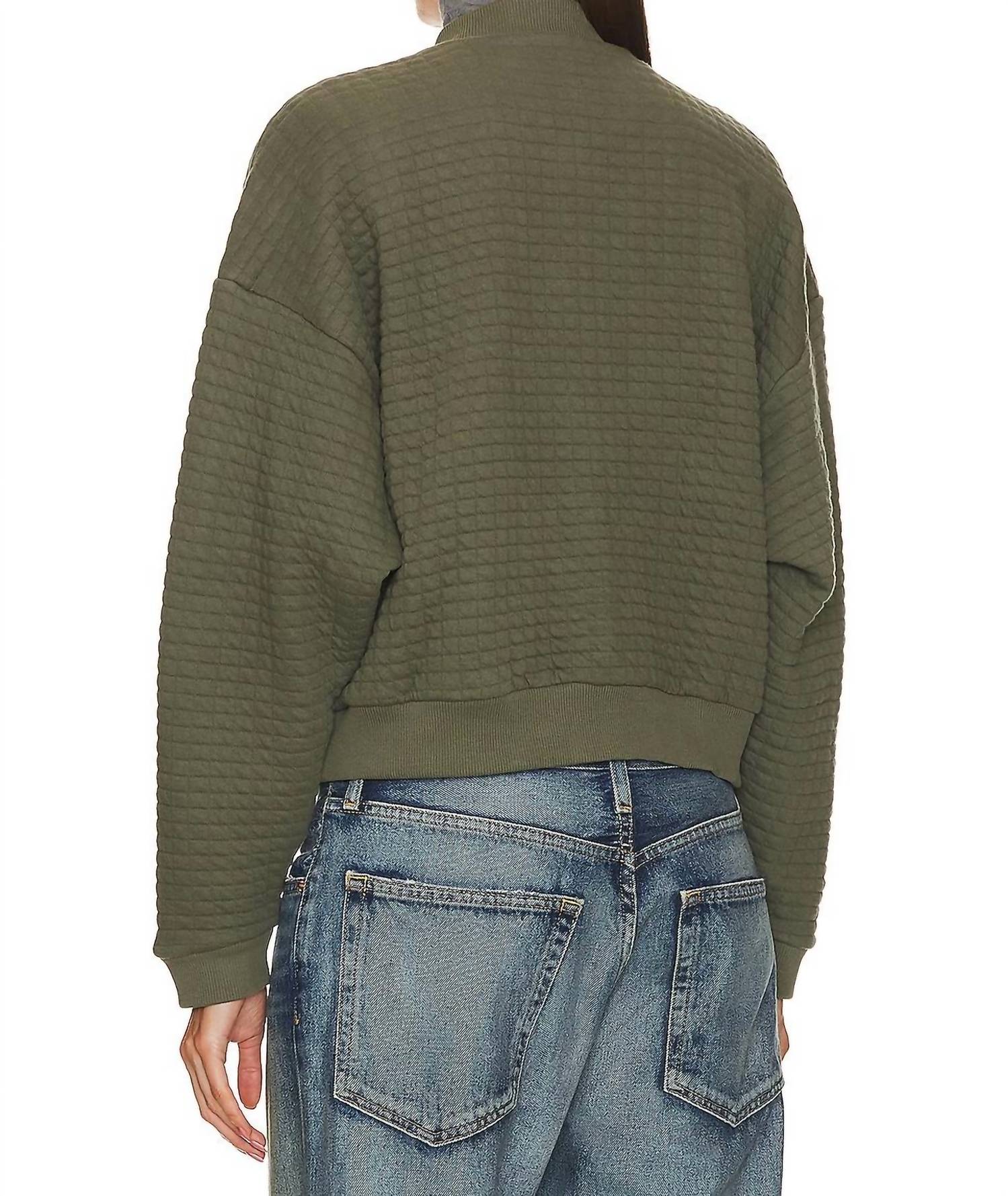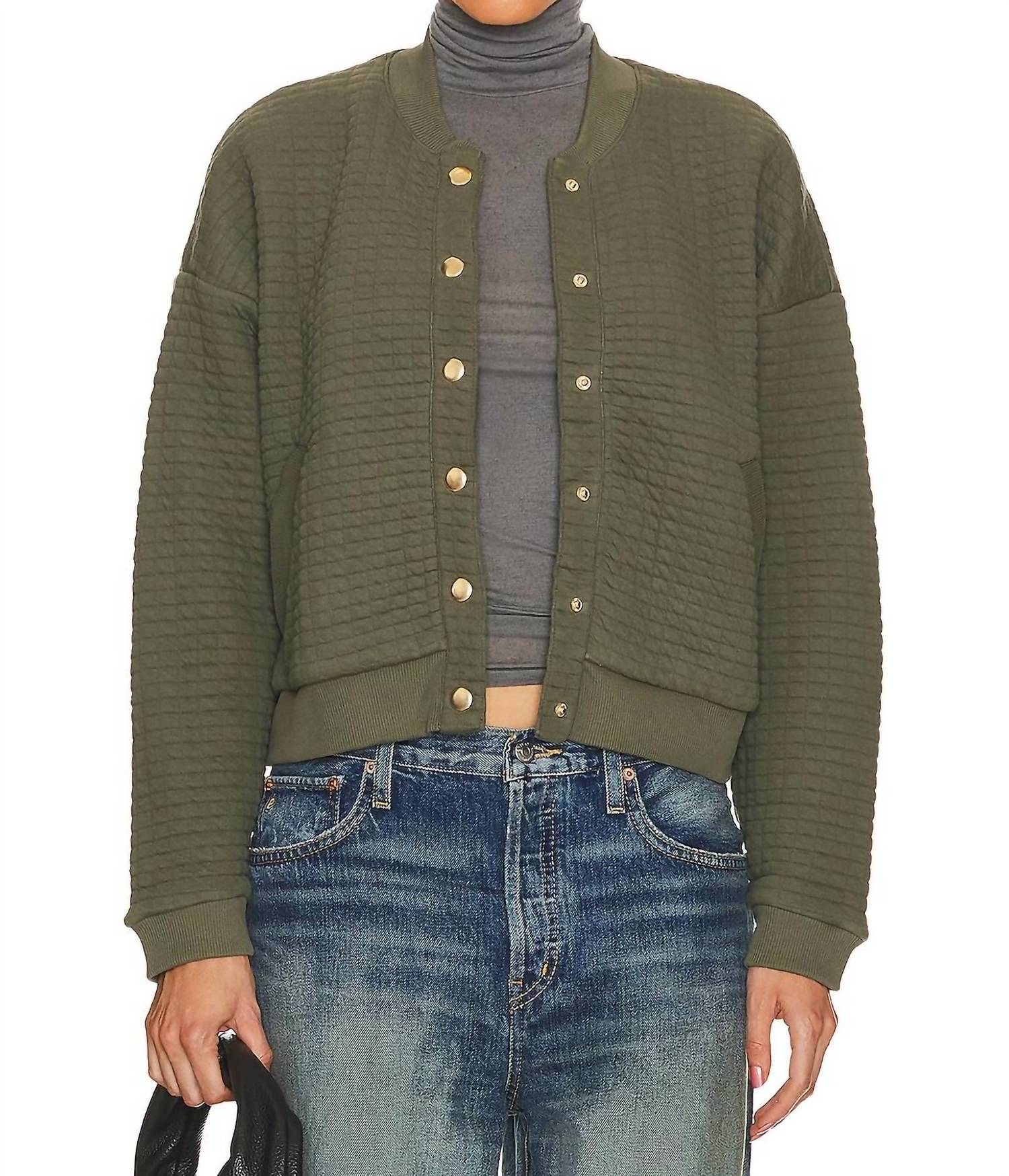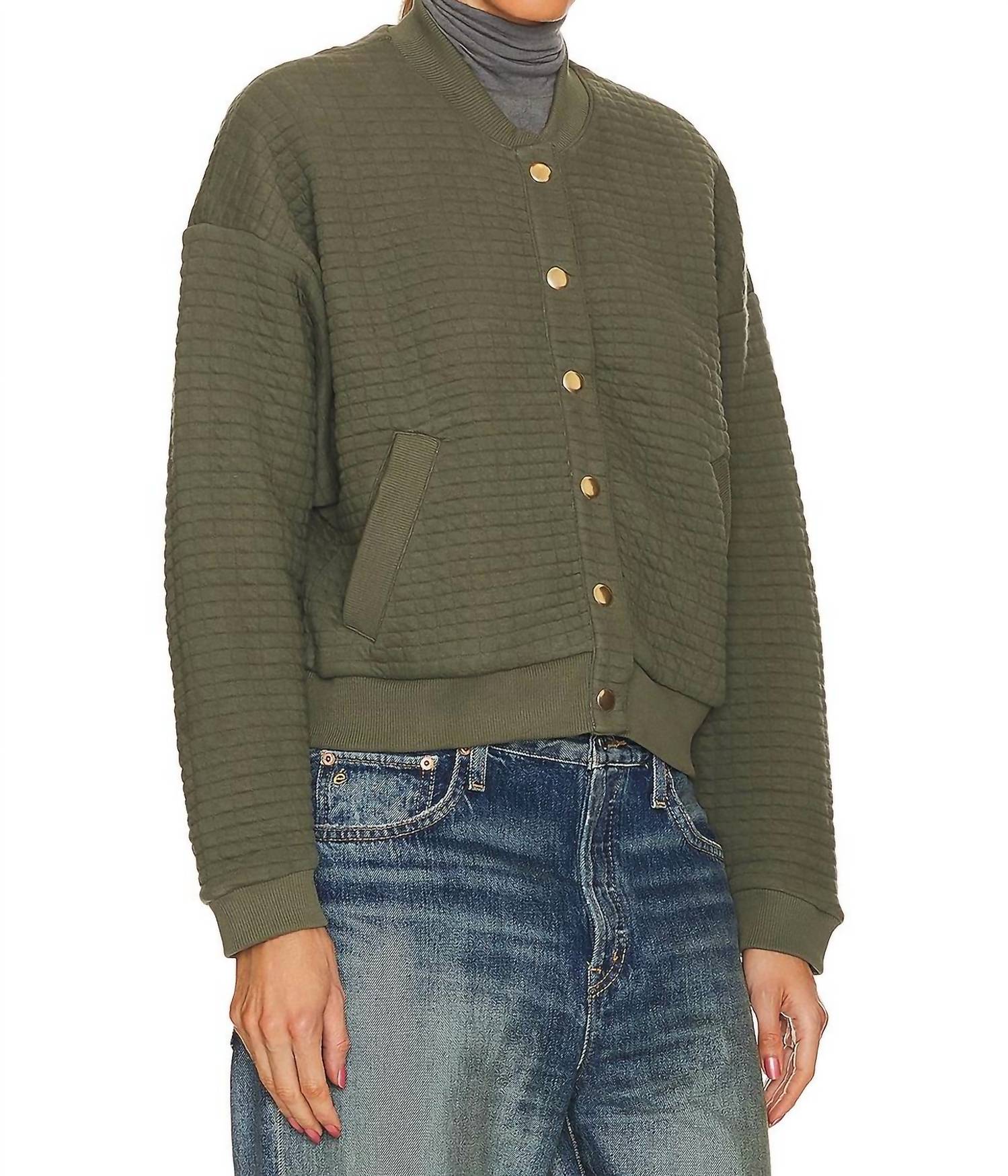 A riff on your favorite classic bomber jacket. The Logan Oversized Bomber Jacket by Nation LTD is a stylish outerwear piece in Stoned Moss perfect for adding a touch of texture to your look. With its long sleeves and a collared neck, this jacket features a gold-tone snap button closure and practical slant front pockets. Its 78% cotton and 22% polyester shell provide a comfortable fit, and the garment measures 20.75 inches in length. Made to be durable, it is lined for extra warmth and is conveniently machine washable with instructions to lay flat to dry.