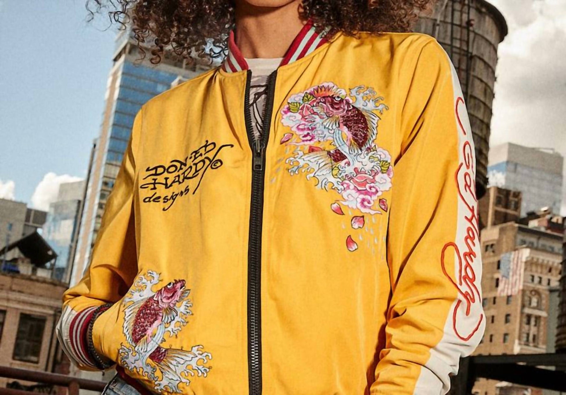 Embrace a touch of nostalgia with Ed Hardy's Women's Koi Cranes Souvenir Jacket, a harmonious blend of traditional artistry and contemporary fashion. Crafted from lightweight satin poly, this bomber jacket boasts a luminous gold and white palette that effortlessly catches the eye. The intricate crane and koi graphics, inspired by timeless archival designs, lend an air of cultural reverence and storytelling. Striped trims and cuffs accentuate the athletic vibe, while a gold zipper closure brings a radiant finish to this statement piece. Perfect for those looking to infuse their wardrobe with a unique, heritage-inspired flair, this jacket embodies both elegance and edge, making it a standout addition to any fashion-forward collection.