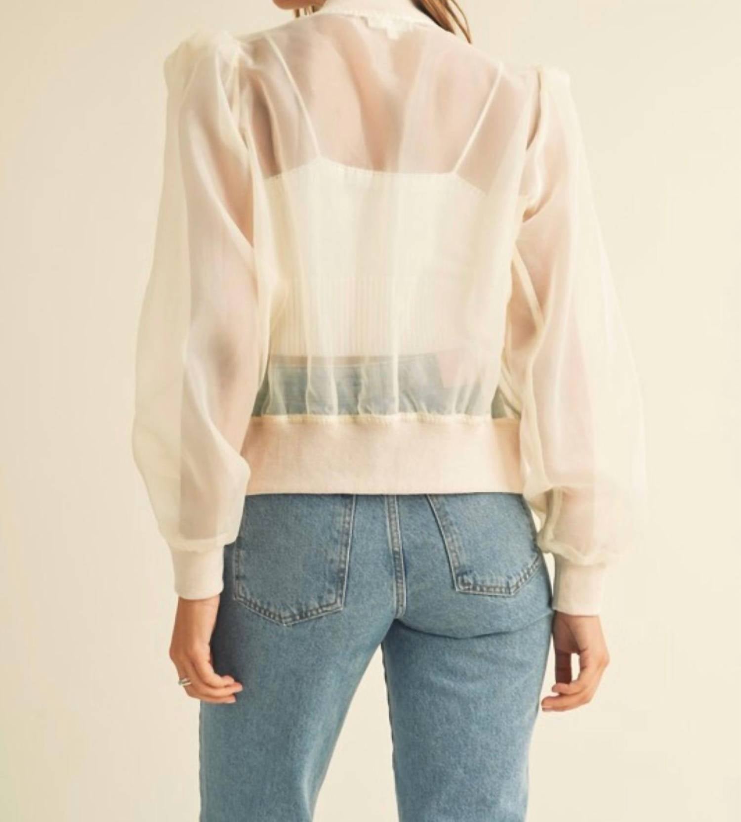 Make any outfit instantly cool by pairing it with this bomber jacket. Step up your style with the Madrid Sheer Bomber Jacket by MABLE, a chic piece designed in a soft cream hue. This jacket features long puff sleeves and a zip closure, crafted from lightweight, sheer organza with a material composition of 100% Polyester for the self and a contrast of 50% Rayon, 50% Nylon. The jacket's dimensions offer a range from Shoulder 14-15", Bust 24-26", Length 21-22.5", and Sleeve 26", providing a stylish fit. Care instructions include hand washing in cold water, drying flat, and a low iron.