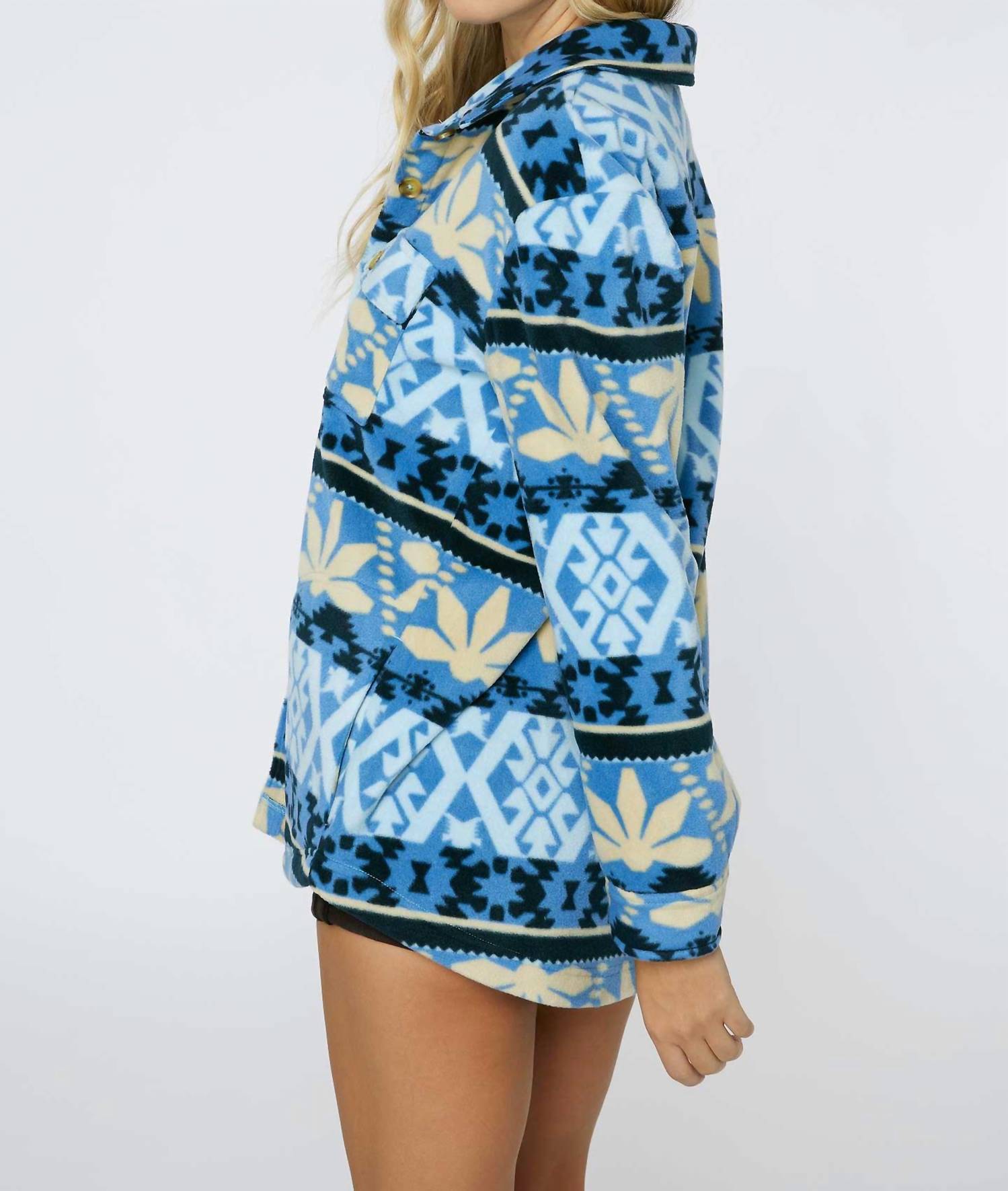 Make any outfit instantly cool by pairing it with this bomber jacket. Introducing the Collins Superfleece Shirt Jacket by O'NEILL, a stylish choice for cooler days in Classic Blue. This women's jacket features long sleeves, crafted from ultra-soft superfleece for a relaxed fit, and is 100% polyester. Its geometric allover print, dual chest pockets, and front button closure with a collar add distinctive touches to your ensemble. For optimal care, hand wash and lay flat to dry.