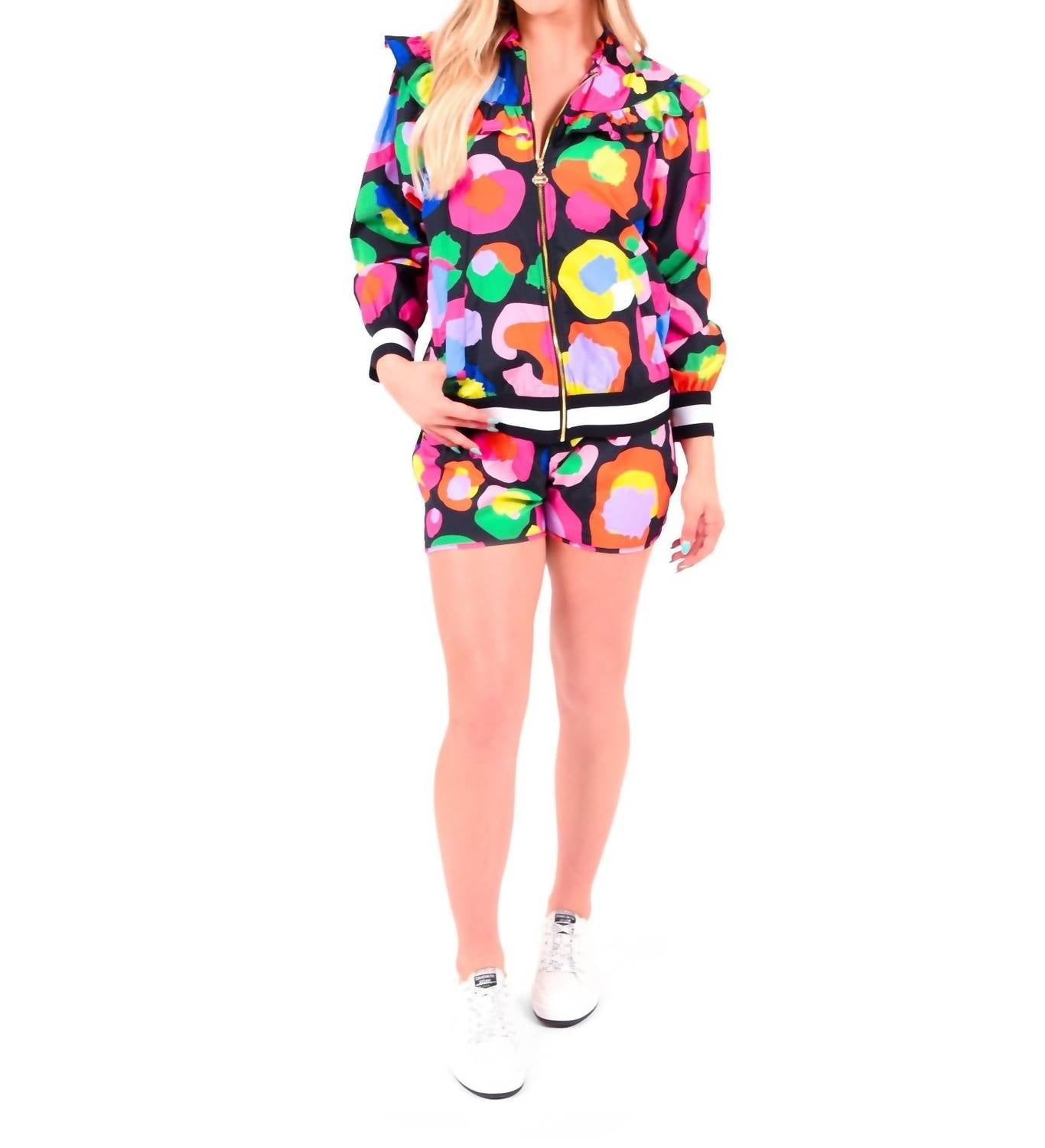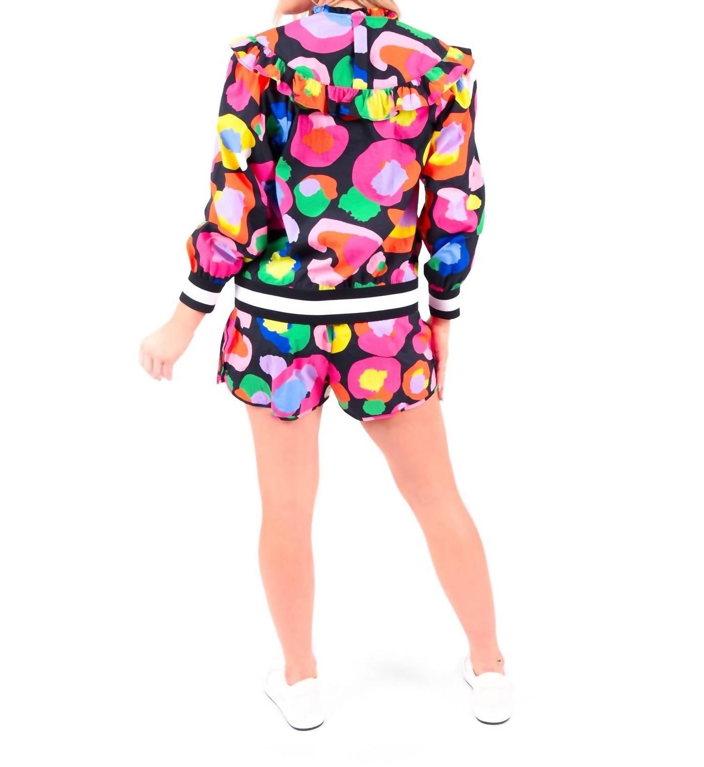 Make any outfit instantly cool by pairing it with this bomber jacket. Elevate your wardrobe with the Ruffle Bomber Jacket by Emily McCarthy, featuring a chic and vibrant Pop Cheetah print. This long sleeve bomber, crafted from 100% nylon, combines lightweight fabric with a modern mockneck for a stylish look. Thoughtfully designed with pockets on both sides and a sleek gold zip closure, it seamlessly blends fashion and function. Care for this patterned masterpiece with a cold machine wash using a delicate cycle, and hang dry to preserve its unique color and shape.
