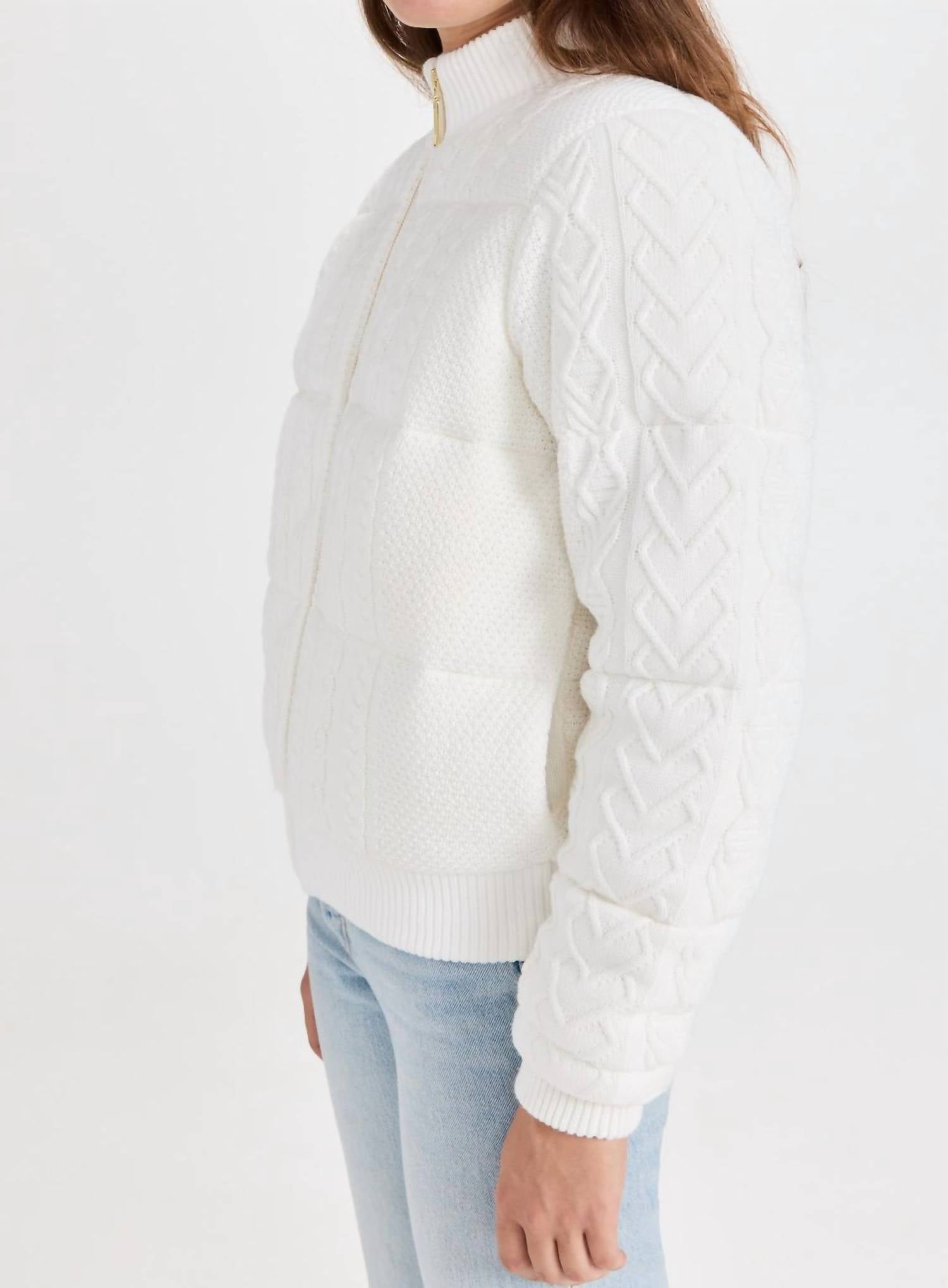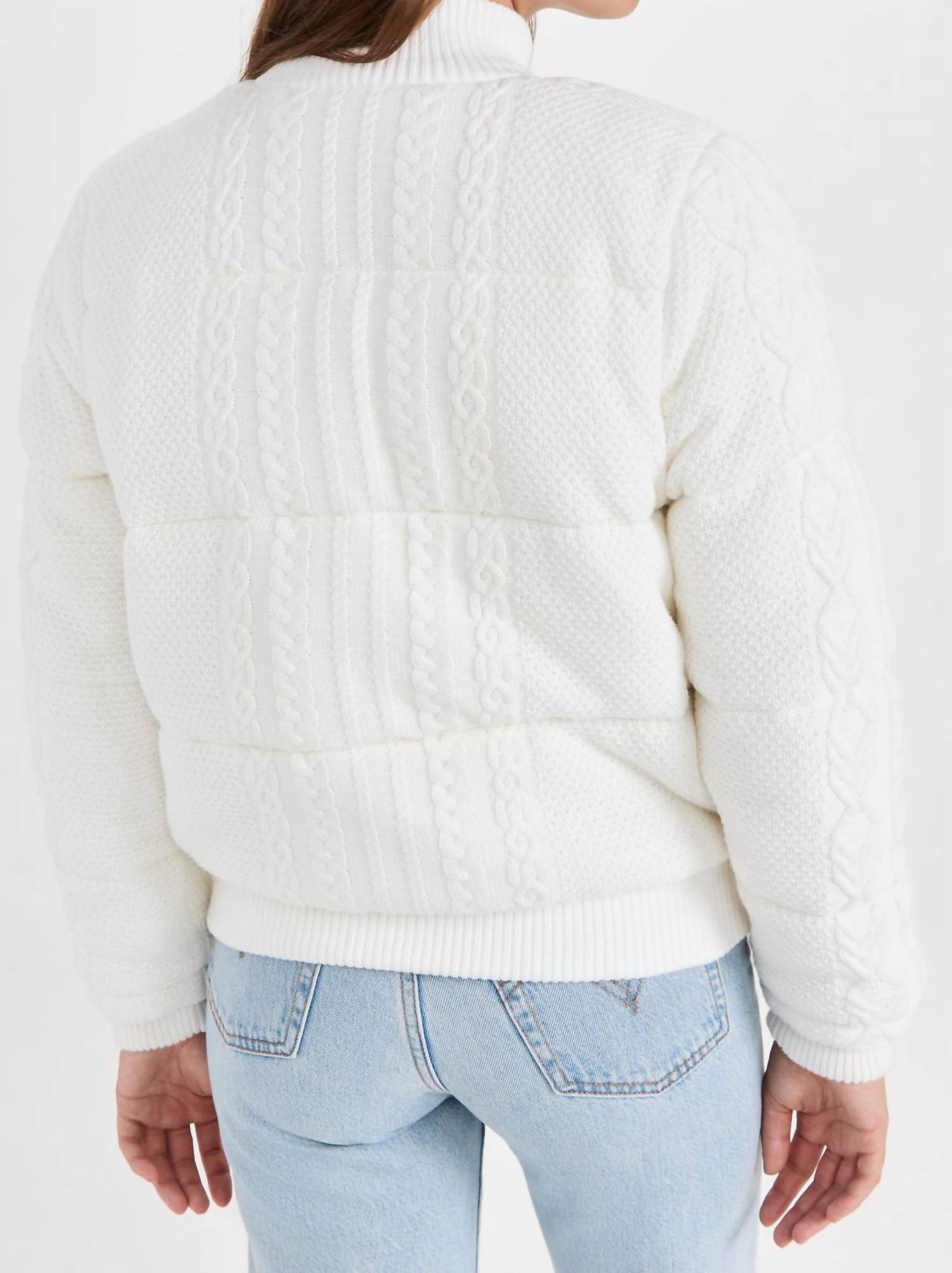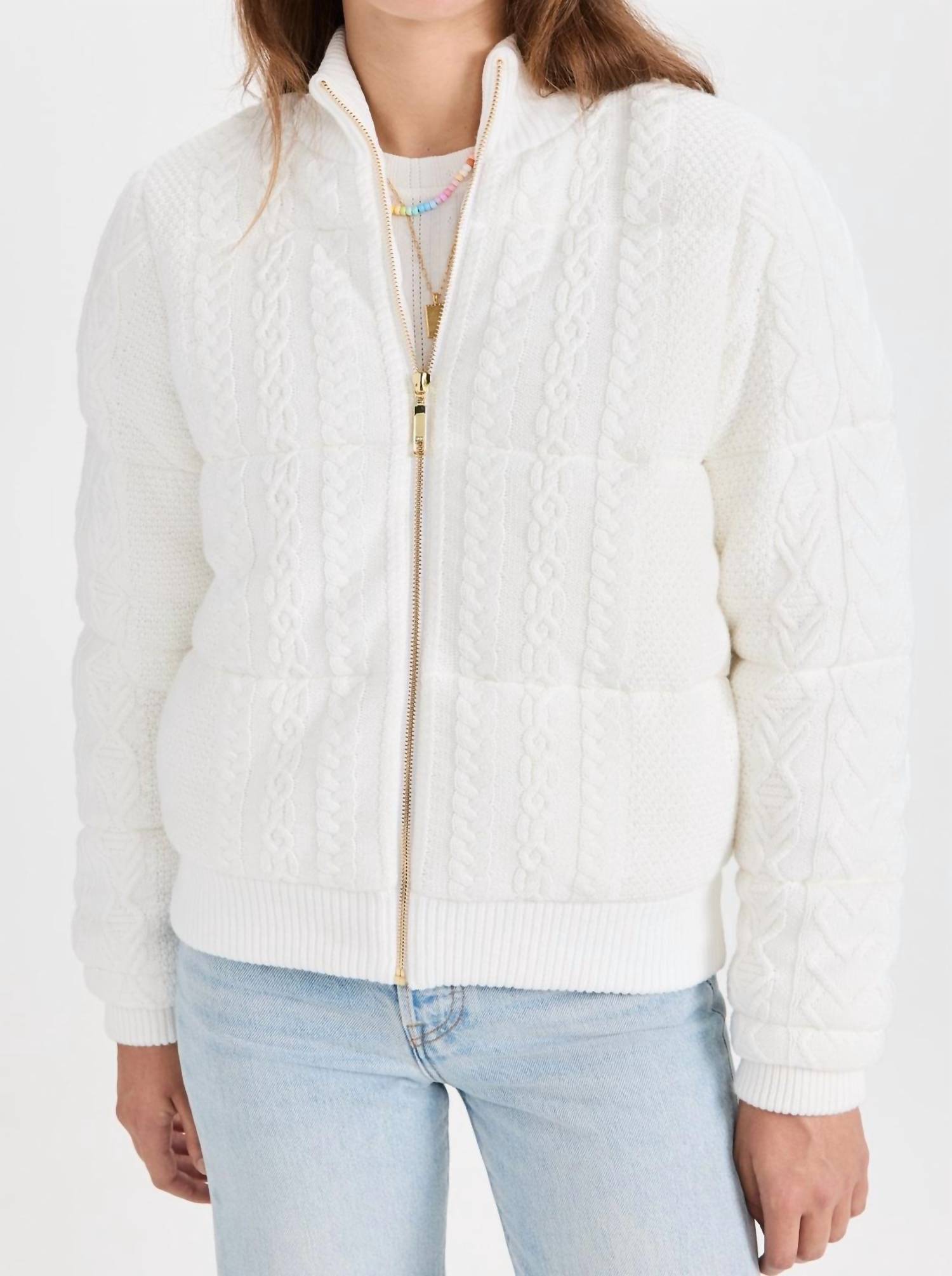 Nothing is cooler than this vintage inspired bomber jacket. Elevate your outerwear collection with the Andora Bomber Jacket by LoveShackFancy in an elegant cream hue. This women's bomber features a heavyweight cable knit with a quilted design, mock neck, and long sleeves for added warmth. Made from 100% cotton with a satin twill lining, this 22.75-inch length jacket includes on-seam hip pockets and a stylish gold-tone zip closure. With ribbed trim and textured patterning, it’s designed for dry clean care, originating from China.