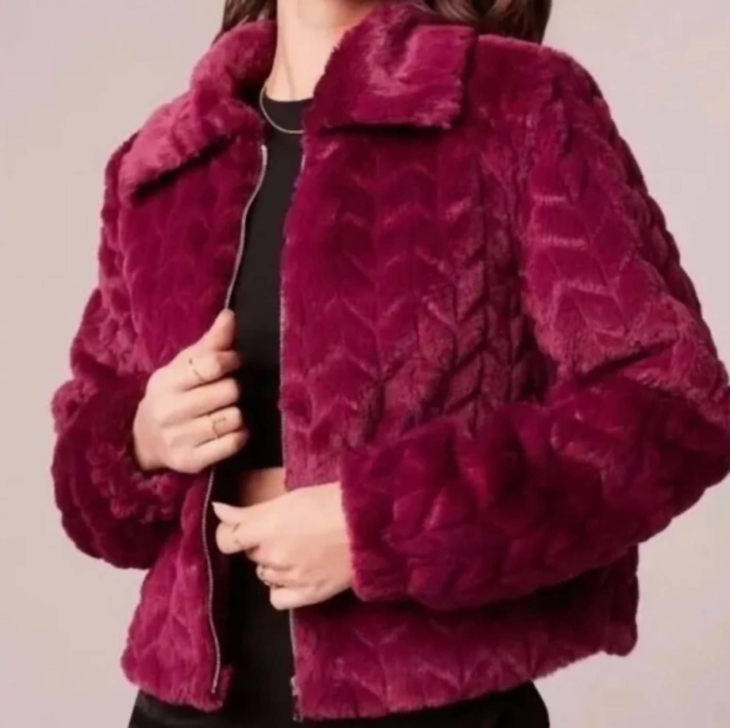 A riff on your favorite classic bomber jacket. Introducing the Val Faux Jacket by Band Of Gypsies, a chic addition to any wardrobe in a striking eggplant hue. This bomber jacket is crafted from super soft faux shearling and textured chevron faux fur, featuring long sleeves and an oversized collar for added flair. It closes with a practical zip closure and includes side pockets for functionality. Made from 100% polyester with a silky lining for a luxe feel.