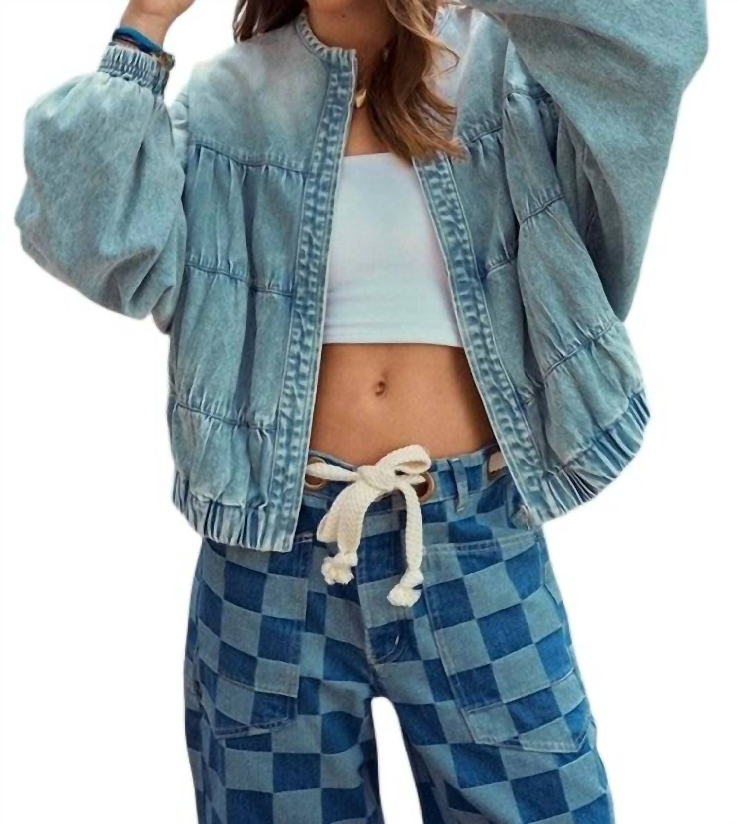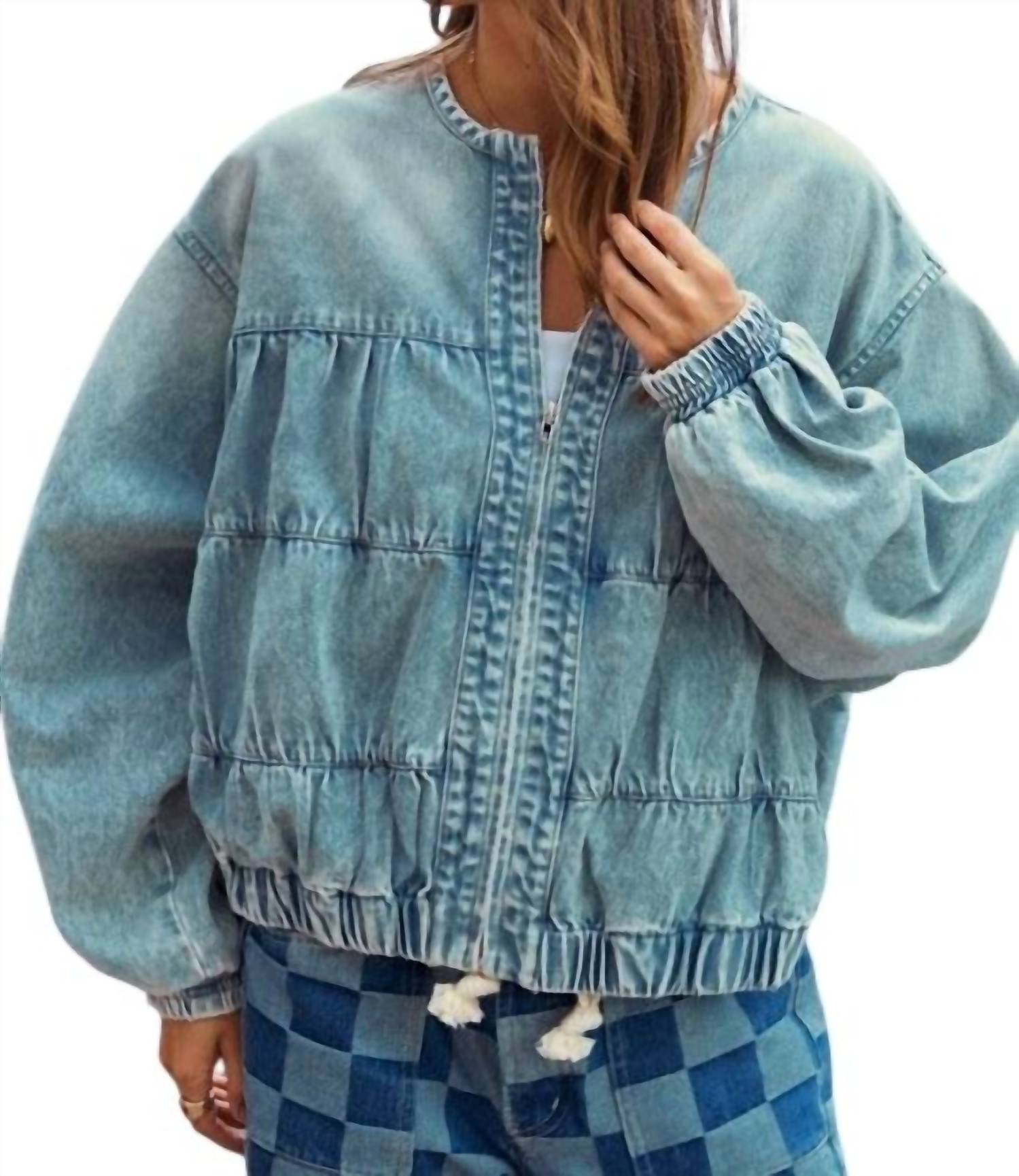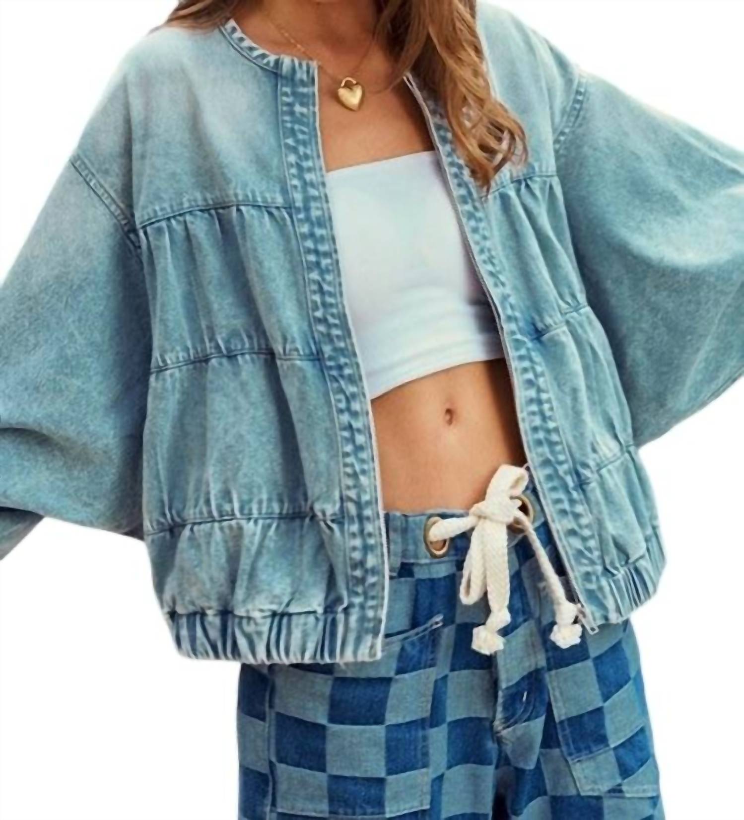 A riff on your favorite classic bomber jacket. Introducing the LovLov Washed Elasticized Oversize Full Zip Bomber Denim Jacket, a stylish staple for your fall wardrobe. With long sleeves and a solid pattern, this denim bomber is both chic and comfortable. It's finished with a zip closure for ease of wear. Care for your jacket by machine washing it as needed.