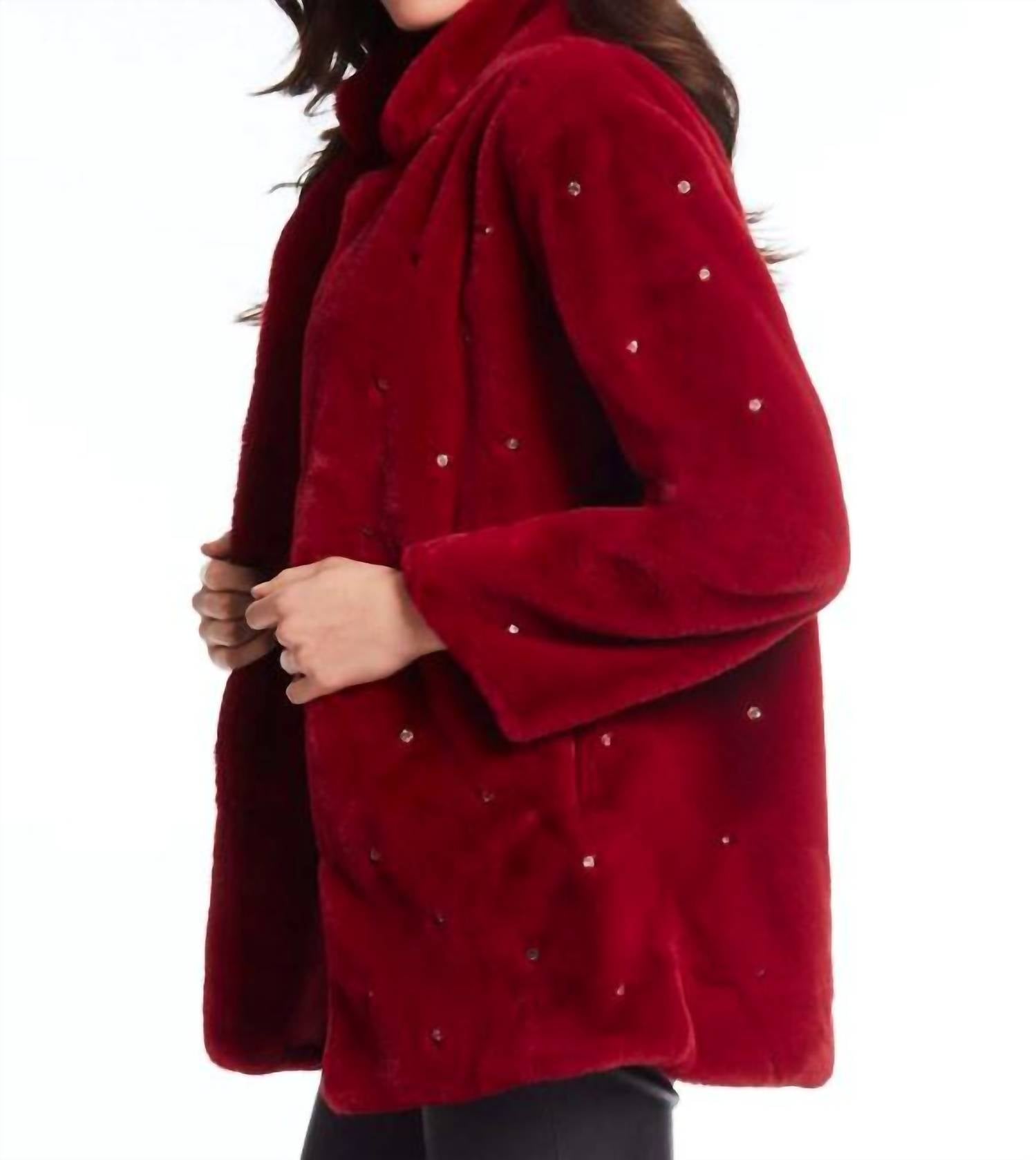 Nothing is cooler than this vintage inspired bomber jacket. Lined faux fur jacket with crystals.