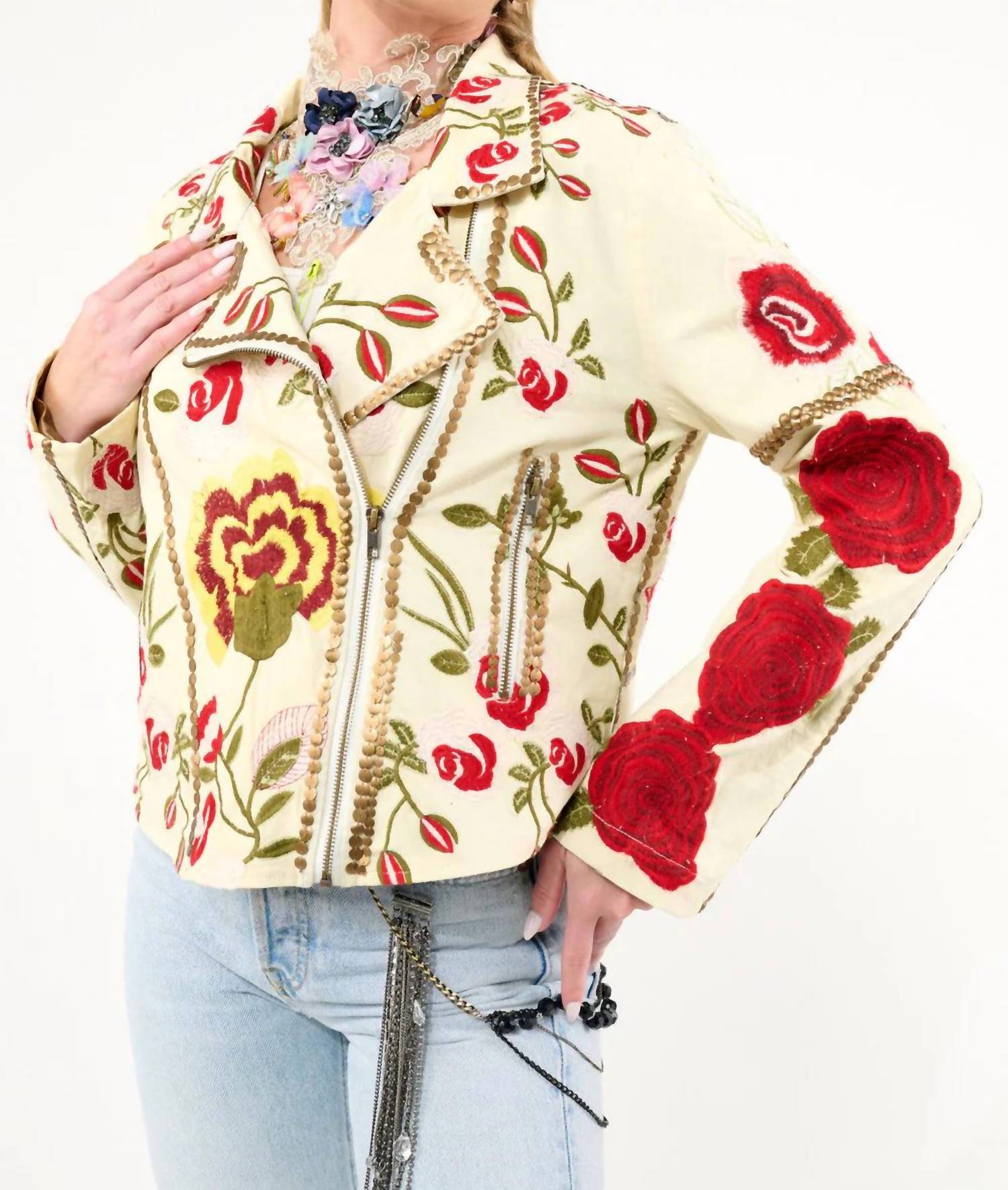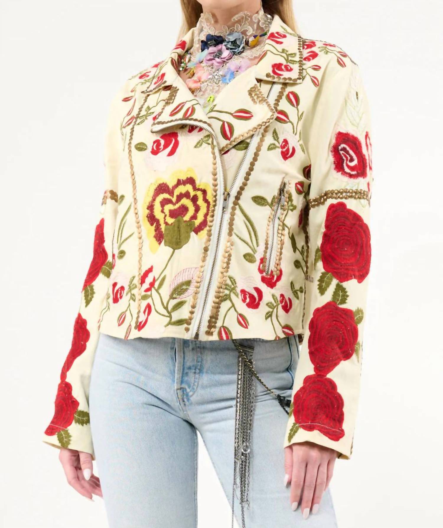 A riff on your favorite classic bomber jacket. Introducing the Carmen Rose Jacket by Aratta, a chic reinterpretation of classic denim adorned with elegant embroidered floral patterns and striking antique gold studs. This ivory motorcycle-style jacket is crafted from 100% cotton and features a sturdy zip closure, along with two functional front zip pockets for a tough yet stylish look. Designed in Los Angeles, this fully satin-lined jacket ensures both comfort and style, making it a standout piece for any casual spring wardrobe. Care: Dry clean only to maintain its vibrant details.