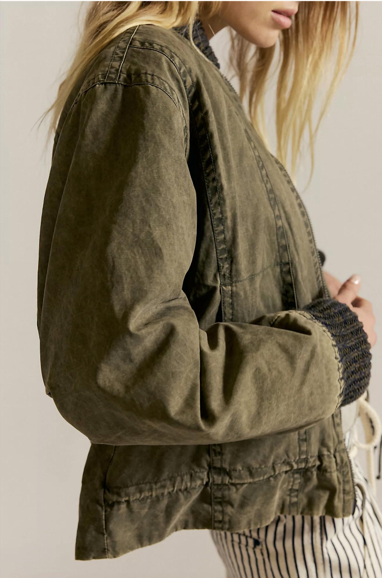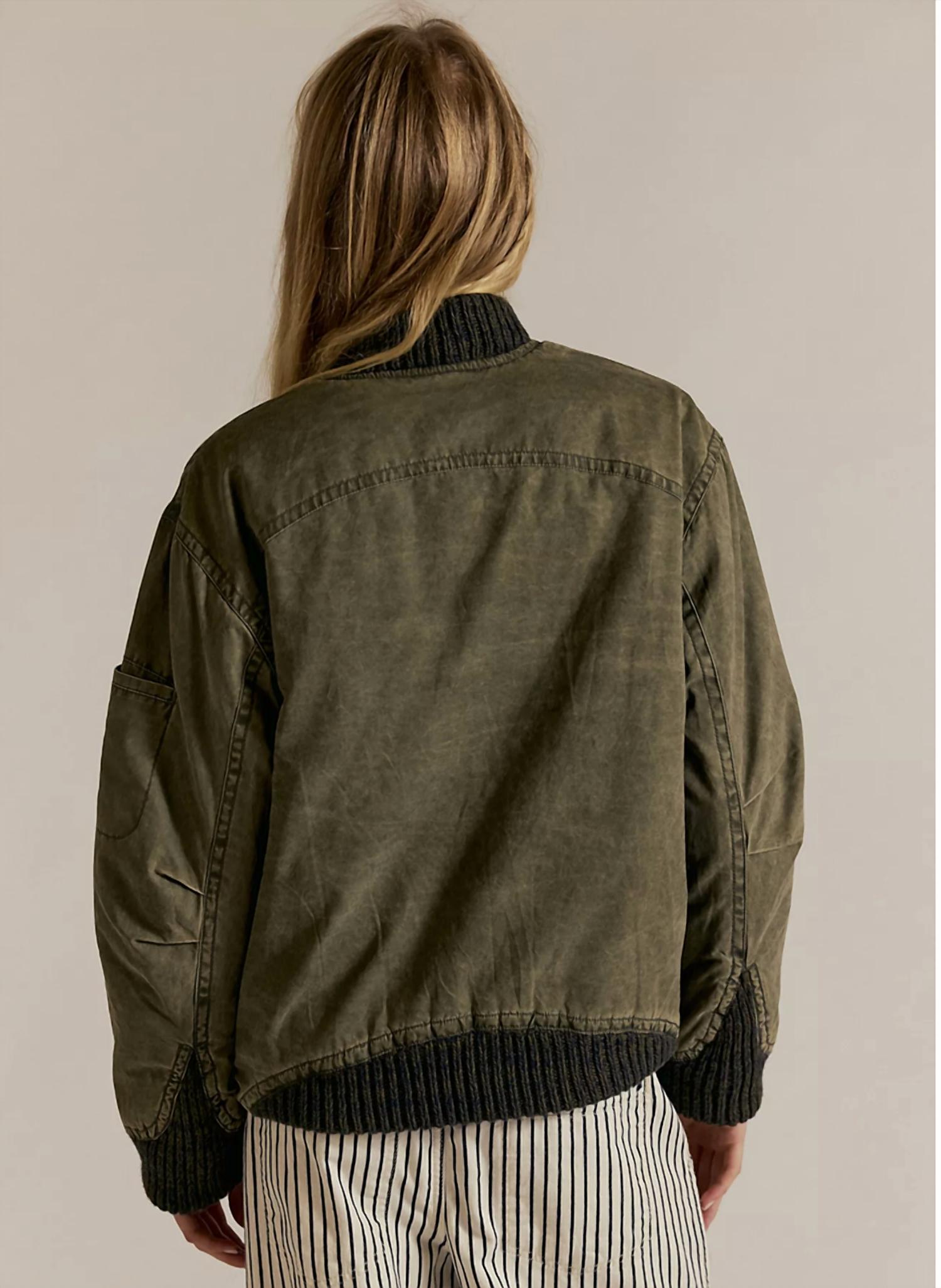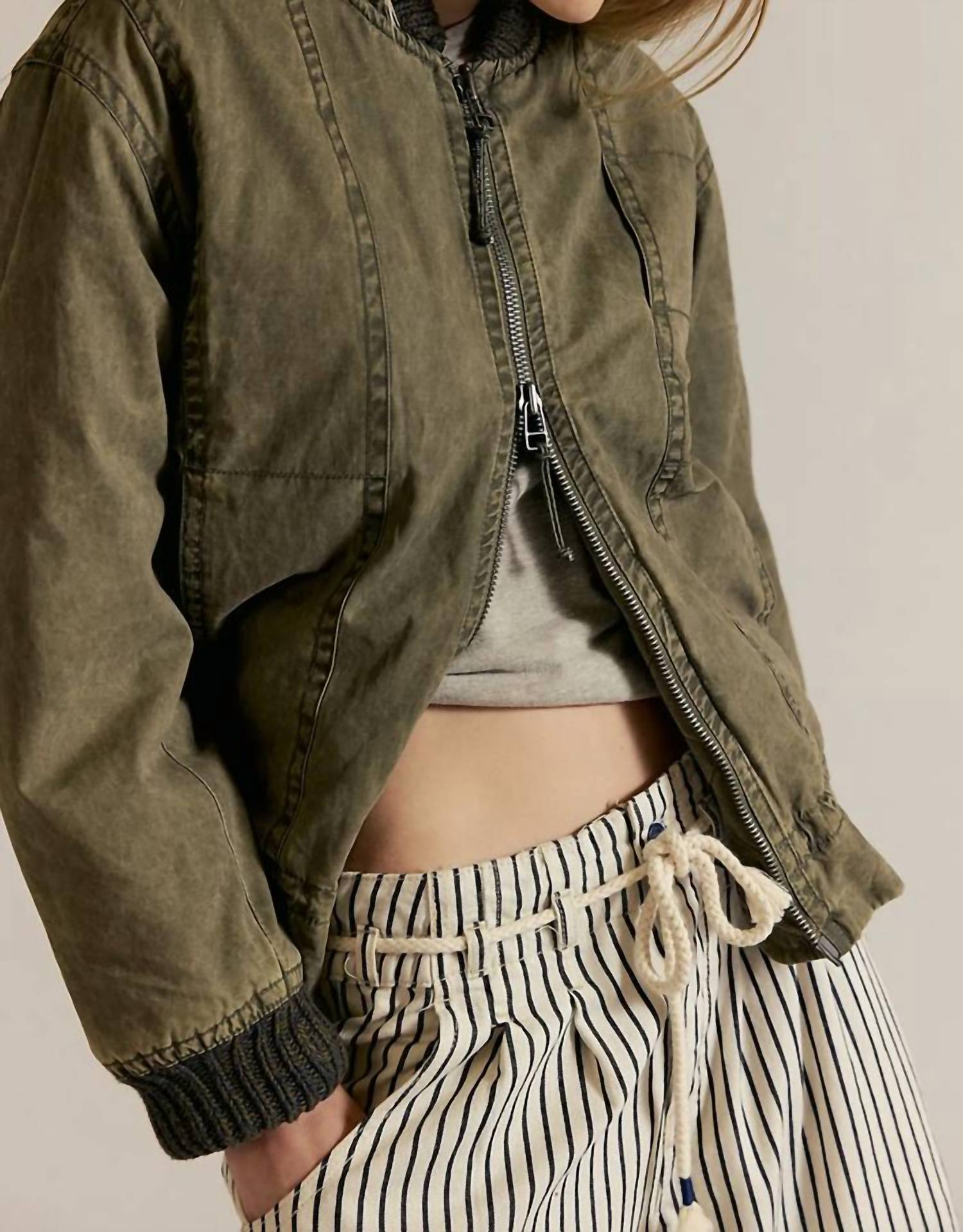 A riff on your favorite classic bomber jacket. This classic bomber jacket from We The Free is made with washed fabric and knit ribbed trims. It has a banded collar, zip-front closure, and an oversized fit. Measurements: bust 52 inches, length 26.5 inches, sleeve length 24 inches. Made of 51% polyester, 39% cotton, and 10% nylon.