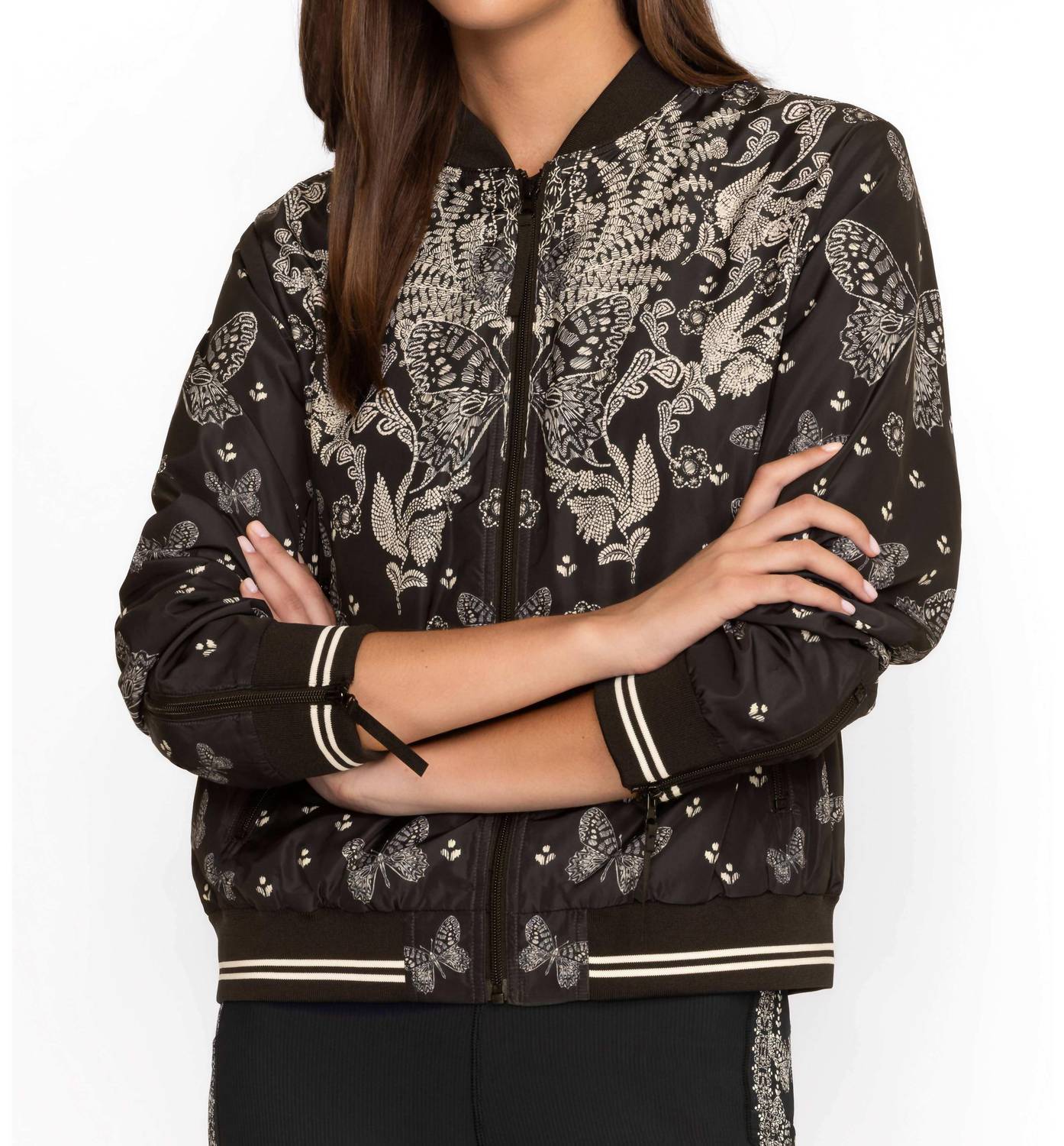 A riff on your favorite classic bomber jacket. Introducing the Johnny Was Bee Active Drop Shoulder Bomber Jacket in a striking patterned Farfalla design. This women's bomber jacket features long sleeves and a standing collar, complemented by a relaxed fit that enhances comfort and style. Crafted without pockets, this jacket offers a zip closure for easy wear. Ideal for spring streetwear, it is perfect for a dinner party or a run on a cool day.