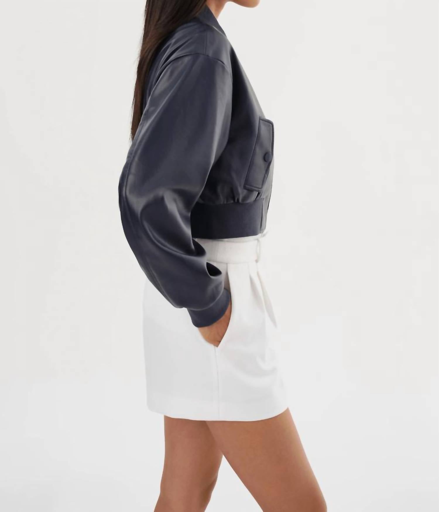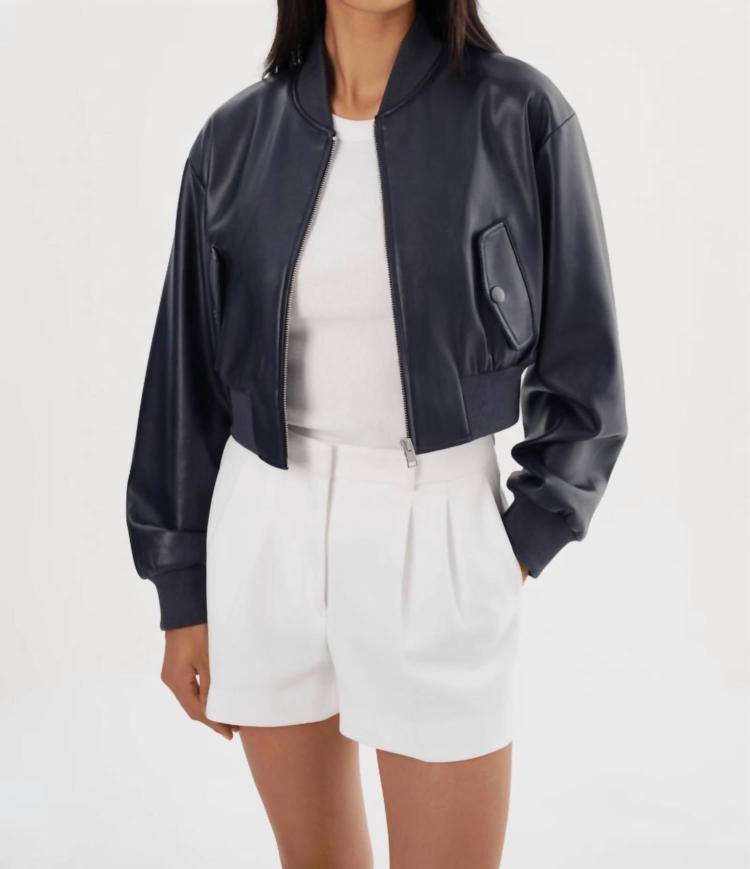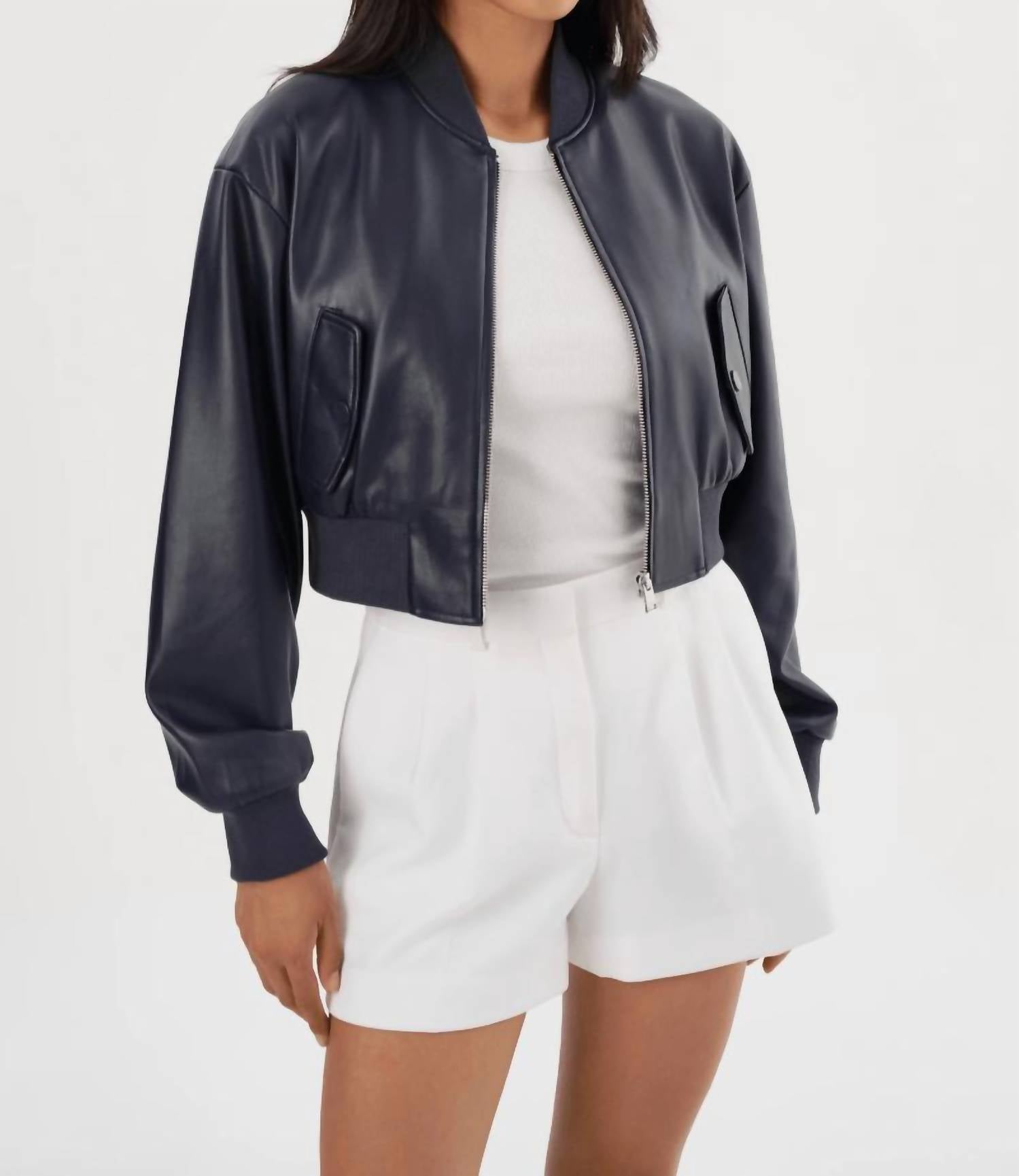 A riff on your favorite classic bomber jacket. Introducing the Evelin Faux Cropped Bomber by LAMARQUE, a chic navy bomber jacket that combines minimalist style with functionality. This long sleeve piece is crafted from high-quality polyurethane and features a zip closure for a sleek finish. Ideal for fall travel, this solid-patterned jacket includes practical pockets and a classic collar neckline. Care for this timeless piece with dry clean only instructions.