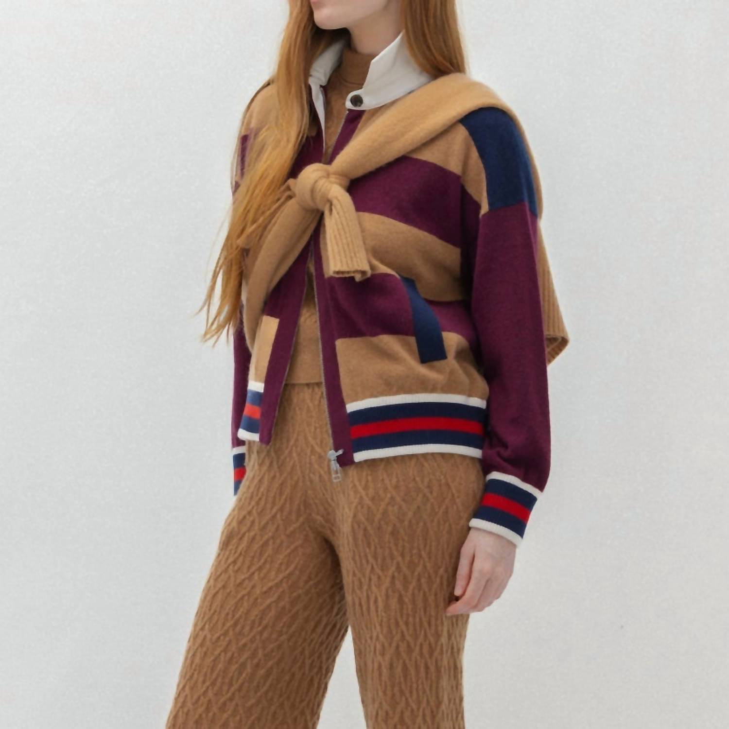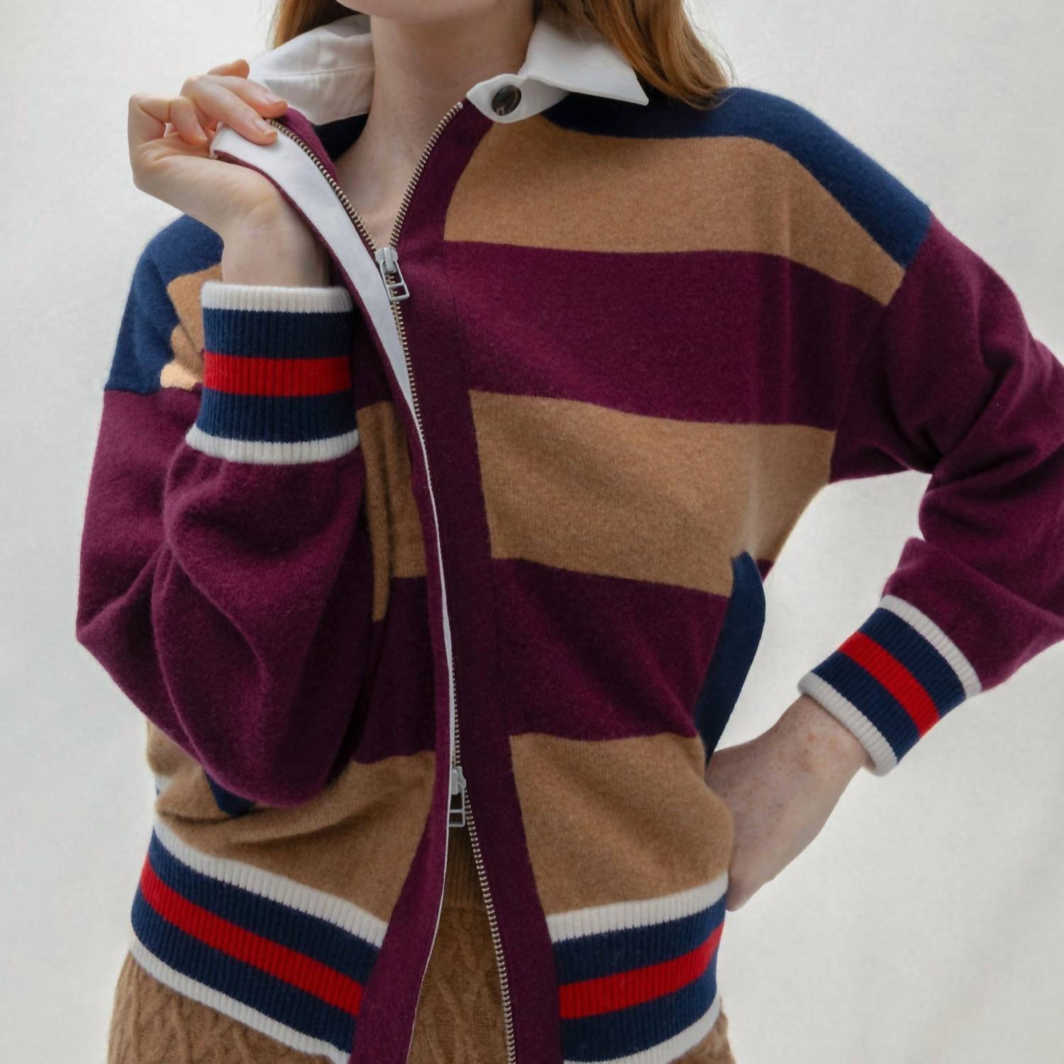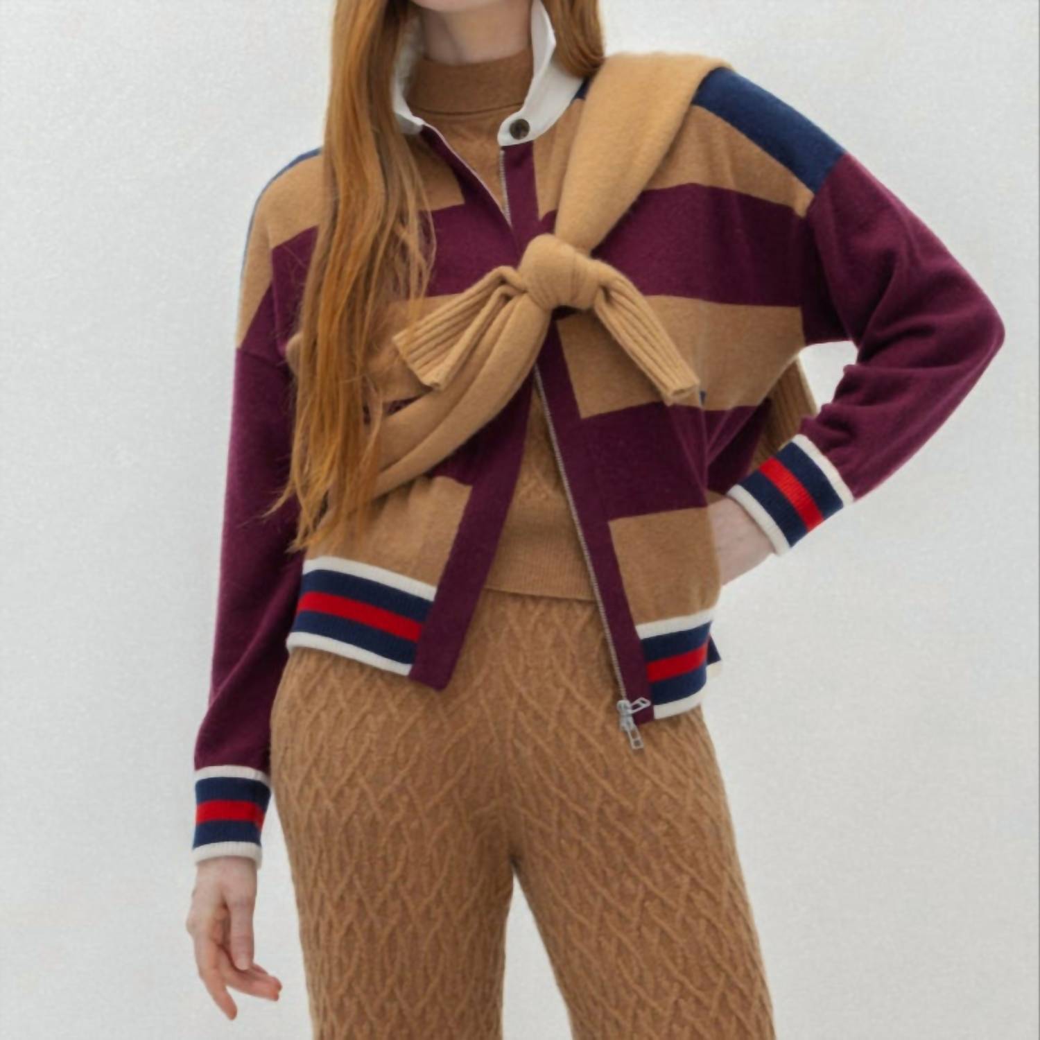 Nothing is cooler than this vintage inspired bomber jacket. Experience the Rugby Bomber Jacket by Naked Cashmere, a chic fusion of sporty and sophisticated in striped Haystack. Crafted from luxurious 100% cashmere in a 12-gauge knit, this long-sleeve bomber offers a comfortable fit with a slightly boxy silhouette, perfect for layering. It features a classic cotton polo collar and a zip closure for easy wear. Designed with a length of 22.75 inches, hitting at the hip, this piece exudes a refined yet laid-back vibe ideal for vacation or streetwear styles. Model is wearing size small, standing at 5'7" with measurements: bust 34.5, waist 25, hips 36.5.