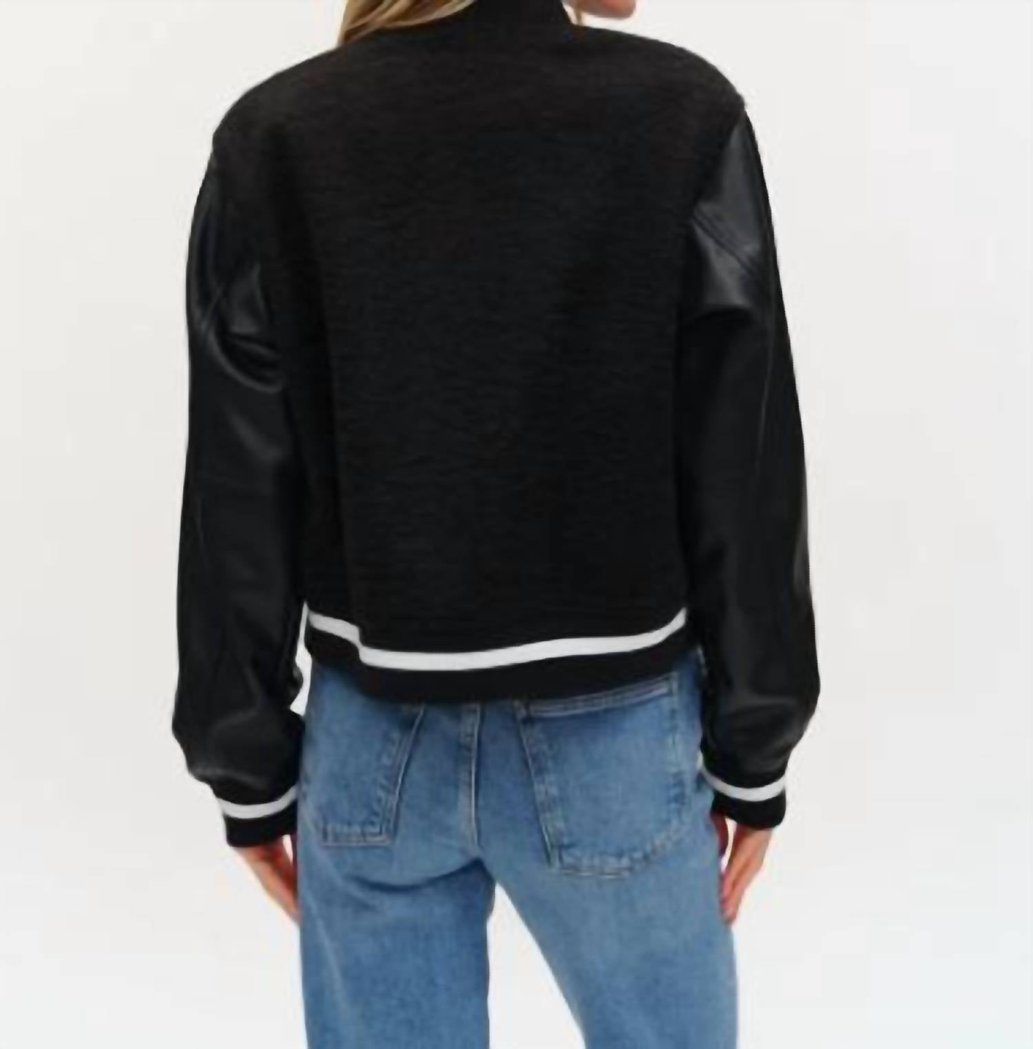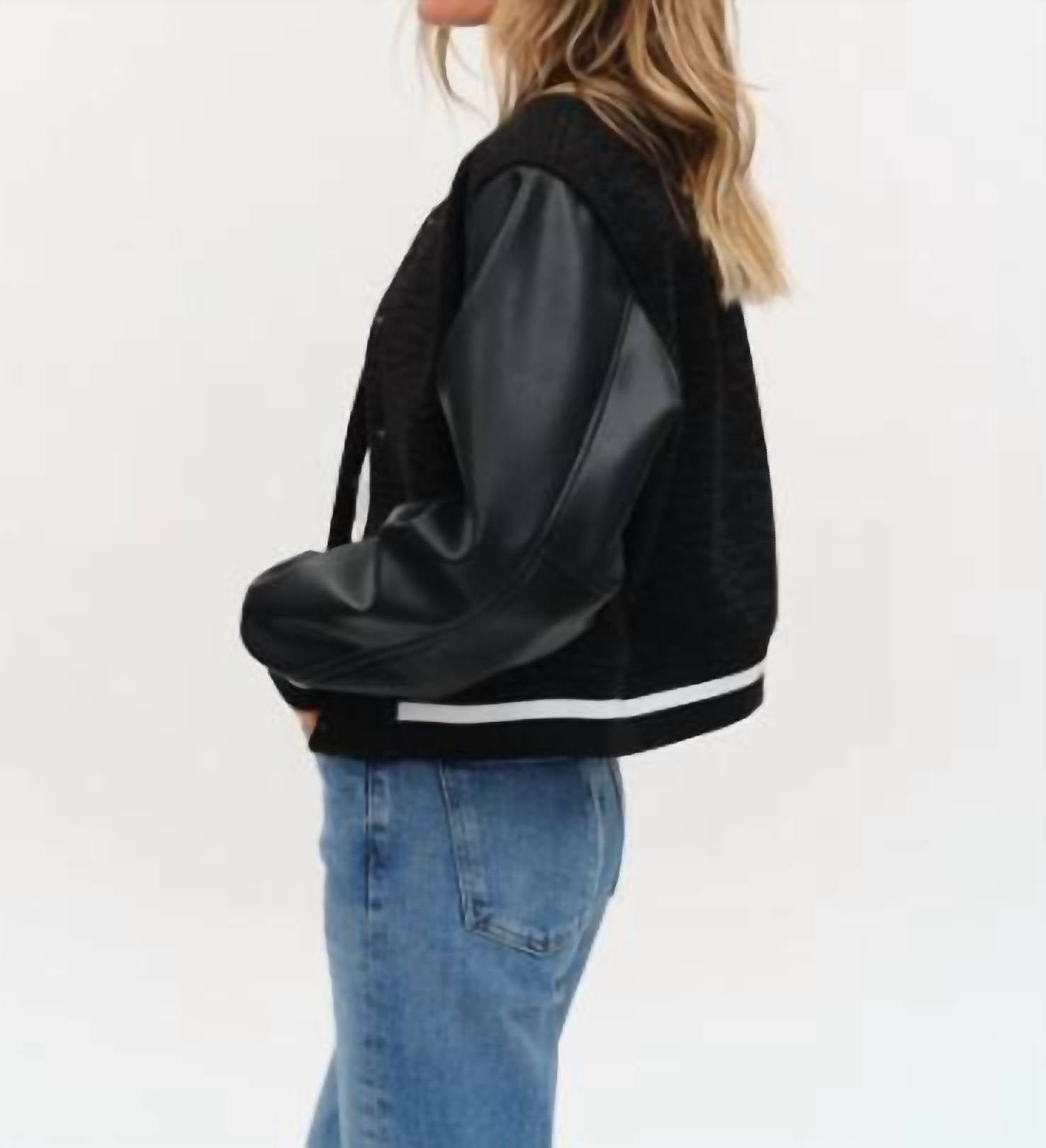 Nothing is cooler than this vintage inspired bomber jacket. Introducing the York Shearling Bomber by SIX/FIFTY, a striking fusion of classic design and modern flair. This long-sleeve jacket features a matted sherpa body with sleek pleather sleeves, crafted from 100% polyester and 50% PU, 50% polyester blend. The bomber includes a snap closure and faux pockets for a sleek finish. Ideal for fall outings, its ribbed cuffs, hem, and collar ensure comfort and style. Model is wearing a size small.