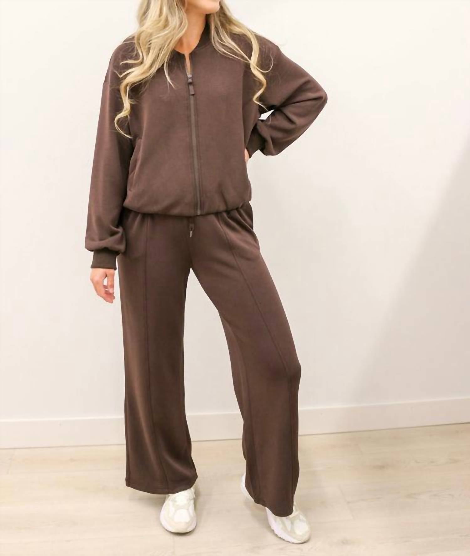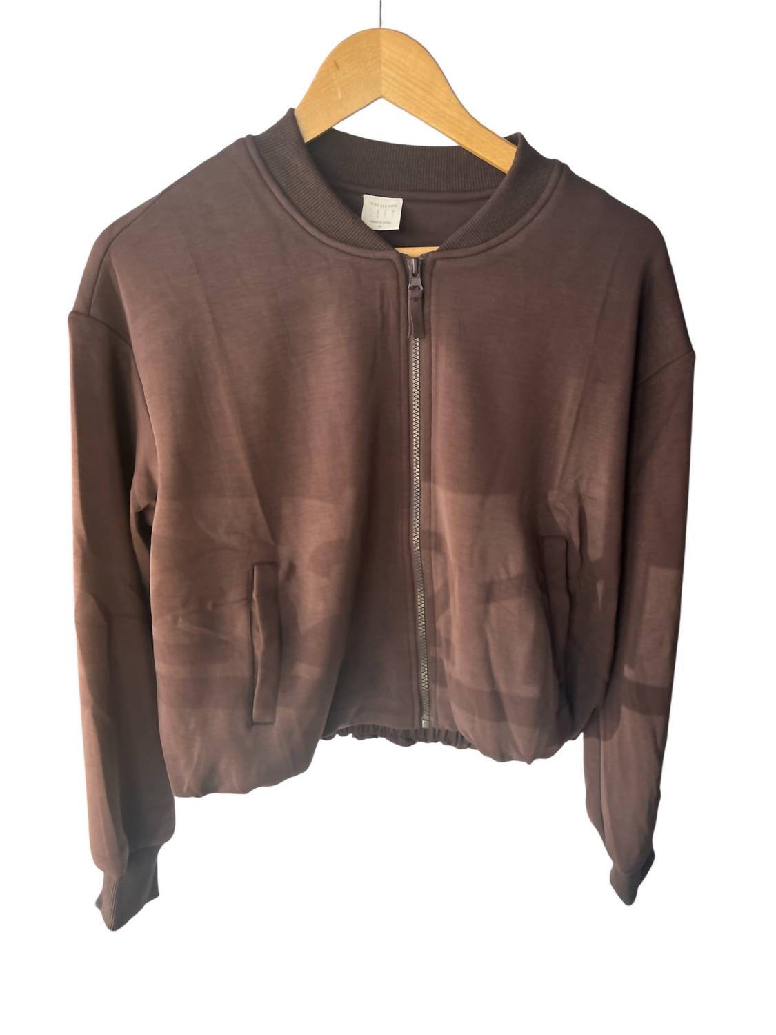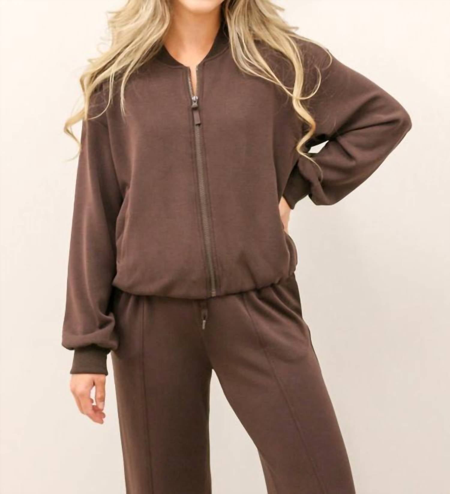 A riff on your favorite classic bomber jacket. Introducing the Skies are Blue Espresso Soft Modal Bomber Jacket, designed to elevate your casual style with its classic bomber silhouette. This women's jacket features long sleeves, and is crafted from a luxurious blend of 48% polyester, 46% modal, and 6% spandex for a buttery-soft, lightweight feel. It boasts a full zip closure, convenient side pockets, and hits at the waist. Care instructions: Machine wash cold delicate, lay flat to dry. Perfect for the minimalist trend and effortlessly stylish for fall occasions.