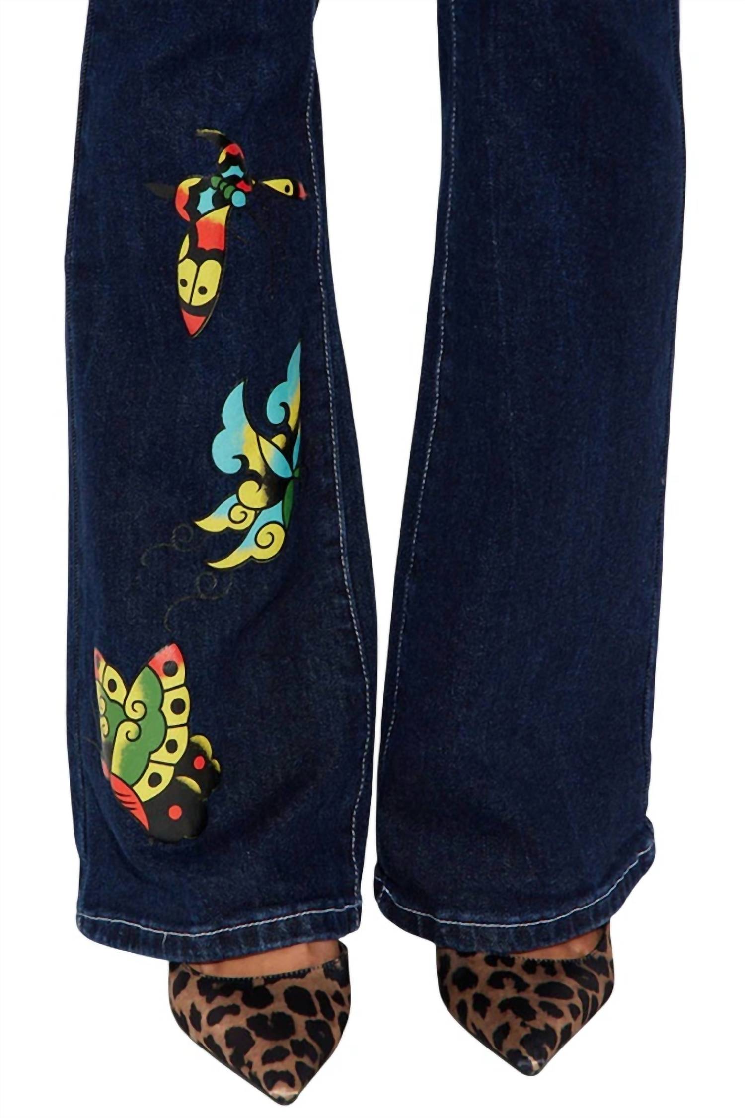A boot-cut jean that not only looks good on, you'll be comfortable in them all day. Introducing the Ed Hardy Butterflies Bootcut Jeans, an iconic streetwear staple in Y2K Medium. These jeans feature a classic bootcut silhouette and a standout butterflies graphic, complete with a signature Ed Hardy logo on the back. Crafted from a cotton blend of 68% Cotton, 25% Polyester, 6% Rayon, and 1% Spandex, they offer a regular fit with a mid-rise waist and a 32-inch inseam. Closure: Zip closure. Care: Hand wash and line dry for lasting quality.