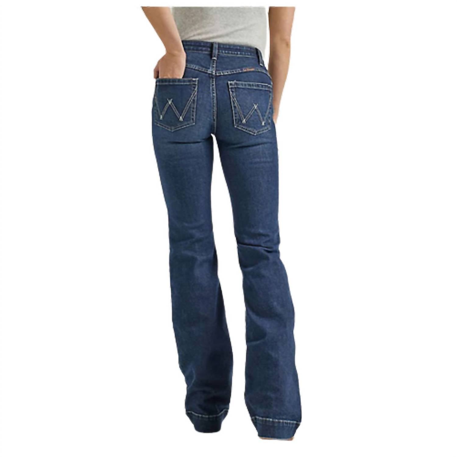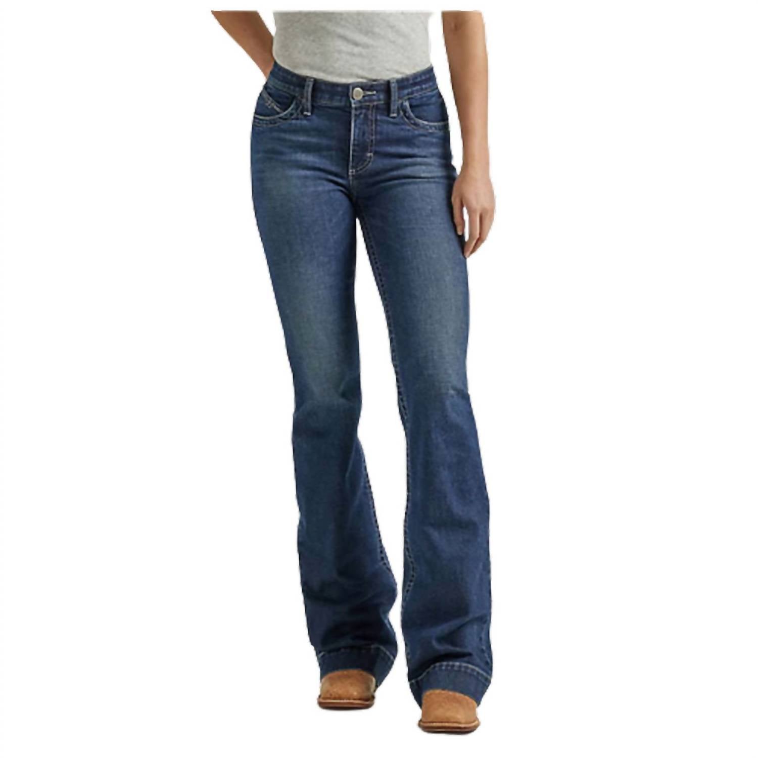 Just add boots! The Wrangler Women's Ultimate Riding Willow Mid Rise Trouser Jean in Ellory is designed for unrestricted movement and a flattering fit. This dark wash jean features a mid rise, is higher in the back, ensuring comfort and coverage, and has a fitted seat and thigh with a bootcut leg. Made from a cotton blend of 99% cotton and 1% spandex, this jean secures with a zip-fly and button closure. With a textured pattern and practical pockets, this regular fit jean effortlessly combines style and function.