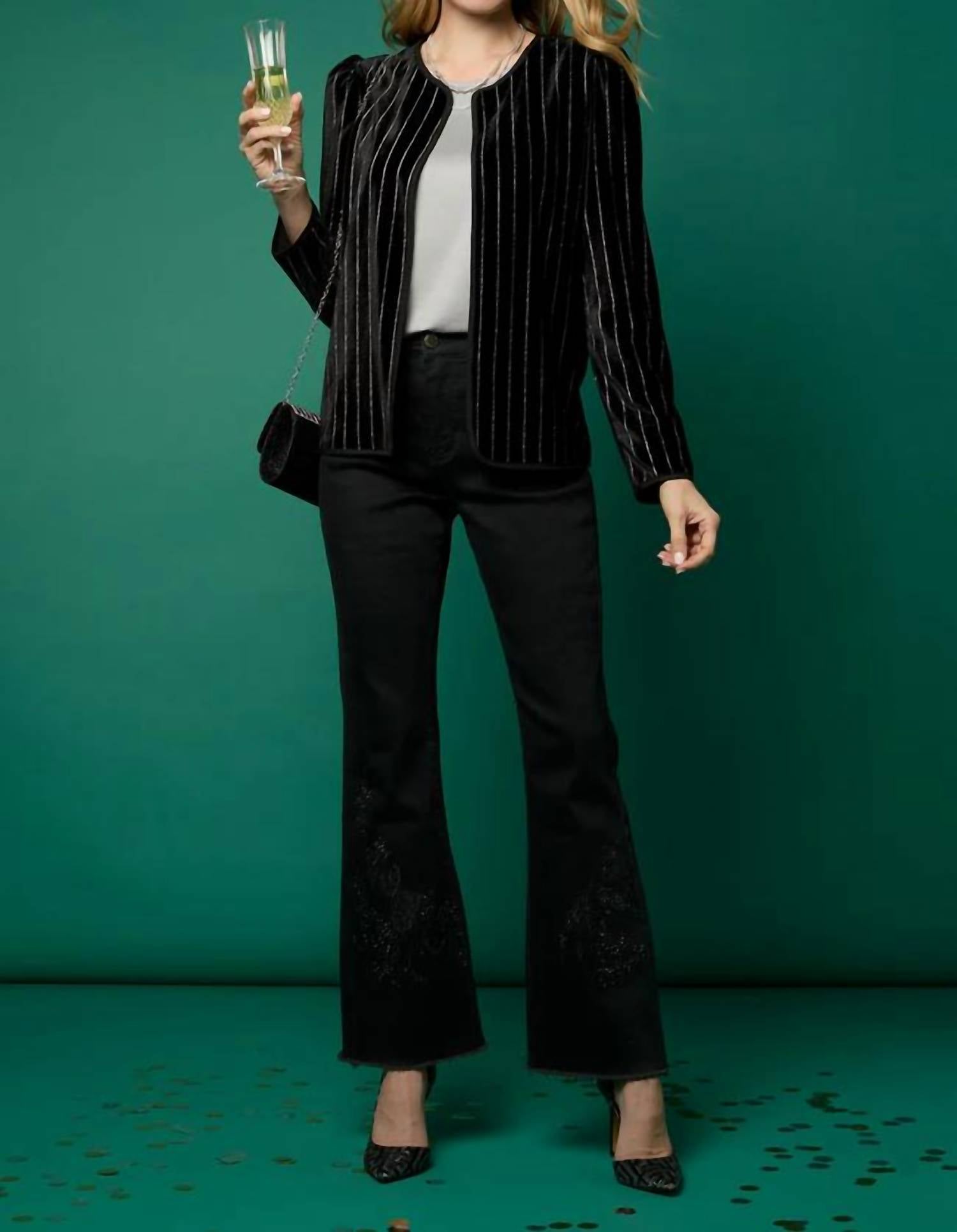 A boot-cut jean that not only looks good on, you'll be comfortable in them all day. Experience ultimate comfort and style with the EverStretch Baby Bootcut Jeans by COCO + CARMEN in an elegant Black shade. These women's jeans feature a relaxed fit with a flared leg and high waist rise, boasting a 30-inch inseam. Made from a cotton, polyester, viscose, and spandex blend, they promise flexibility and softness. With machine wash care instructions, these jeans feature a patterned design and are perfect for a casual Spring dinner party or a chic New Year's Eve.