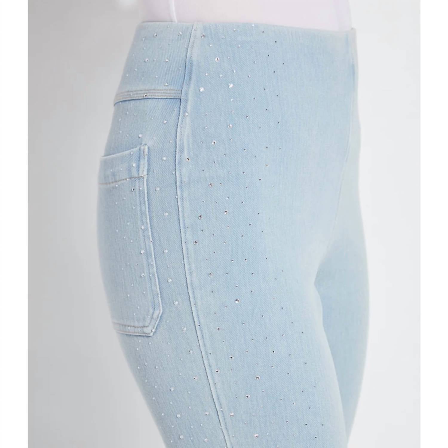 If you're looking for boot-cut, this is the jean for you. Step into effortless elegance with the Lysse Crystal Embellished Ankle Babyboot. Designed with a flattering 27-inch inseam, this chic denim pant seamlessly blends comfort and sophistication. The subtle crystal embellishments add a touch of sparkle, making these perfect for both everyday wear and special occasions. Crafted from premium stretch fabric, these babyboot pants provide a sleek, sculpting fit while ensuring all-day comfort. Whether paired with heels for a night out or styled casually with sneakers, they bring an undeniable confidence and shine to your wardrobe. Color- Tinted blue. Pull-on. Lyssé concealed patented 360° smoothing waistband. 4-way stretch. 27 inch inseam. Crystals along sides. Skims waist, hip and thigh, bootcut hem. Fabric - Knit Denim: 95% Cotton.5% Elastane. Care - Machine wash delicate cycle, cold, separately and inside out. Do not bleach. Line dry.